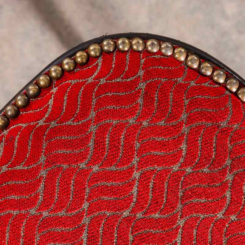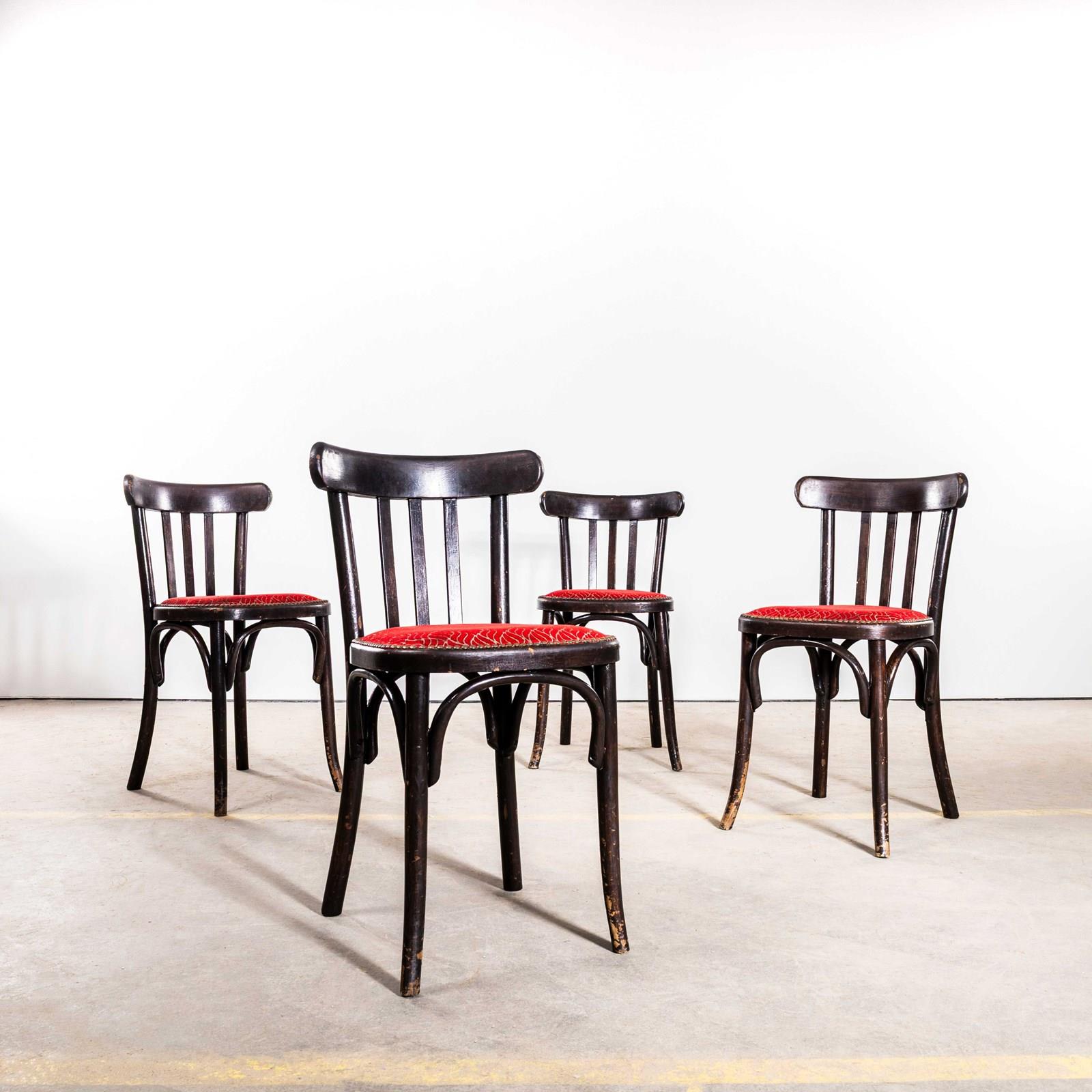 The process of steam bending beech to create elegant chairs was discovered and developed by Thonet, but when its patents expired in 1869 many companies including Luterma launched production. Luterma was one of the brands marketed by Estonian factory A.M. Luther which was founded in the late 19th Century in Tallinn. Luthers production was principally in Estonia but they also had factories in France for local market production. At the time of the Bauhaus movement Walter Gropius and Marcel Breuer worked with the factory to develop various models. These chairs date from the 1950s, a simple classic bistro shape with a beautiful ebonised colour and defined backs. The chairs retain their original graphic upholstery beautifully done with button tacks. We service and rejuvenate each chair before it leaves our workshop and we deliver chairs of excellent quality. The chairs are not stamped Luterma but we have seen many of the same model stamped, so we are fairly confident. Seat Height: 48cm