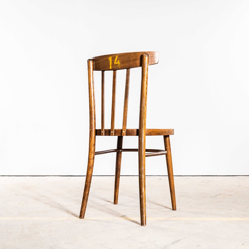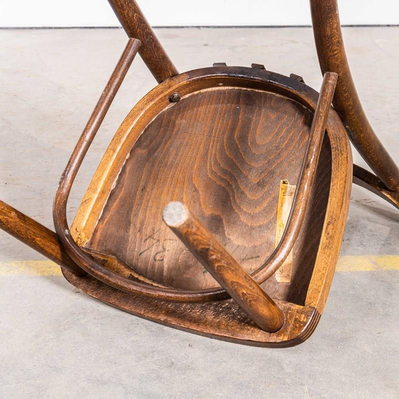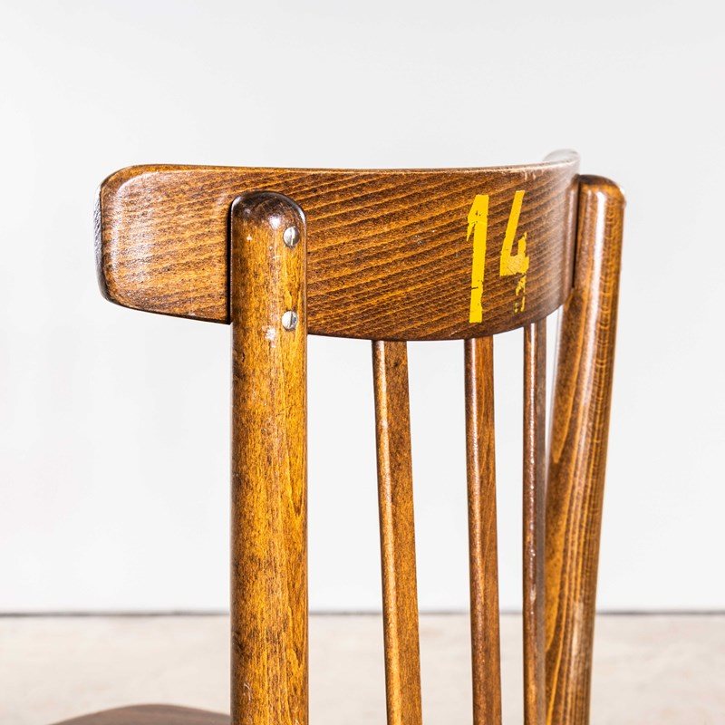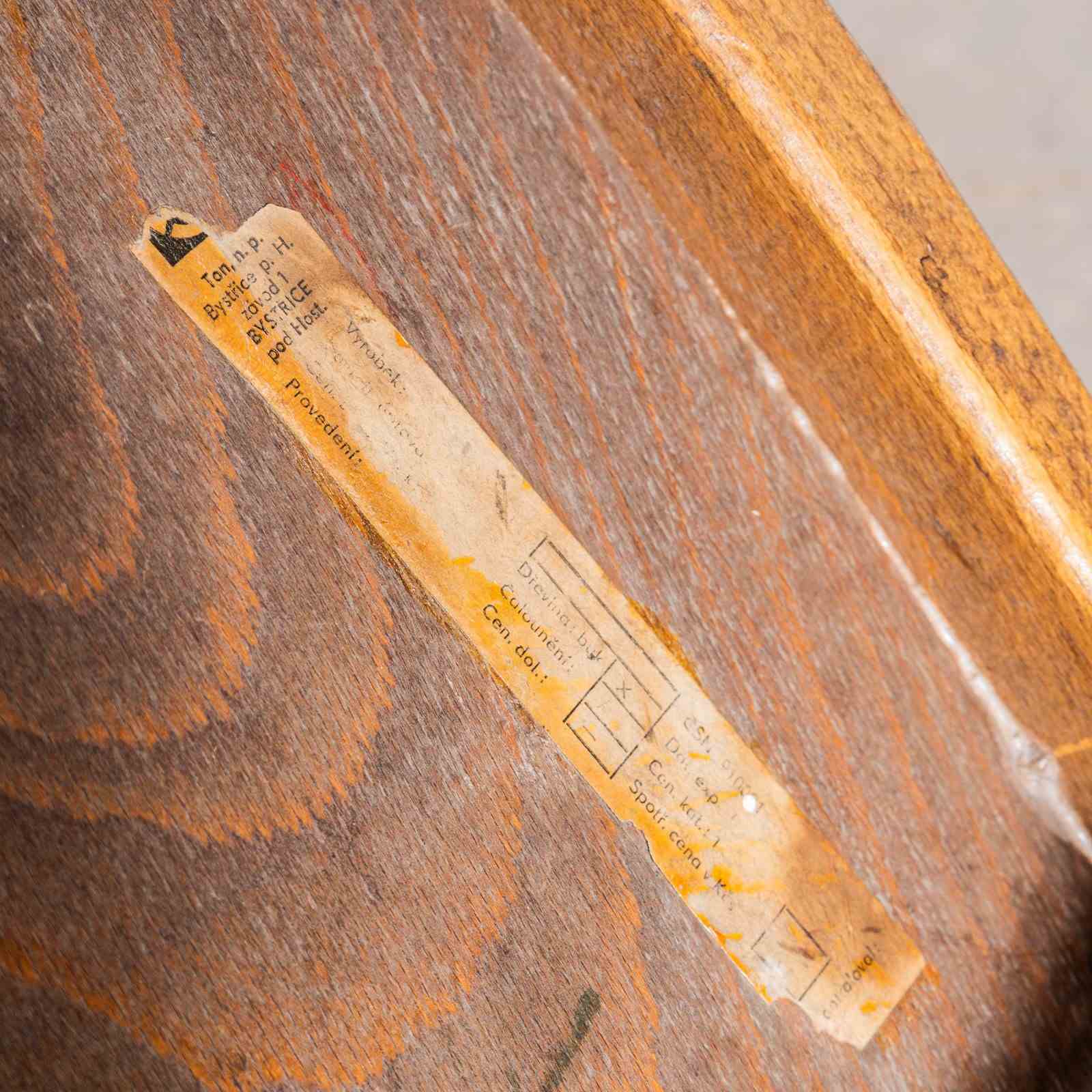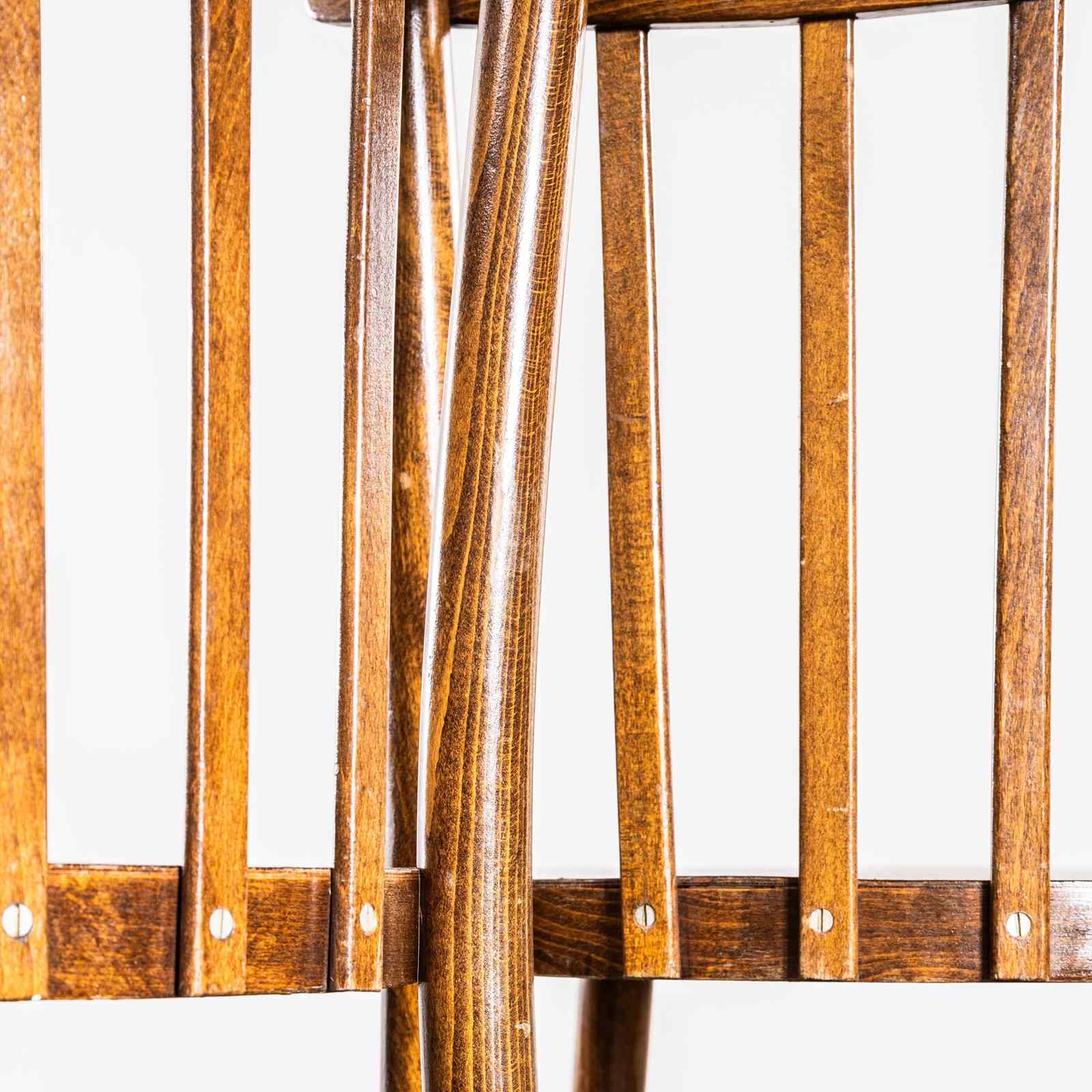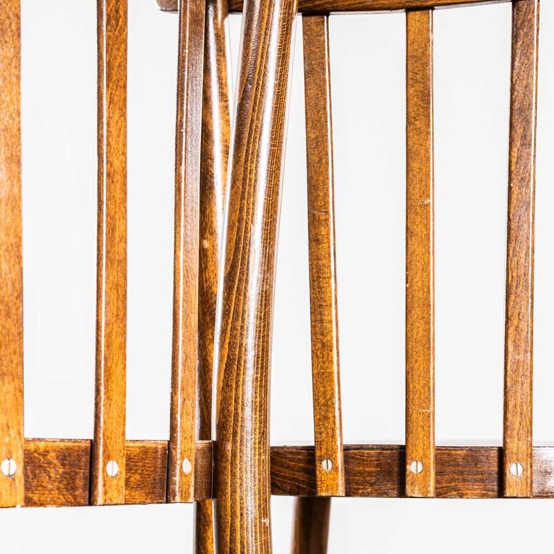 High quality good scale dining chairs produced by the famous Czech firm Ton, still trading today and producing beautiful chairs. We have gently restored the frame but kept the original character and patina which is what this chair is all about. A strong sturdy chair of good scale with comfortable tall backs and curved support crescent shaped backs. We service each chair individually before it leaves our workshop and we deliver chairs of excellent quality. Seat height 46cm.
