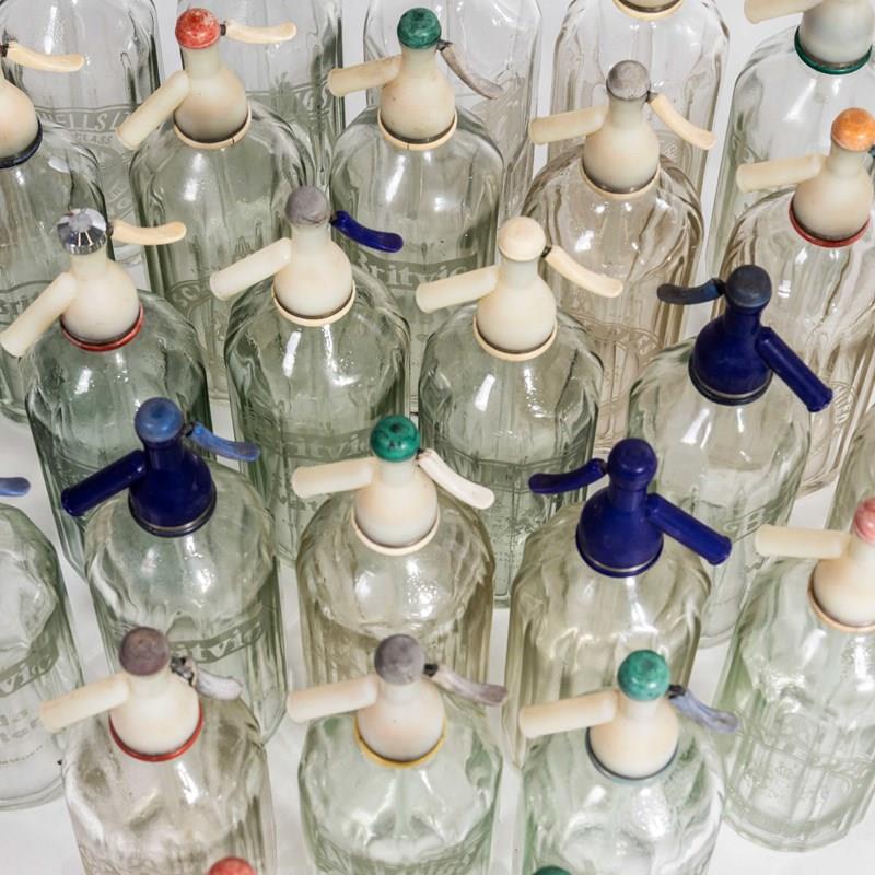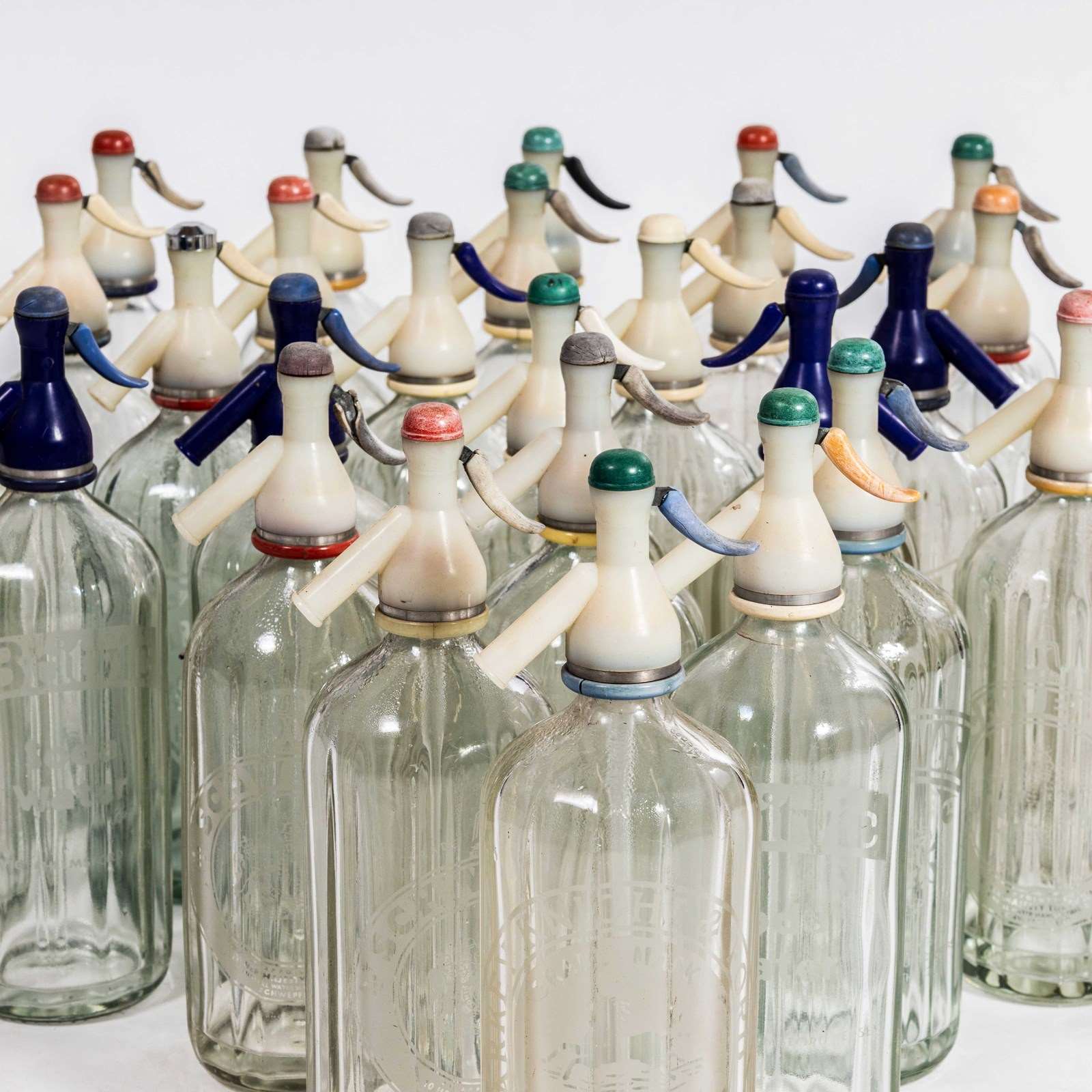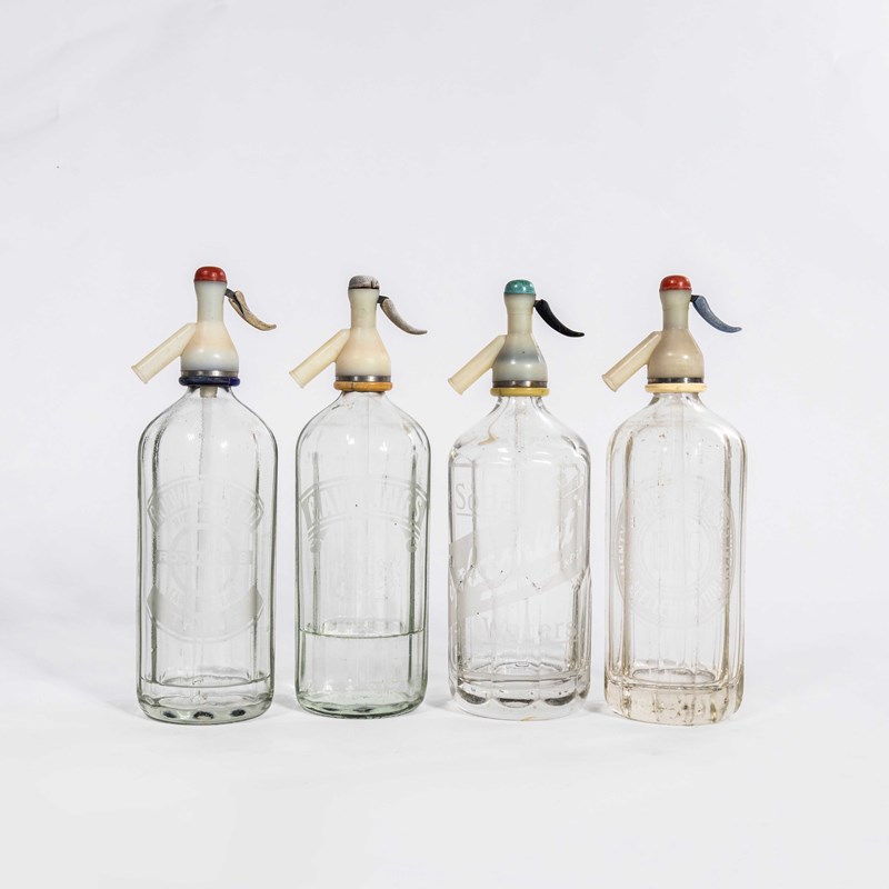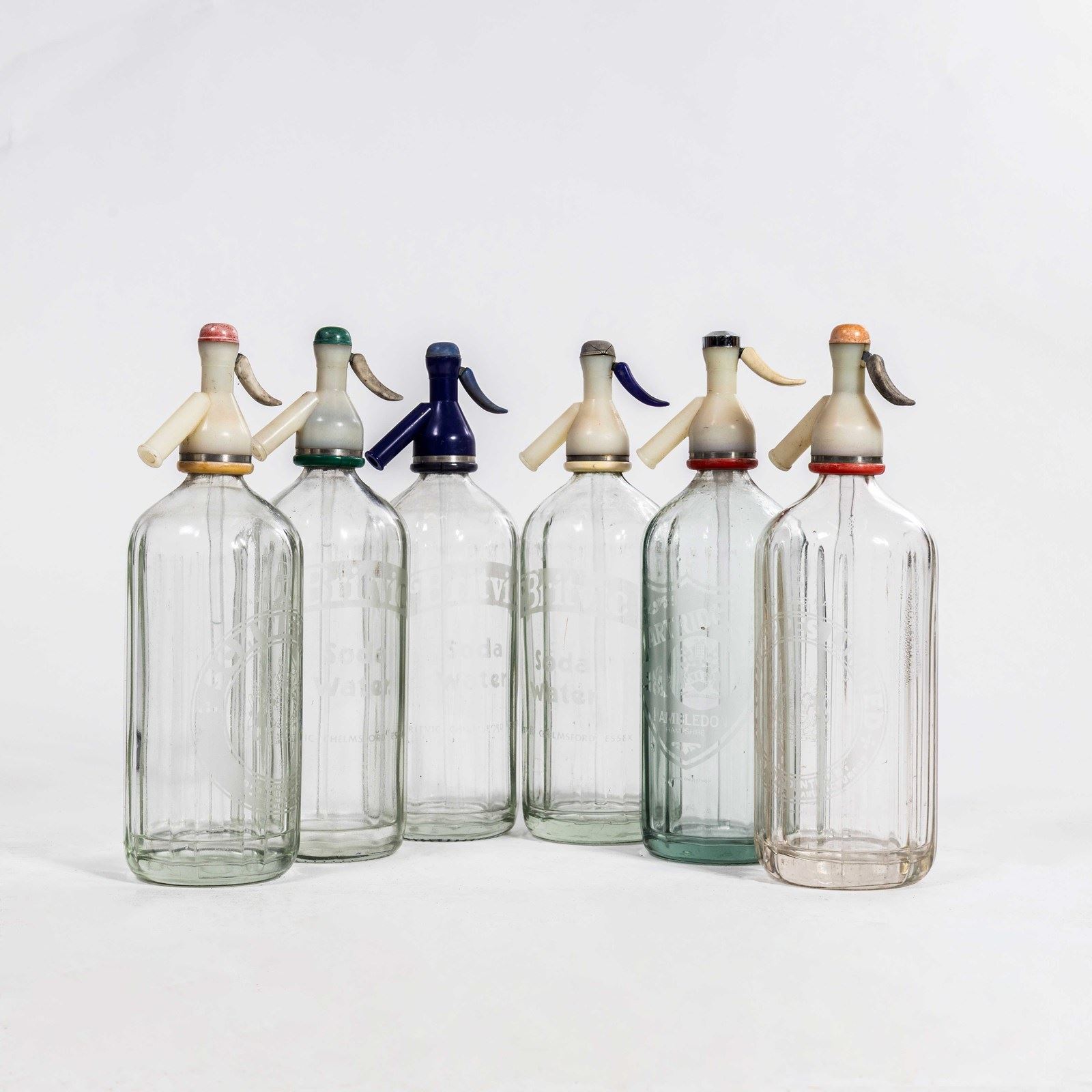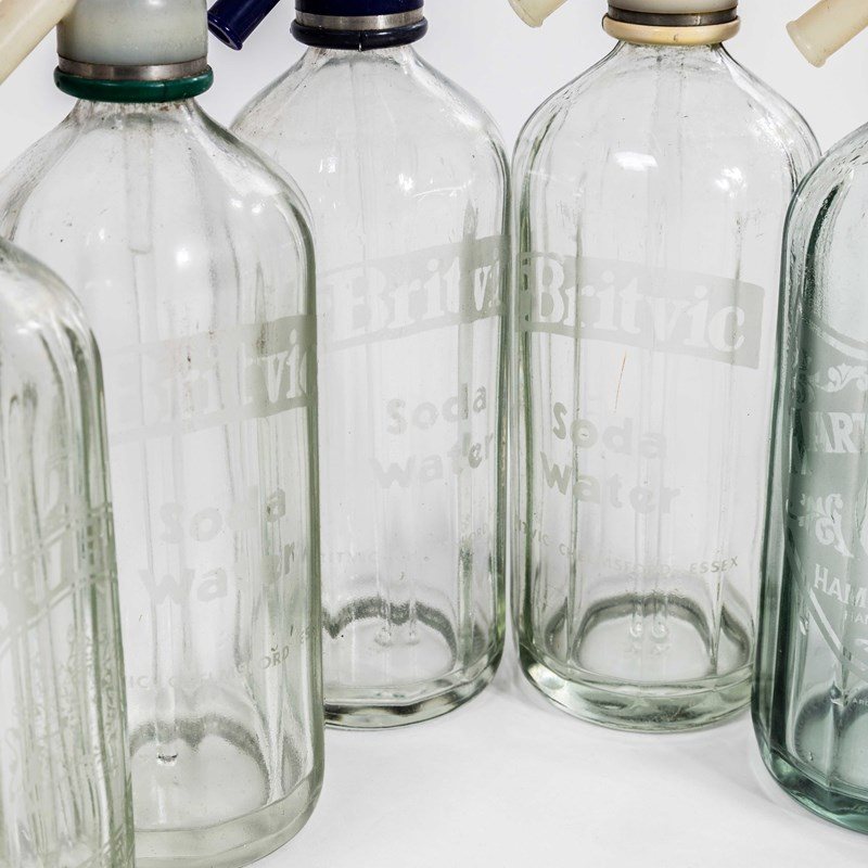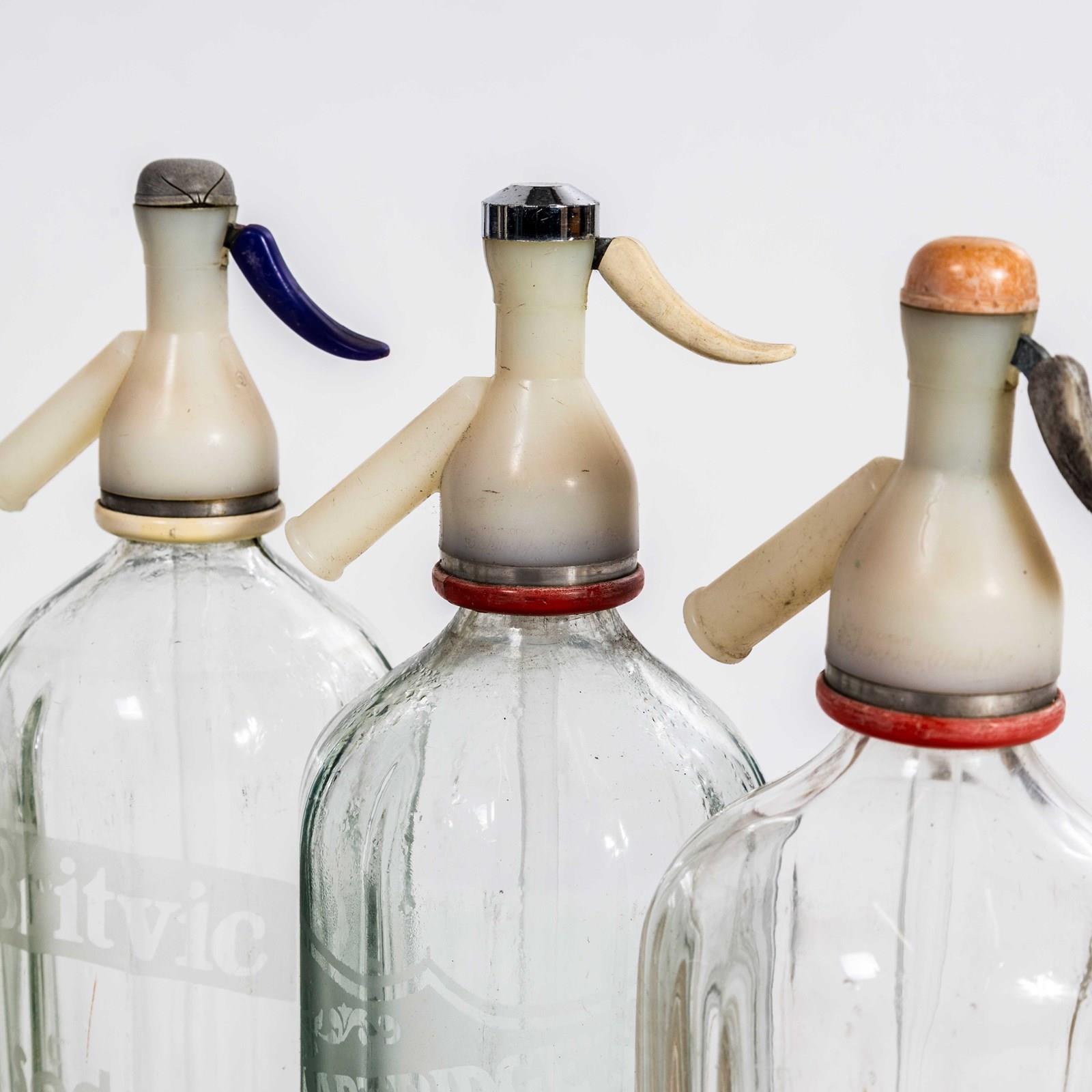 Original English Siphons with etched glass detail showing various assorted producers. Exceptional quality and graphics sold as a decorative item. Listing is for one siphon, random selection.