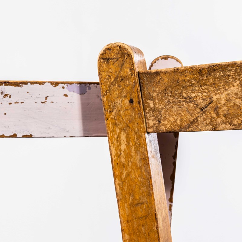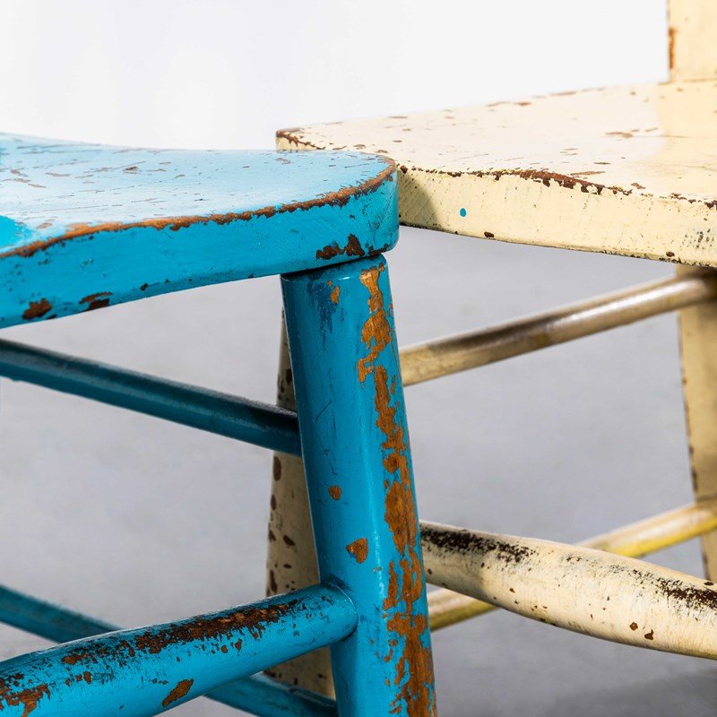 England has a wonderfully rich heritage for making chairs. At the height of production at the turn of the last century over 4500 chairs were being produced daily in the villages around High Wycombe. Each chair was hand made typically in Oak or Elm. Sadly Churches find non stacking chairs take up too much space so they find their way to us to for a second rich life. Handmade in elm and ash they are wonderful examples of a classic Church chair with a heavy solid weight and an elegant single bar back. These chairs have been hand painted somewhere along their journey, we love them as they are. We service and wax each chair individually before they leave our workshop to deliver chairs of excellent quality.