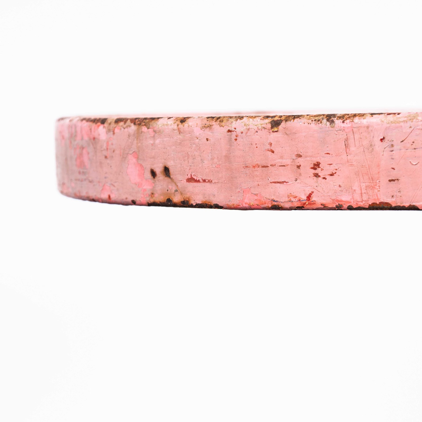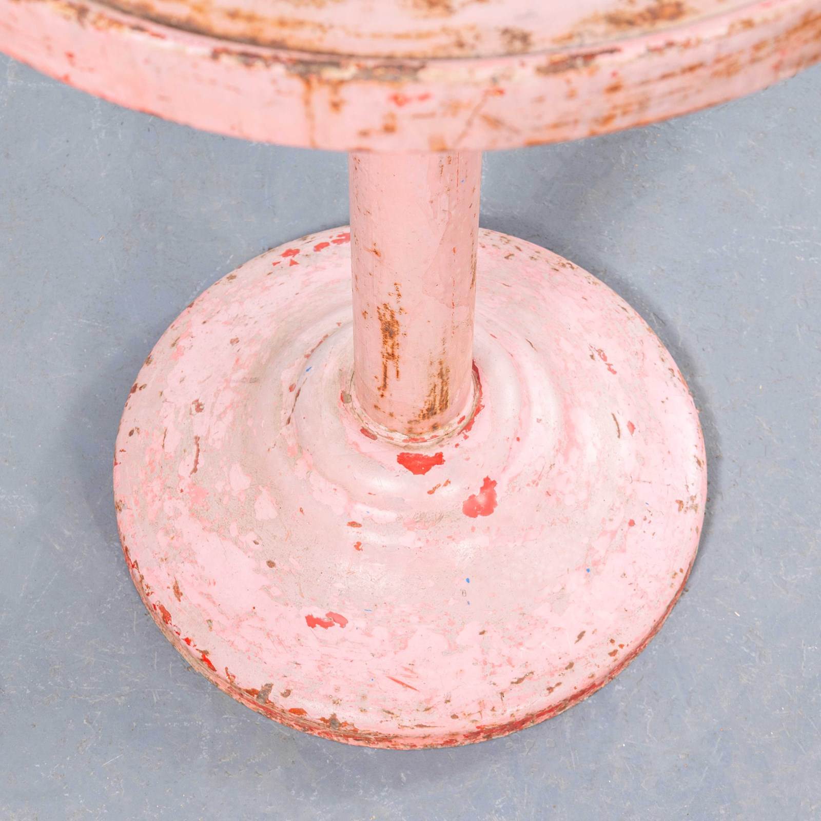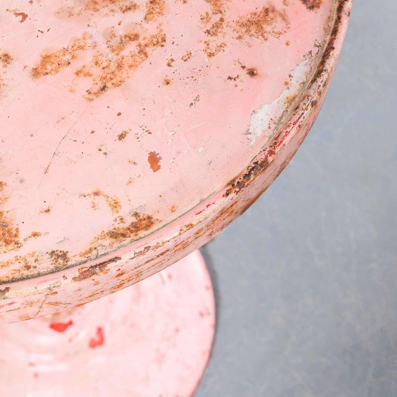 Tolix is one of our all time favourite companies. In 1907 Frenchman Xavier Pauchard discovered that he could protect sheet metal from rusting by dipping it in molten zinc (galvanisation) and a few years later he set up his factory producing steel furniture. Tolix was the creator and founder of perhaps the most iconic café chair of all time, the Tolix model A, designed in 1934. Tolix used their metal working skill to also produce exquisitely designed but practical café/dining tables to partner their chairs. This small round table design is one of our favourites, in the original colour tone the table has been repainted several times giving the most exceptional character. Made of spun and pressed steel it is strong and stable, our workshop has cleaned the table that is all. Knee Clearance: 65cm