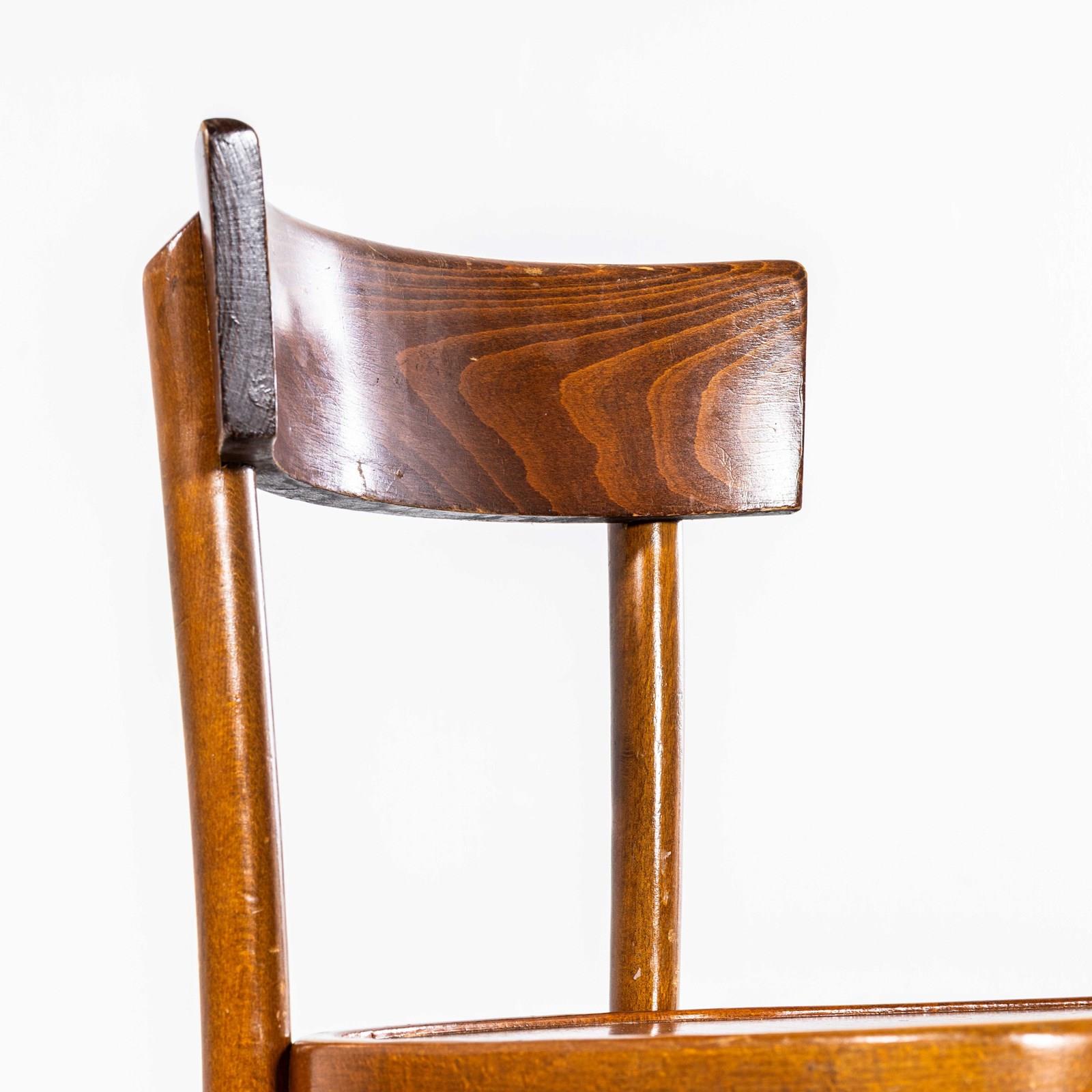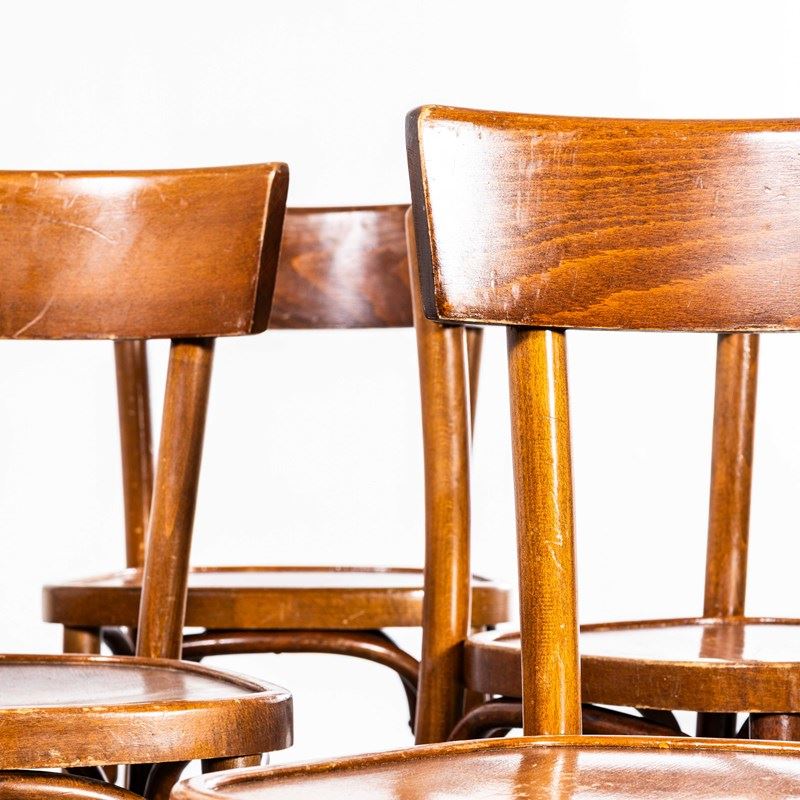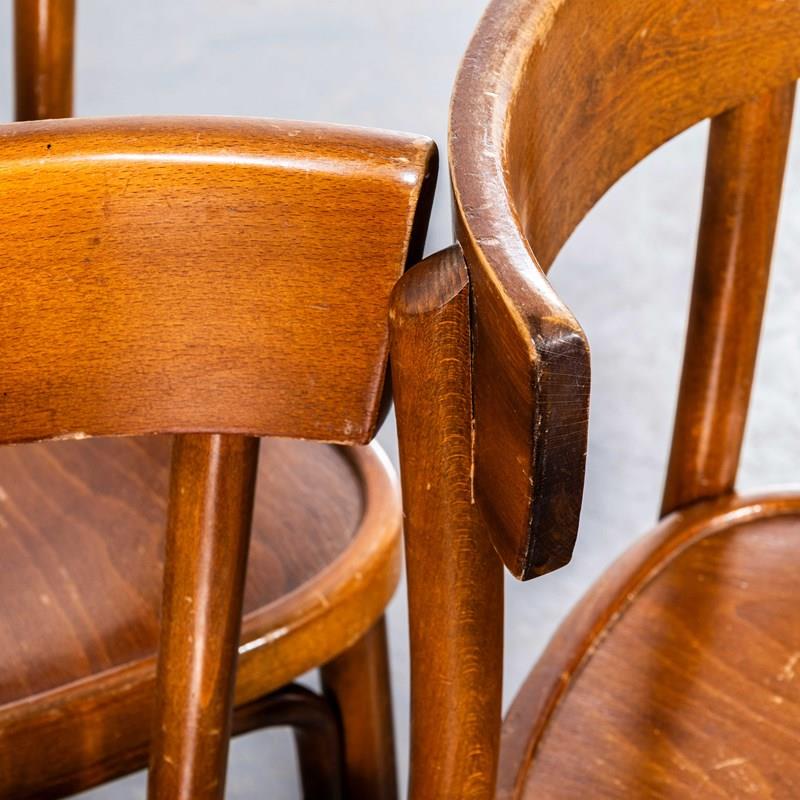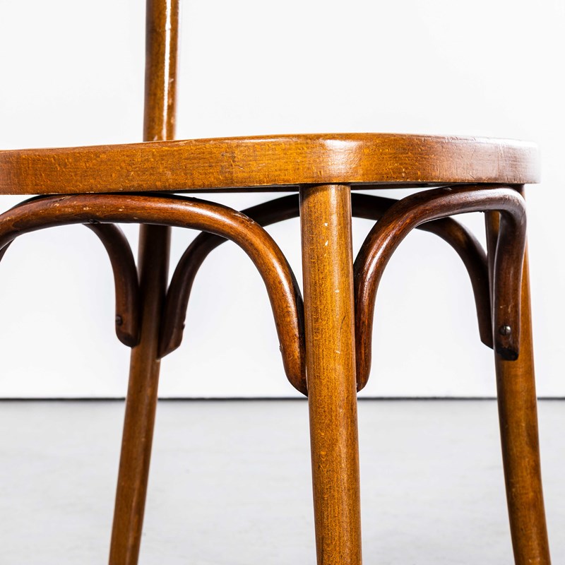 The process of steam bending beech to create elegant chairs was discovered and developed by Thonet, but when its patents expired in 1869 many companies including Fischel launched production. Fischel was founded in 1871 by Czech born David Gabriel Fischel, a successful vegetable oil merchant, using the first hand knowledge of his eldest son who had worked in one of Thonets Czech factories. First production was made in Germany in Niemes near the Danube. Later production moved to France in Alsace and sales offices were opened in most major French cities as Fischel became a major chair producer. These chairs date from the 1940’s, a very classic elegant shape with a rich colour and character. We service and wax each chair before it leaves our workshop and we deliver chairs of excellent quality. The chairs are not marked Fischel but we are confident they are by Fischel. Seat Height 46cm.