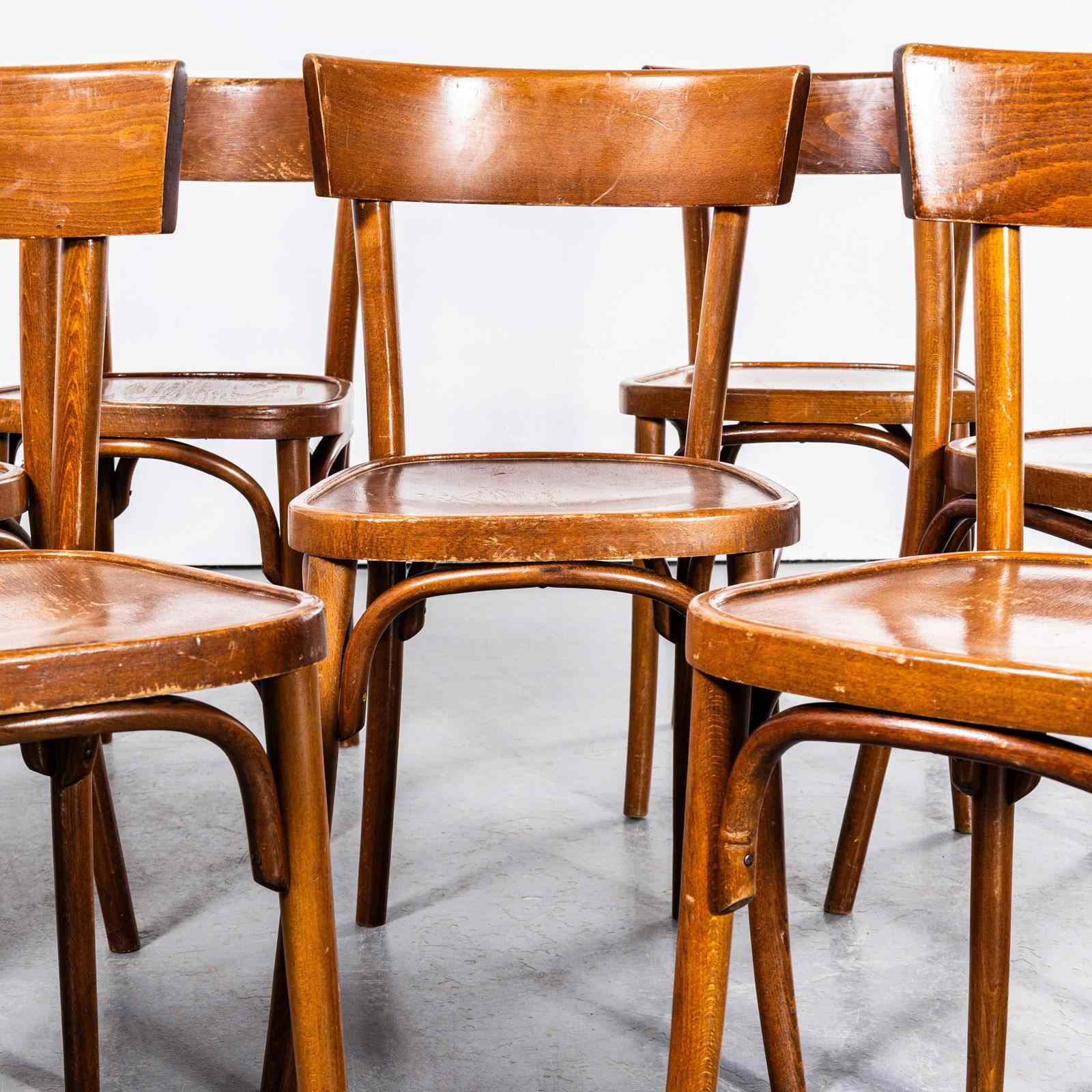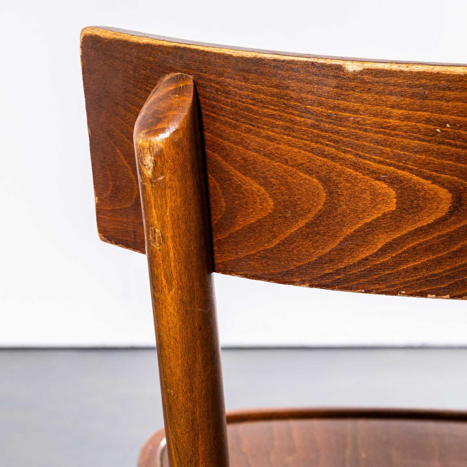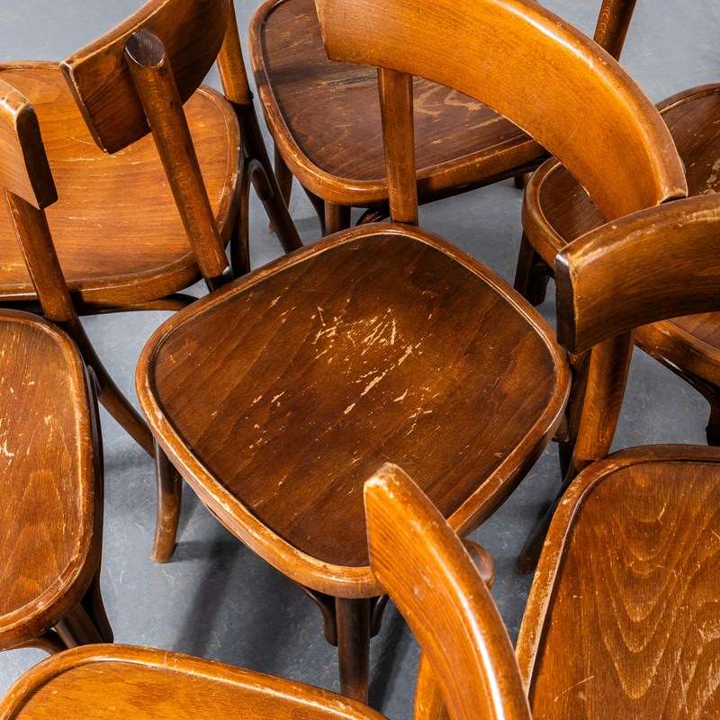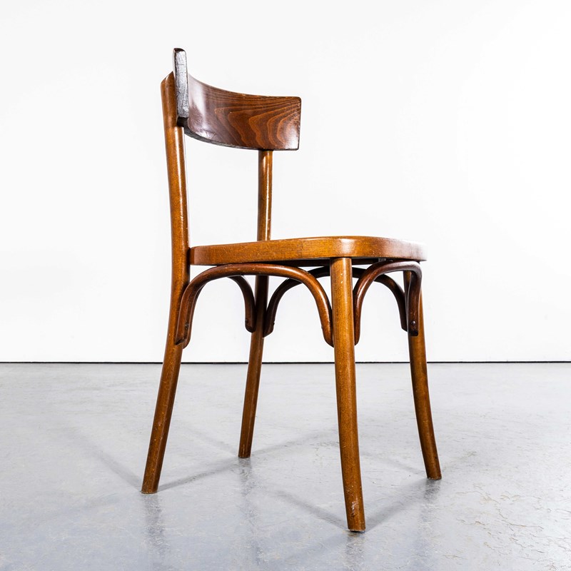 The process of steam bending beech to create elegant chairs was discovered and developed by Thonet, but when its patents expired in 1869 many companies including Fischel launched production. Fischel was founded in 1871 by Czech born David Gabriel Fischel, a successful vegetable oil merchant, using the first hand knowledge of his eldest son who had worked in one of Thonets Czech factories. First production was made in Germany in Niemes near the Danube. Later production moved to France in Alsace and sales offices were opened in most major French cities as Fischel became a major chair producer. These chairs date from the 1940’s, a very classic elegant shape with a rich colour and character. We service and wax each chair before it leaves our workshop and we deliver chairs of excellent quality. The chairs are not marked Fischel but we are confident they are by Fischel. Seat Height 46cm.