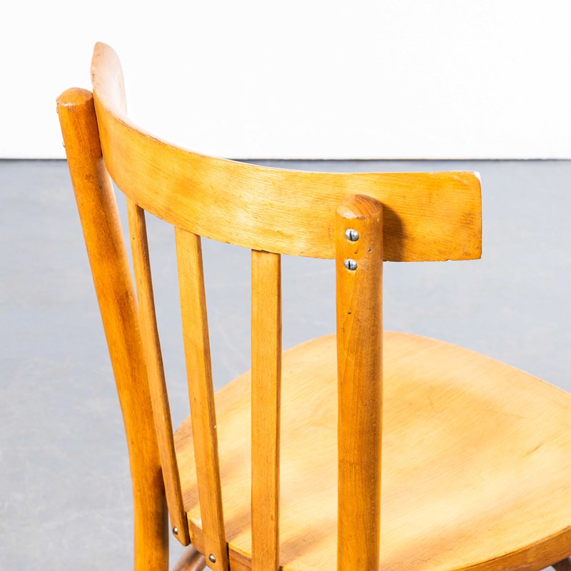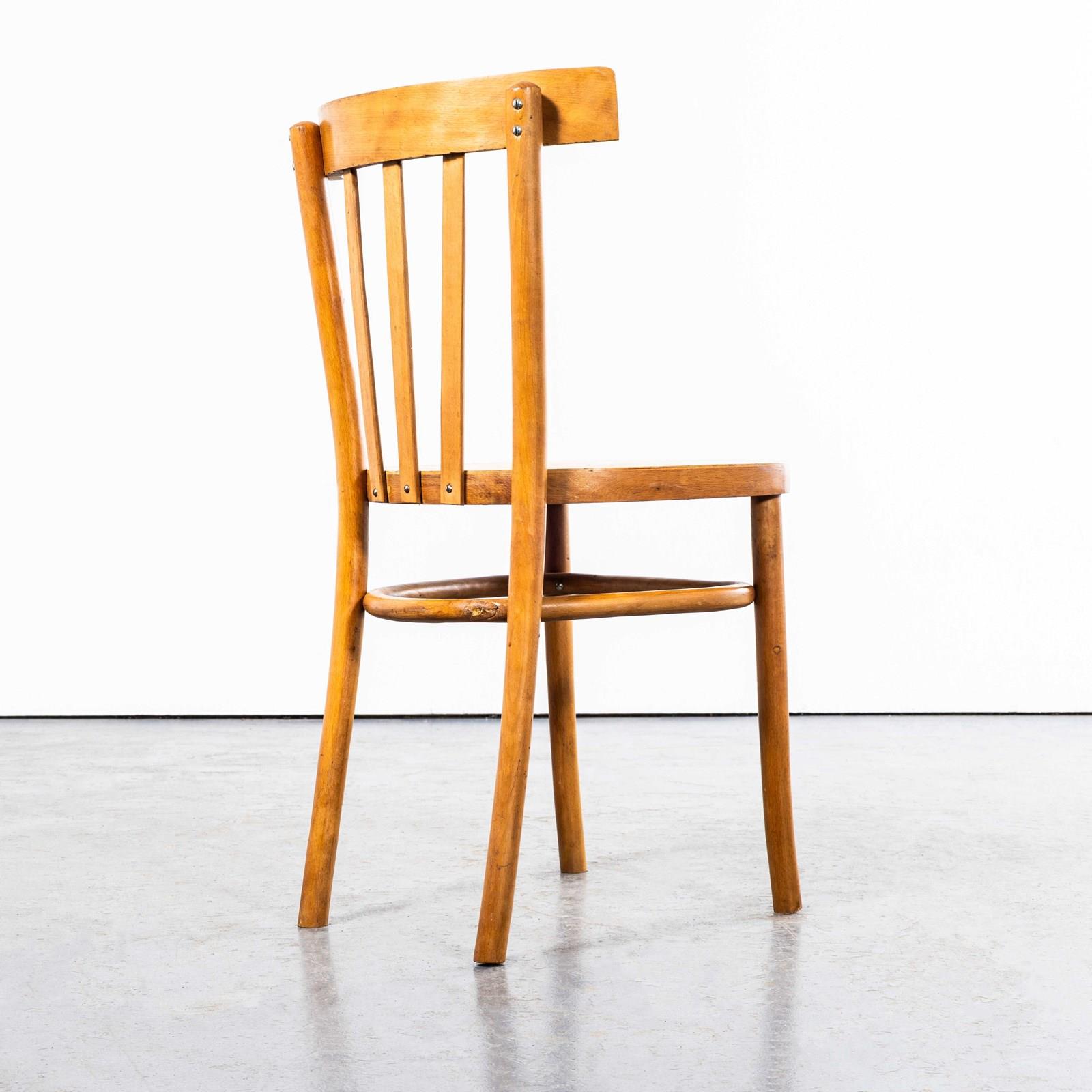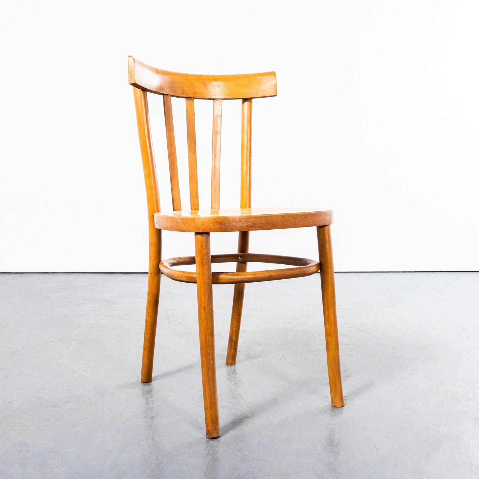 Classic beech bistro chair made in France by the maker Baumann. Baumann is a slightly off the radar French producer just starting to gain traction in the market. Baumann was founded in 1901, by Swiss man Emile Baumann, in Colombier Fontaine, France. Baumann started producing a simple child’s chair but grew rapidly to be a large bentwood producer with showrooms all over France. In our view the chairs of the 50’s and 60′ are their best, beautifully made and designed. We have cleaned them, that’s all. Stunning original patina. We service and wax each chair before they leave our workshop and we deliver chairs of excellent quality. Seat Height 47cm.