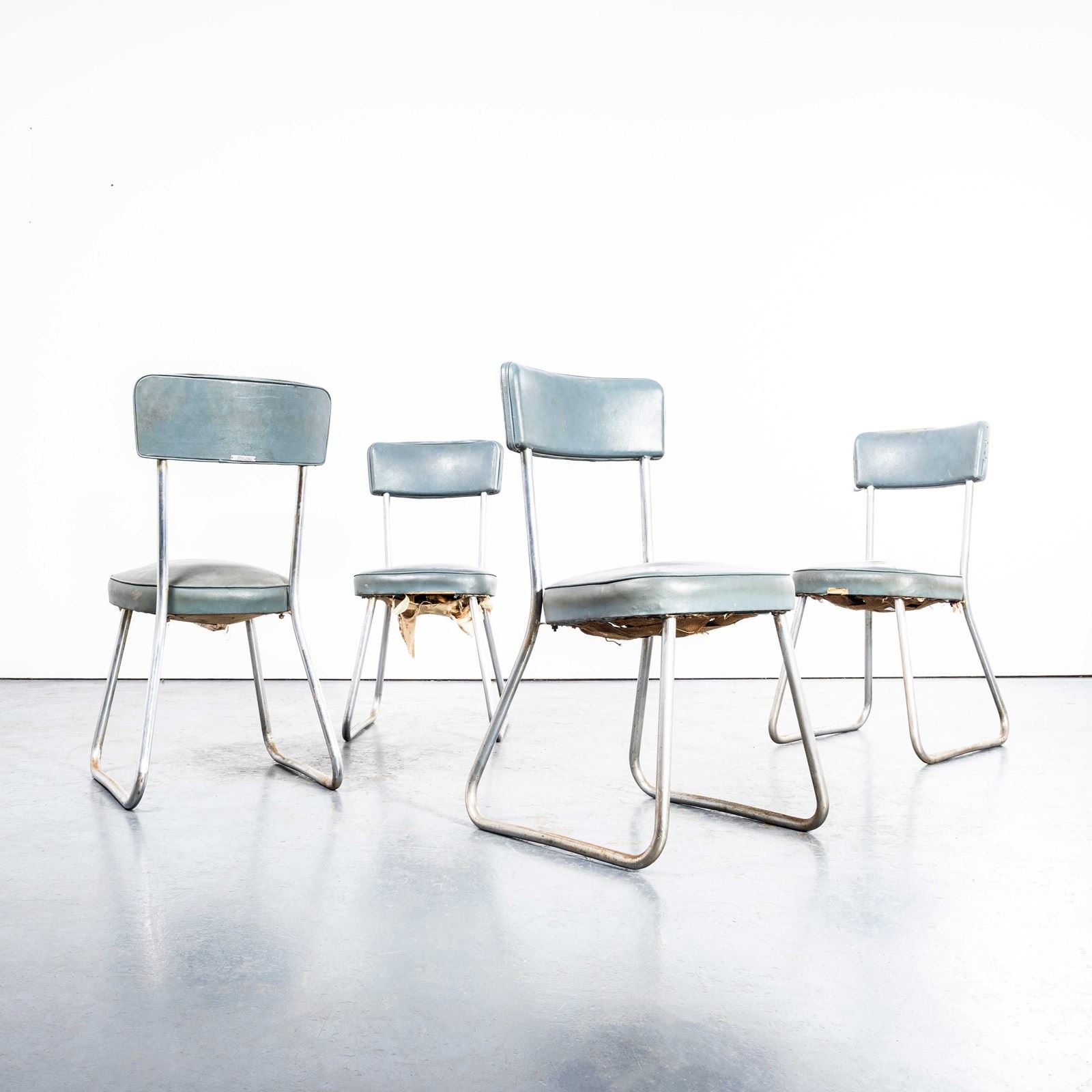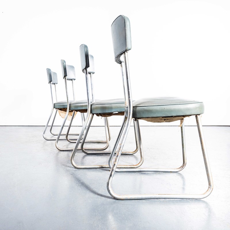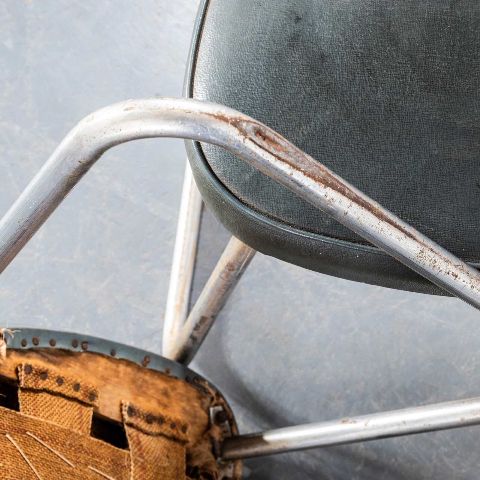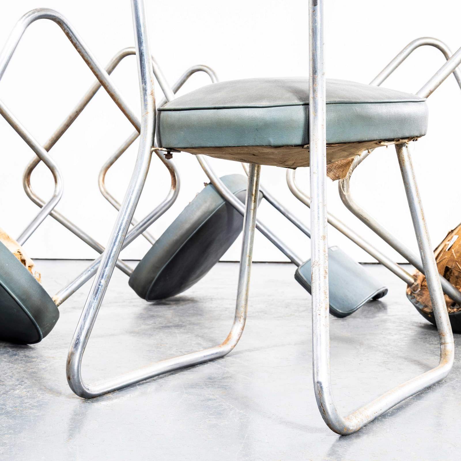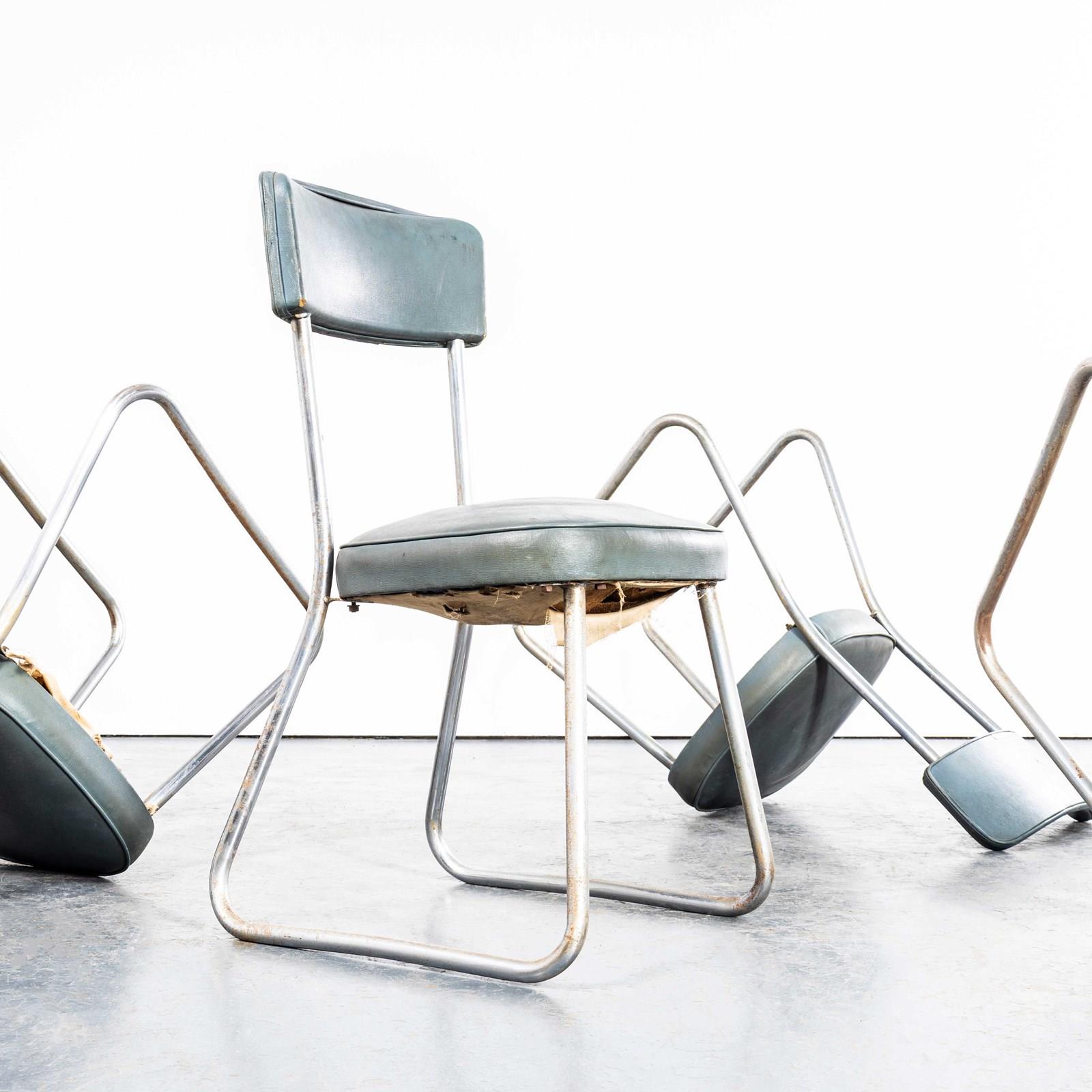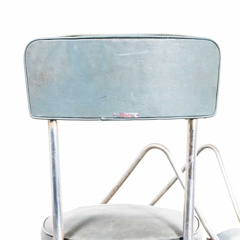 The phrase Roneo referred to a very early precursor to the photo copy machine, a simple machine that used ink and stencils to produce copies. The company was founded in England and later found its success in France where it dominated the office seating and storage market This model of chair is one of our favourites, the sled chrome bases, sprung seats and faded Rexine upholstery. In great condition for their age we have left them as is, our workshop has cleaned them that is all. The seats feature sprung coil suspension which is supported on the original hessian webbing. The fabric hanging in places is the early original cotton under cloth used simply to finish the underside. We have left them as they are because we love the originality. If you would like the bottoms tidied up with a new cotton cloth our workshop team can do this for a small charge. Comfortable chairs full of character and very hard to find. Seat Height: 46cm