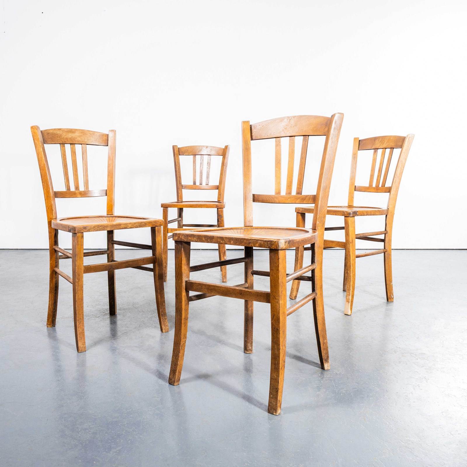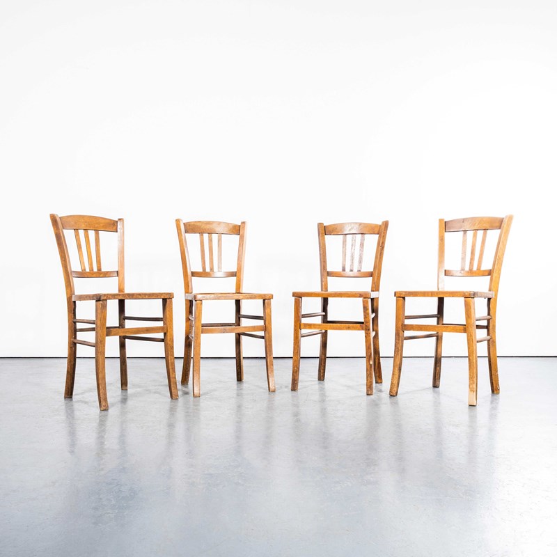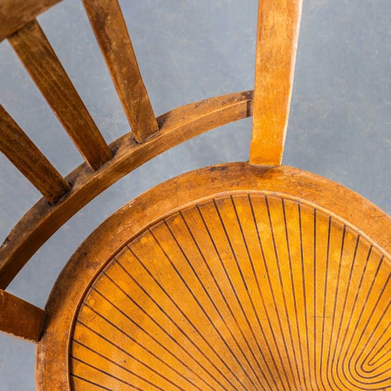 Made by Luterma, the process of steam bending beech to create elegant chairs was discovered and developed first by Thonet, but when its patents expired in 1869 many companies including Luterma launched production. Luterma was one of the brands marketed by Estonian factory A.M. Luther which was founded in the late 19th Century in Tallinn. Luterma production was principally in Estonia but they also had factories in France for local market production. At the time of the Bauhaus movement Walter Gropius and Marcel Breuer worked with the factory to develop various models. These chairs date from the 1950s, a simple classic farmhouse shape, with rich character and a warm honey oak colour. The chairs have the most beautiful radial seat patterns. We service and rejuvenate each chair before it leaves our workshop and we deliver chairs of excellent quality. Seat Height: 49cm