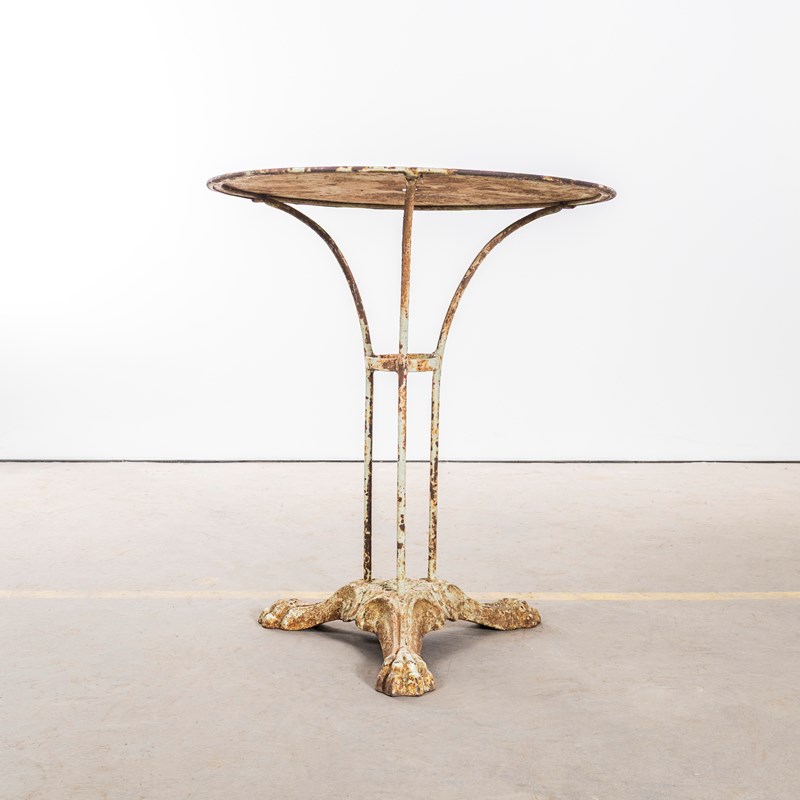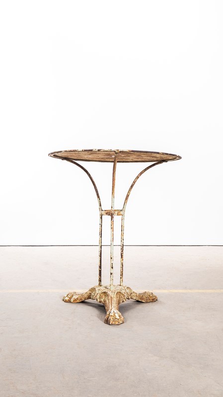 Classic French gueridon table with three solid bar hand shaped legs with a central riveted support ring and delicate curved feet on an elegant shaped sturdy cast metal base. Exceptional character with a beautifully aged top with hints of the original paint.