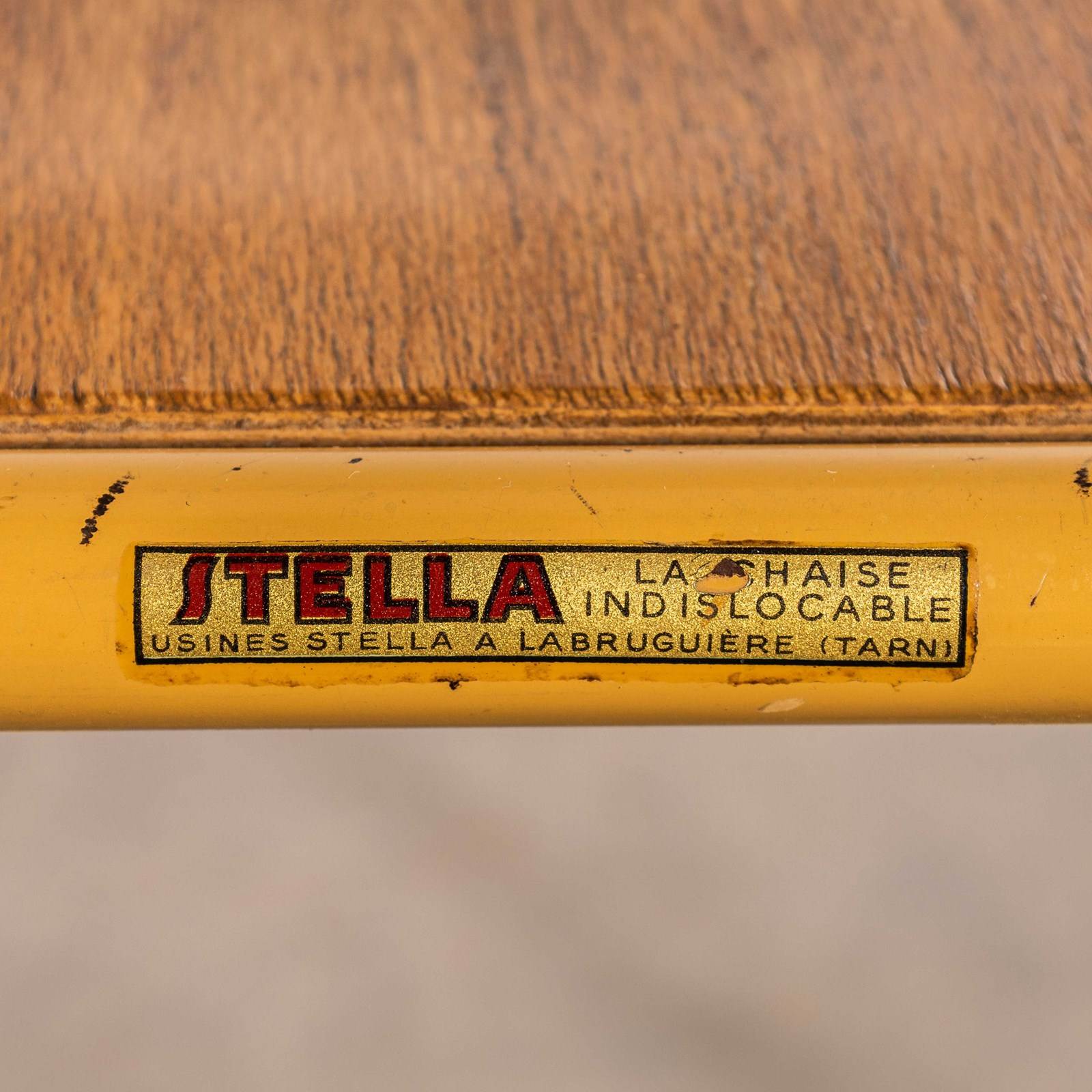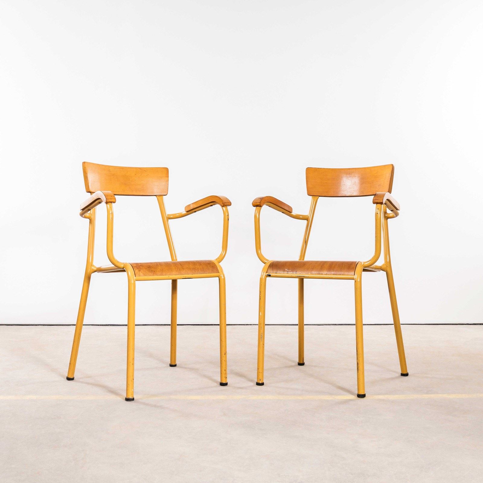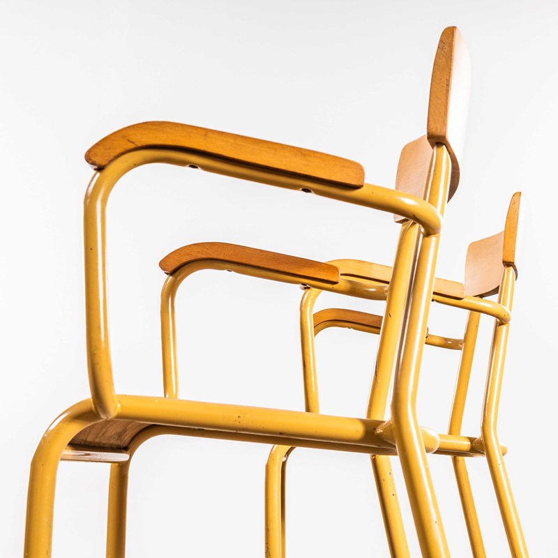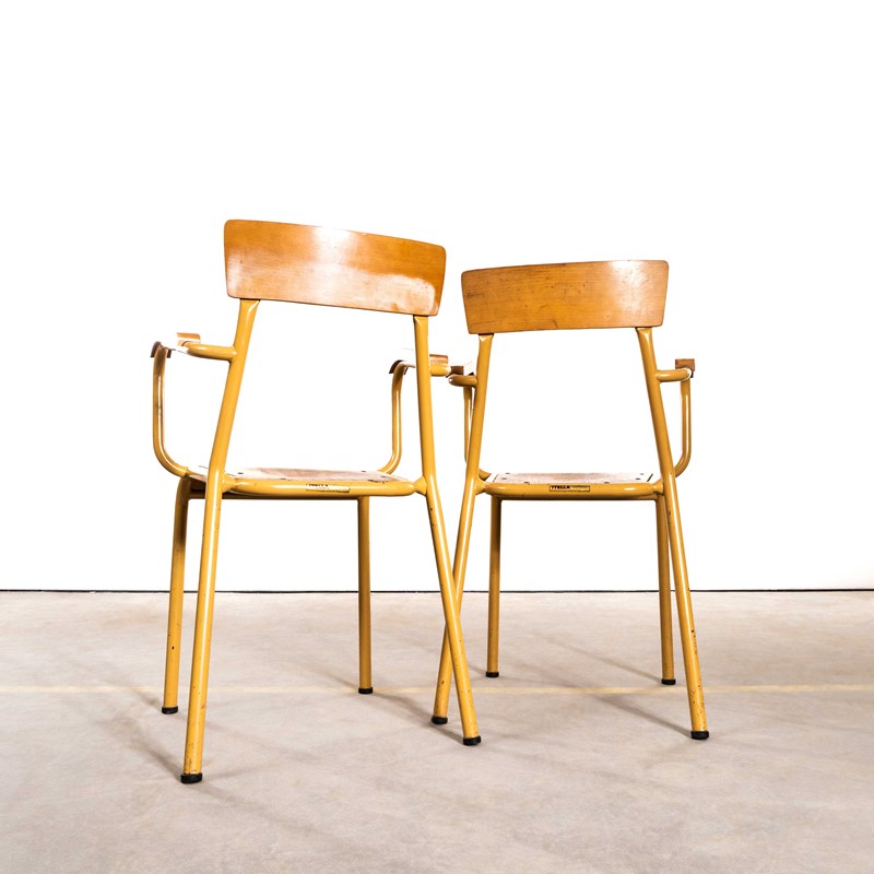 Stella is a lesser known French chair manufacturer founded originally in 1912 as the Auriol company making wheelbarrows. In 1922 Léon Ruisseau used his technical knowledge to create a stronger chair using hidden bolts to strengthen the structure. The process made the construction stronger but also allowed him to manage his inventory better in component form. Based in Labruguière in the South of France Stella exists to this day. This listing is for a pair of stunning arms chairs by Stella. The chairs have the original makers labels, the original mustard paint and feature heavy weight solid beech backs, the chairs are in excellent original condition. Our workshop has checked the chairs, cleaned and waxed them ready for practical use.