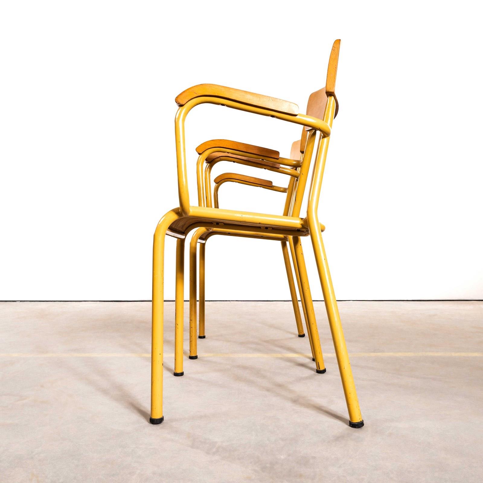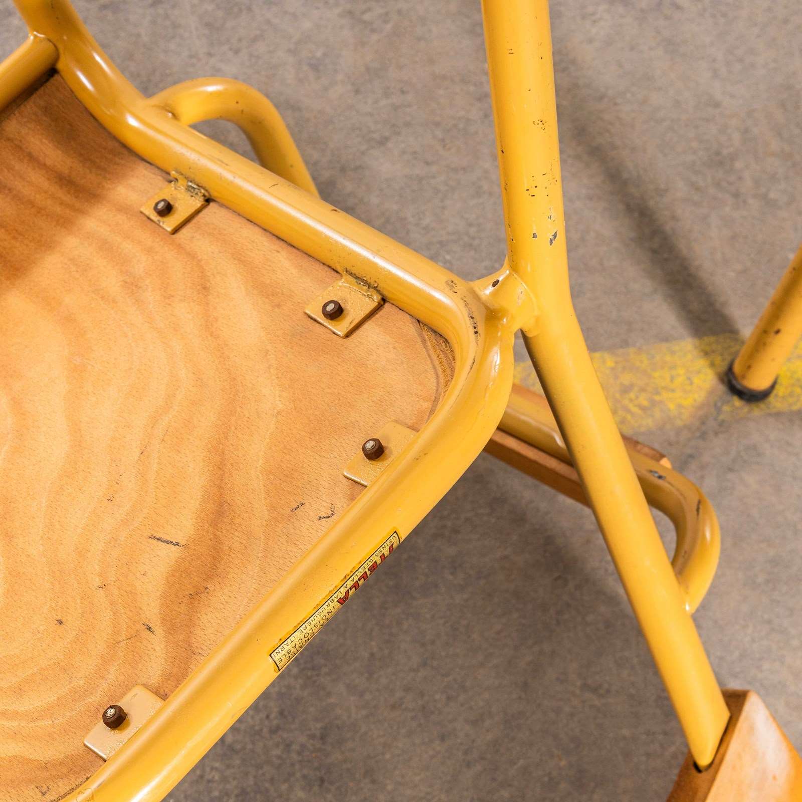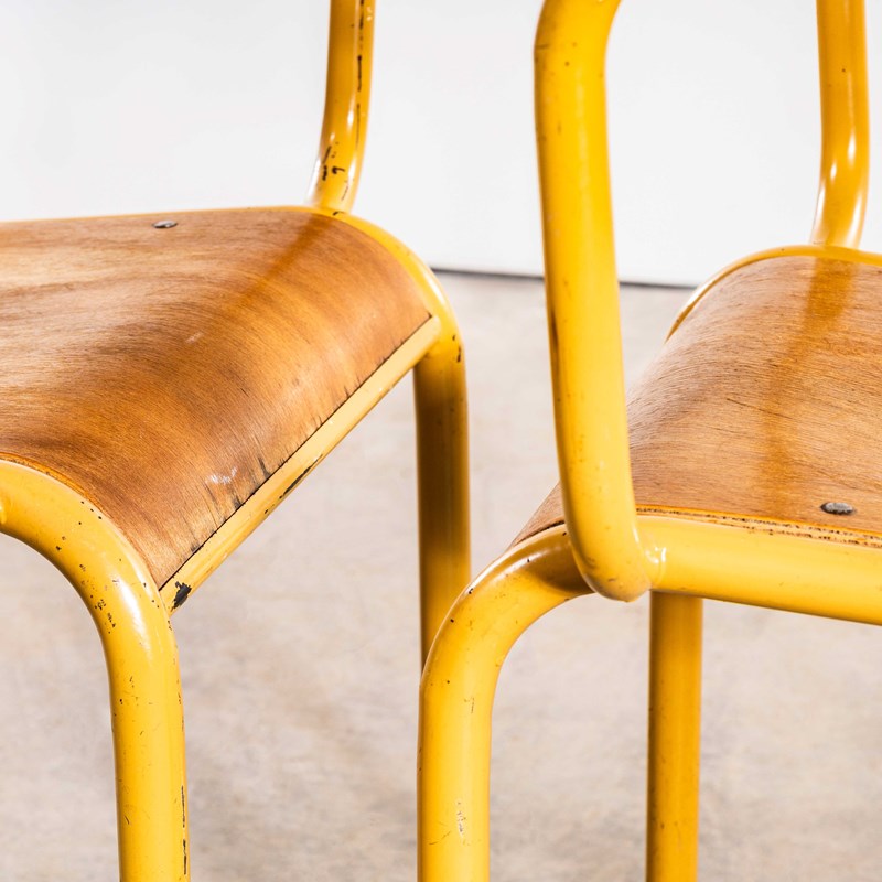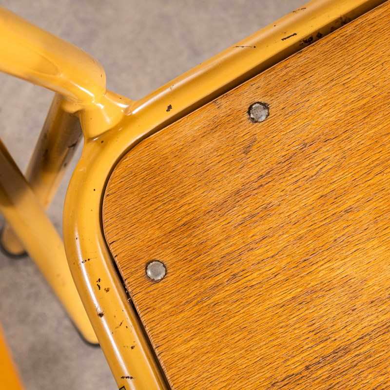 Stella is a lesser known French chair manufacturer founded originally in 1912 as the Auriol company making wheelbarrows. In 1922 Léon Ruisseau used his technical knowledge to create a stronger chair using hidden bolts to strengthen the structure. The process made the construction stronger but also allowed him to manage his inventory better in component form. Based in Labruguière in the South of France Stella exists to this day. This listing is for a pair of stunning arms chairs by Stella. The chairs have the original makers labels, the original mustard paint and feature heavy weight solid beech backs, the chairs are in excellent original condition. Our workshop has checked the chairs, cleaned and waxed them ready for practical use.
