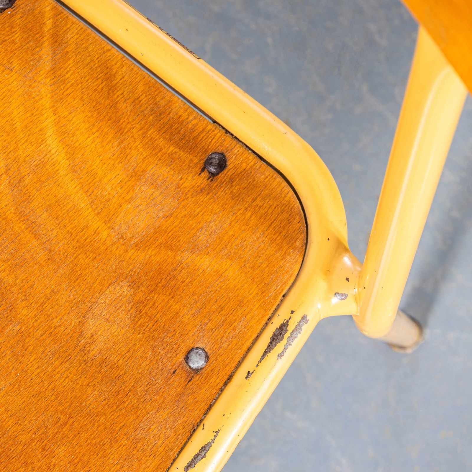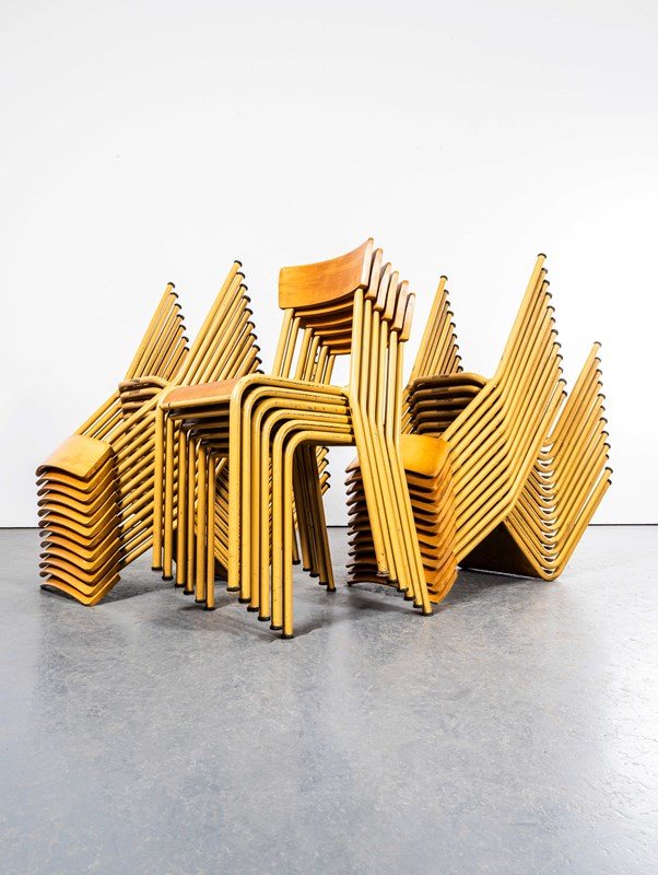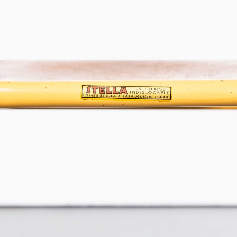 Stella is a lesser known French chair manufacturer founded originally in 1912 as the Auriol company making wheelbarrows. In 1922 Léon Ruisseau used his technical knowledge to create a stronger chair using hidden bolts to strengthen the structure. The process made the construction stronger but also allowed him to manage his inventory better in component form. Based in Labruguière in the South of France Stella exists to this day. This listing is for a great batch of stunning stacking chairs by Stella. The chairs have the original makers labels, the original mustard paint and feature heavy weight solid beech backs, the chairs are in excellent original condition. Our workshop has checked all the chairs, cleaned and waxed them ready for practical use. Seat Height: 46cm.