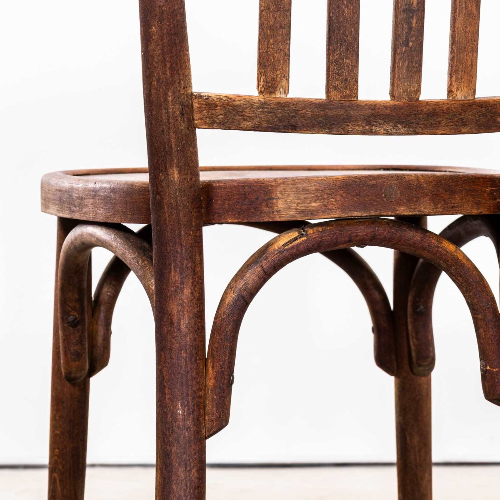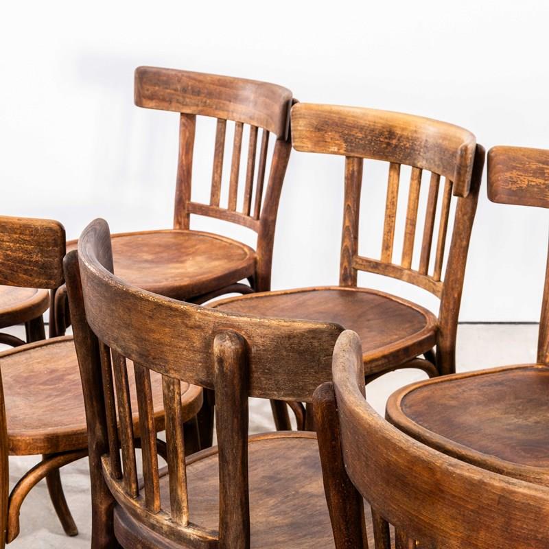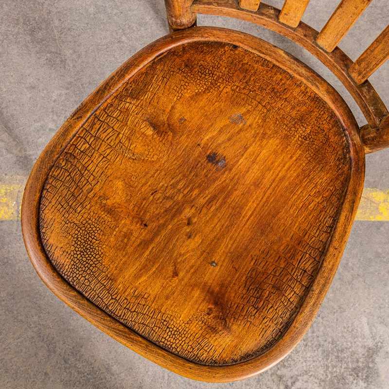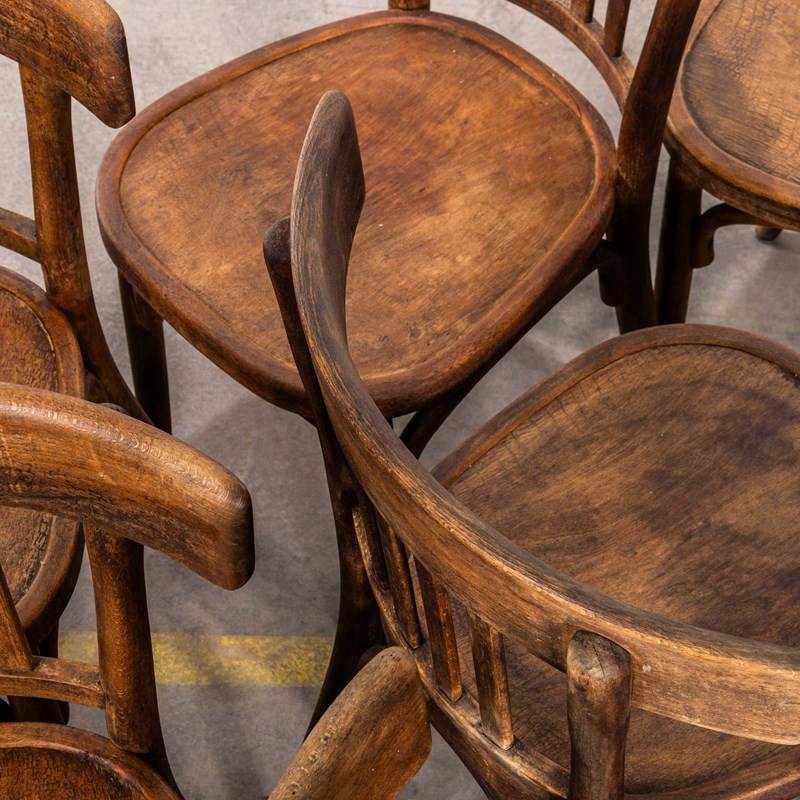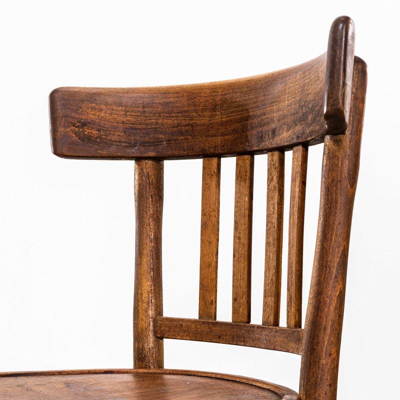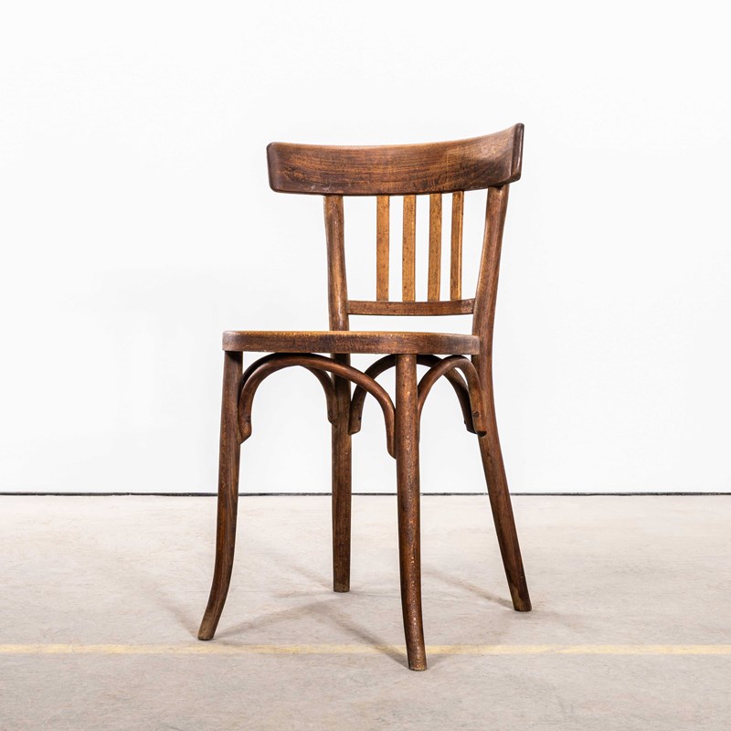 The process of steam bending beech to create elegant chairs was discovered and developed by Thonet, but when its patents expired in 1869 many companies including Fischel launched production. Fischel was founded in 1871 by Czech born David Gabriel Fischel, a successful vegetable oil merchant, using the first hand knowledge of his eldest son who had worked in one of Thonets Czech factories. First production was made in Germany in Niemes near the Danube. Later production moved to France in Alsace and sales offices were opened in most major French cities as Fischel became a major chair producer. The chairs do not have a makers mark but we believe them to be Fischel. These chairs date from the 1950’s, a classic shape with a rich colour and character and all in good condition. We service and wax each chair before it leaves our workshop and we deliver chairs of excellent quality.