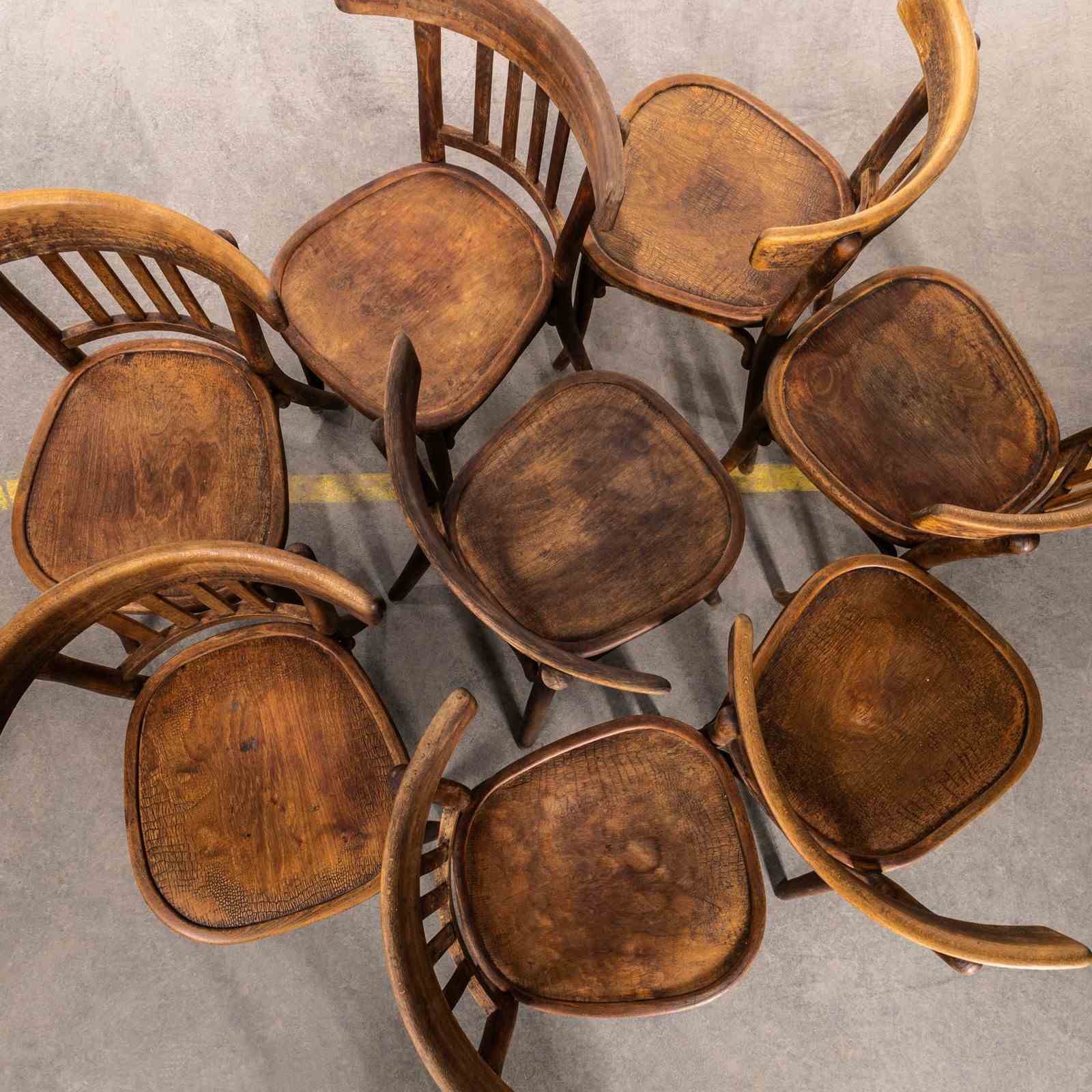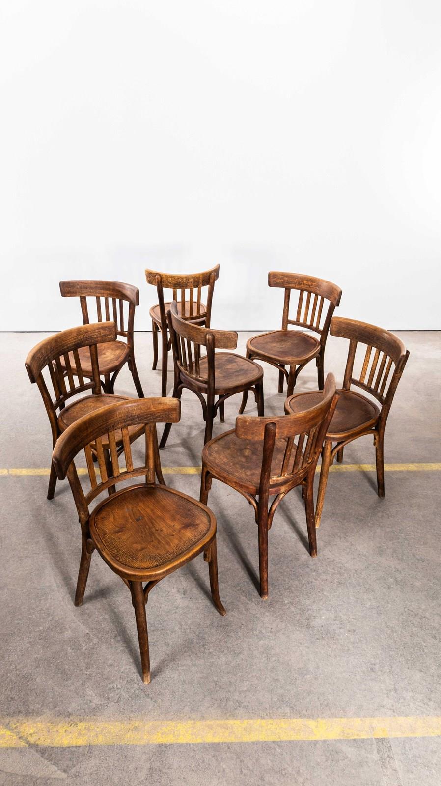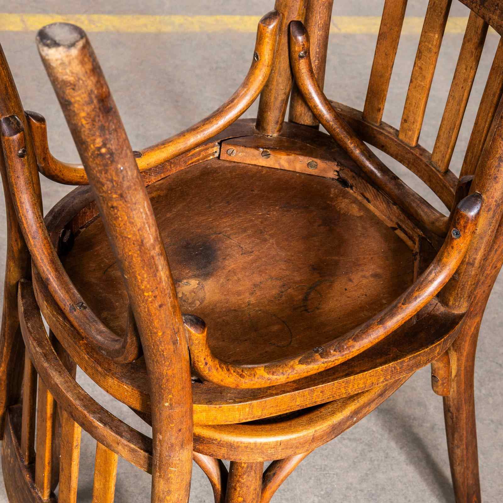 The process of steam bending beech to create elegant chairs was discovered and developed by Thonet, but when its patents expired in 1869 many companies including Fischel launched production. Fischel was founded in 1871 by Czech born David Gabriel Fischel, a successful vegetable oil merchant, using the first hand knowledge of his eldest son who had worked in one of Thonets Czech factories. First production was made in Germany in Niemes near the Danube. Later production moved to France in Alsace and sales offices were opened in most major French cities as Fischel became a major chair producer. The chairs do not have a makers mark but we believe them to be Fischel. These chairs date from the 1950’s, a classic shape with a rich colour and character and all in good condition. We service and wax each chair before it leaves our workshop and we deliver chairs of excellent quality.