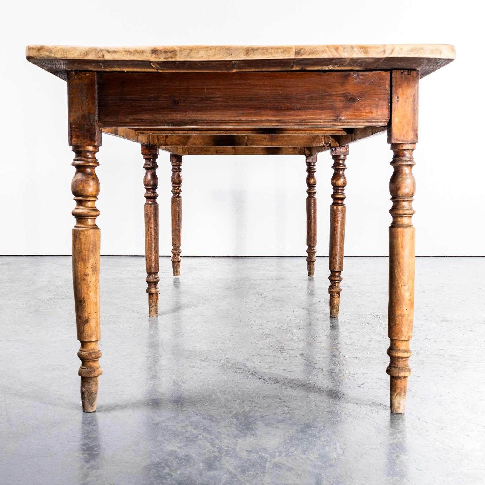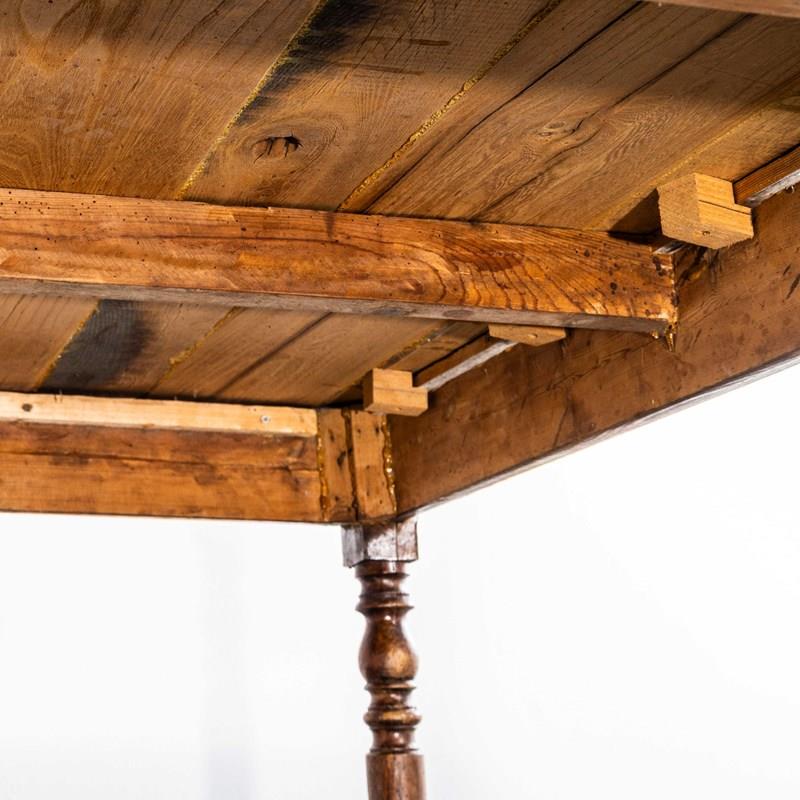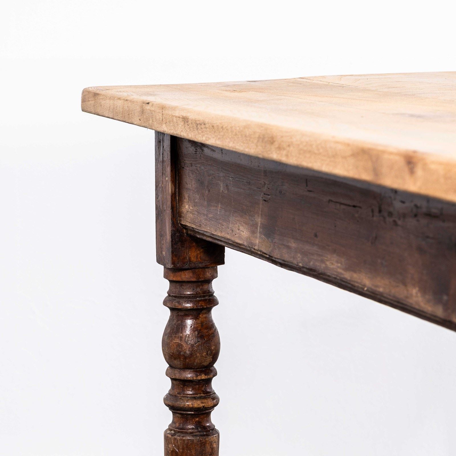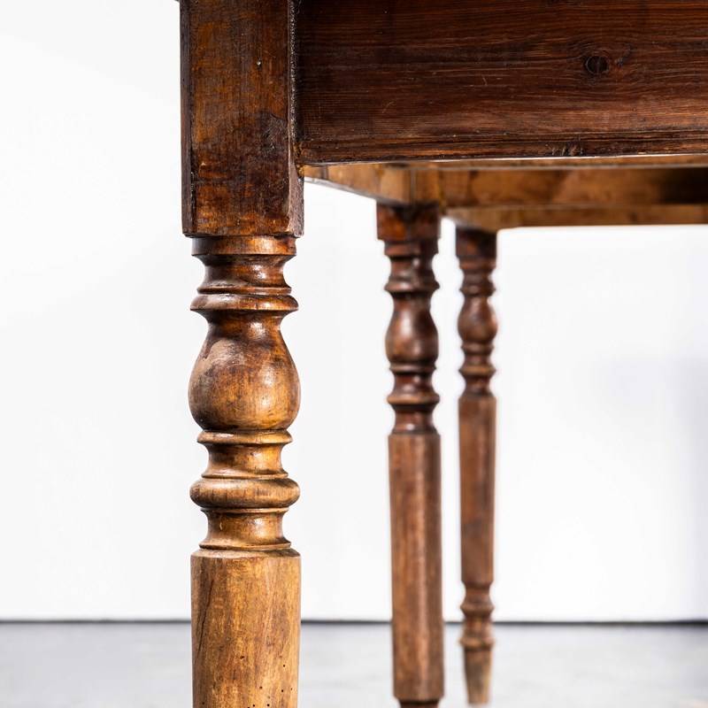 Good sized original French table with a rich honey colour and character top. Beautifully made in solid pine throughout. The table is made with turned bobbin legs and good construction, the top has incredible grain and colour and is solid planked pine. Our workshop has serviced the table, it is strong and stable, and ready to go.
