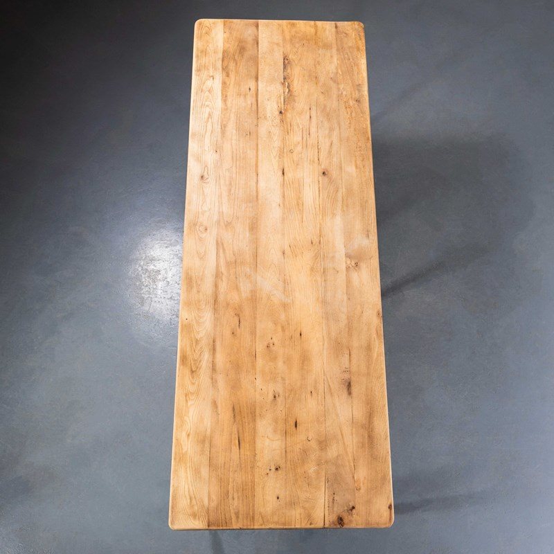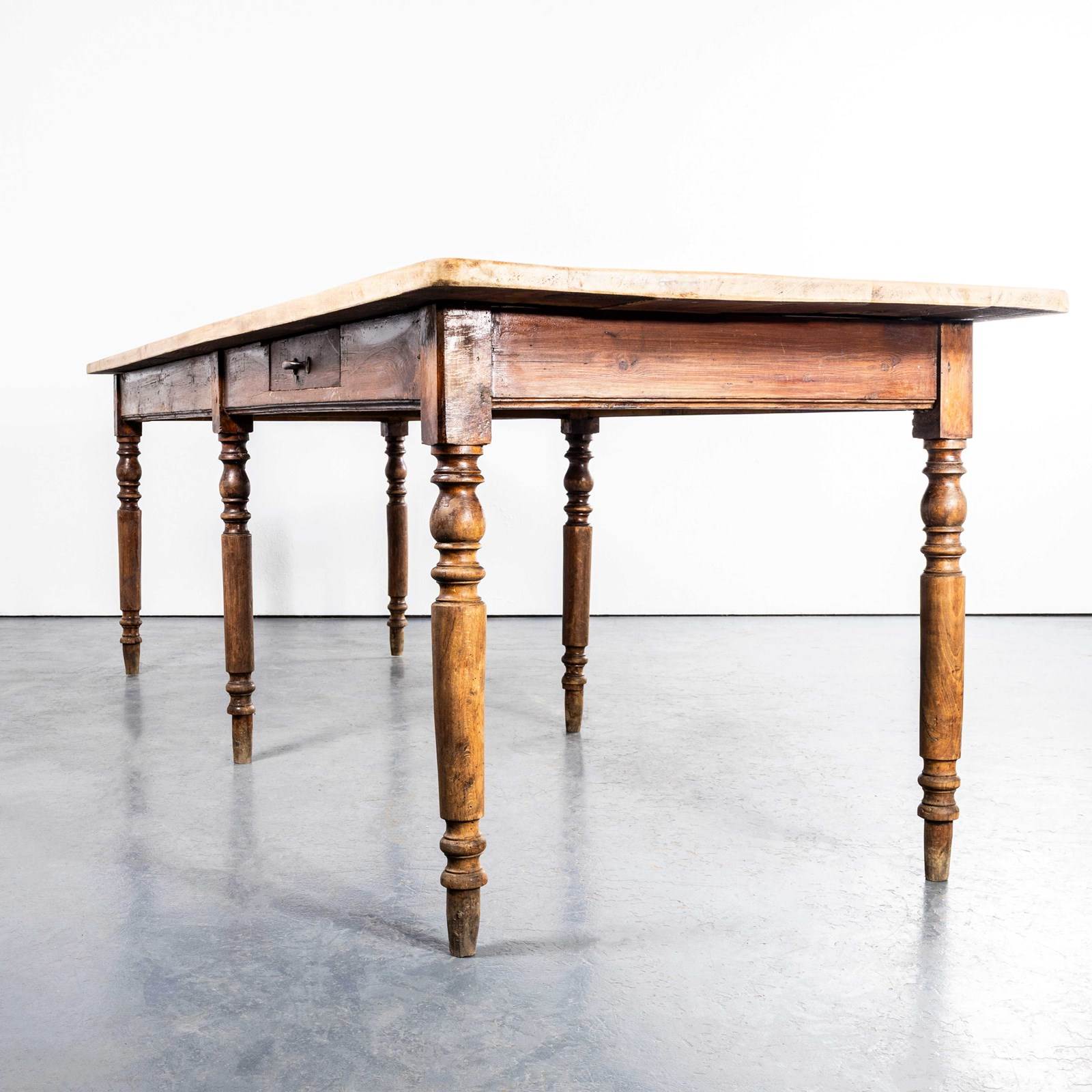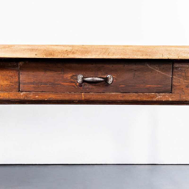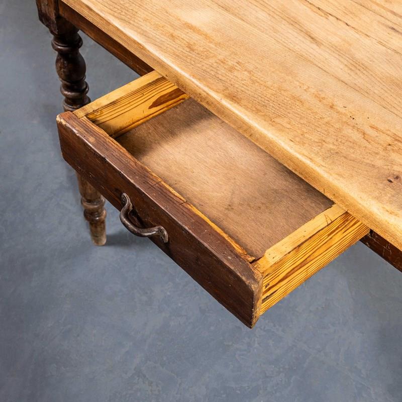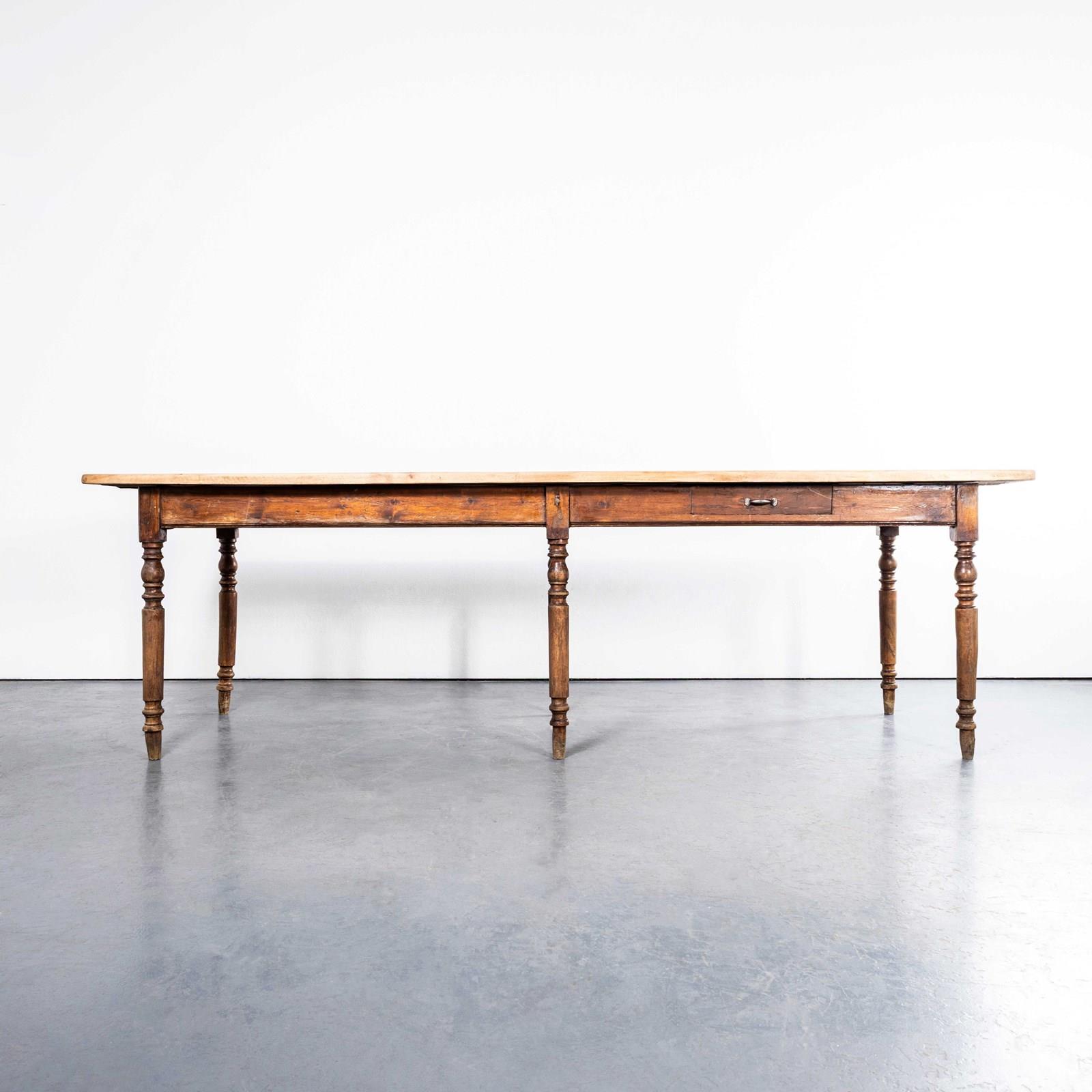 Good sized original French table with a rich honey colour and character top. Beautifully made in solid pine throughout. The table is made with turned bobbin legs and good construction, the top has incredible grain and colour and is solid planked pine. Our workshop has serviced the table, it is strong and stable, and ready to go.