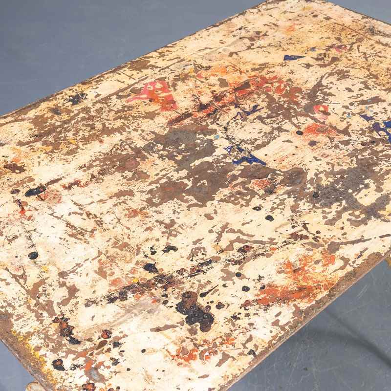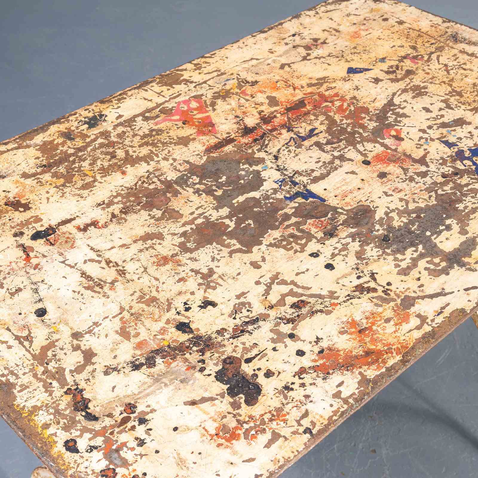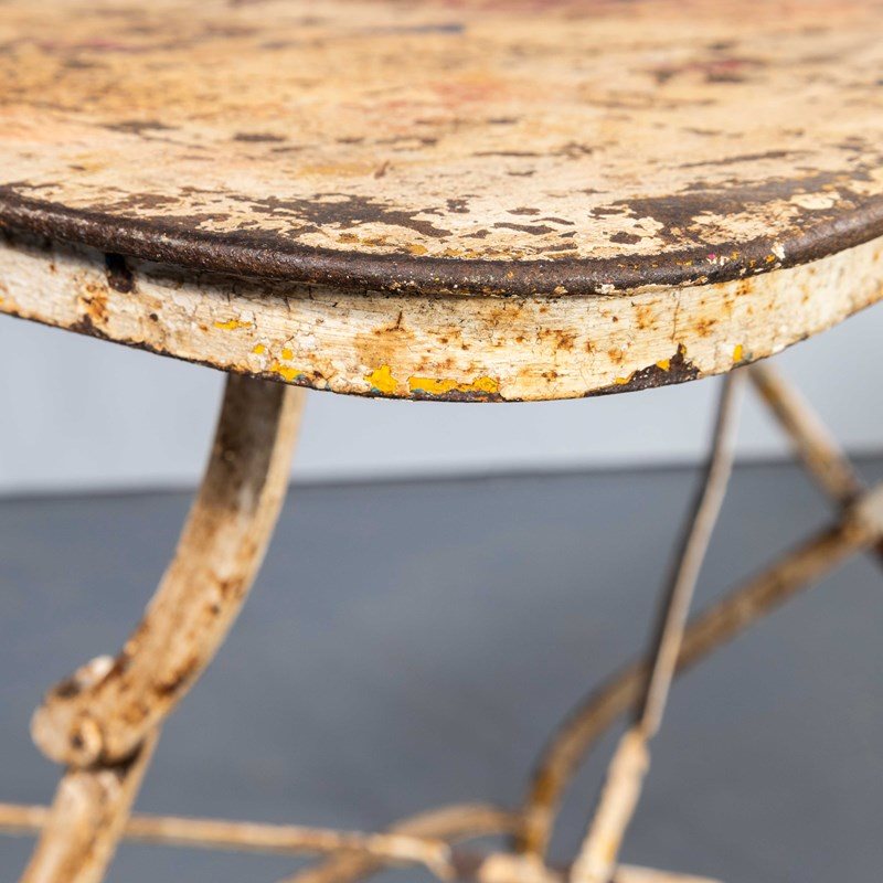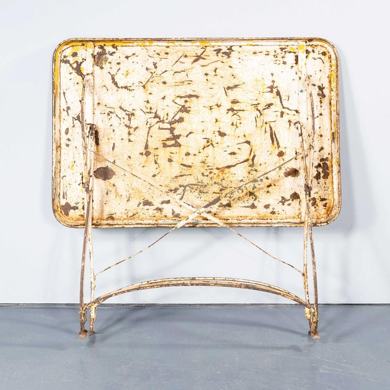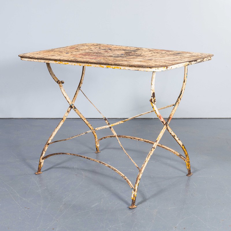 Good honest French metal dining table with a hand forged classic folding base and the original sheet metal top. The base has a graceful cross stretcher and curved frame. We love the colour and the character of the worn and original paint. The table is solid and in excellent condition, our workshop has gently serviced and restored the table. Closed Table Height: 100cm.