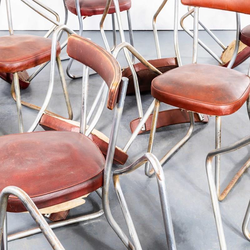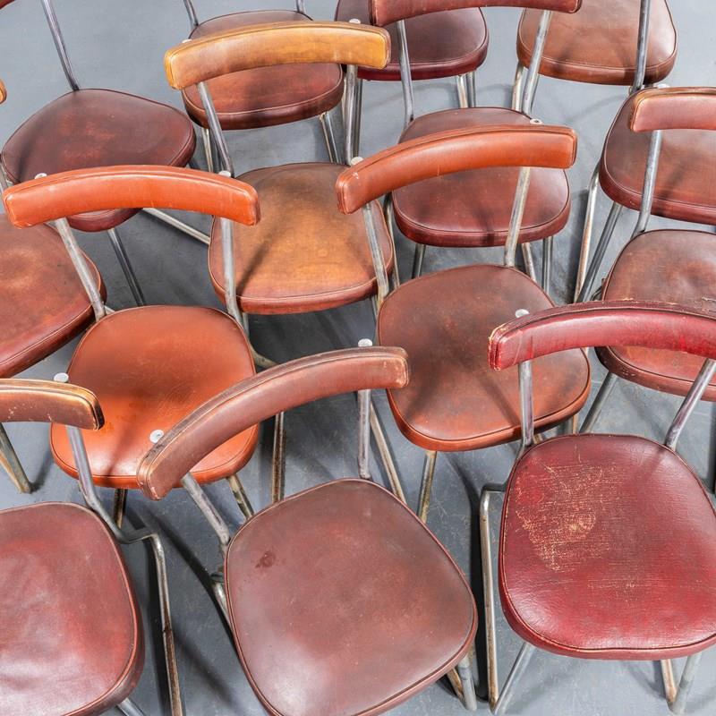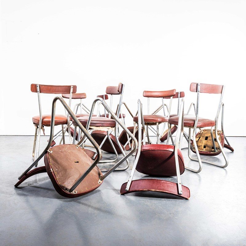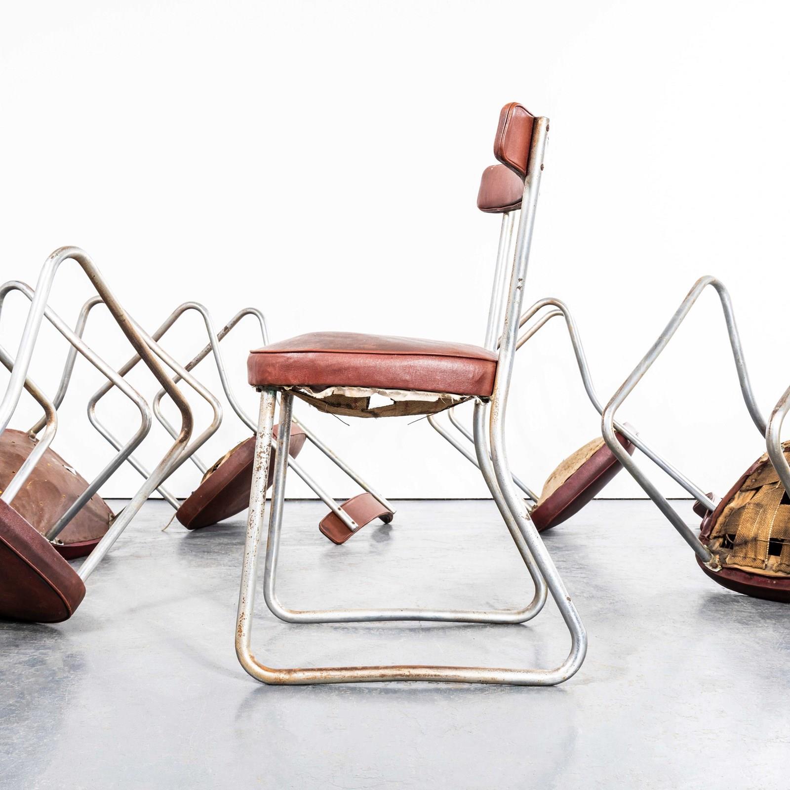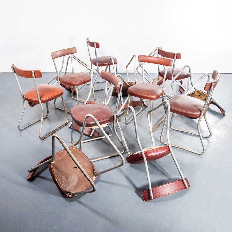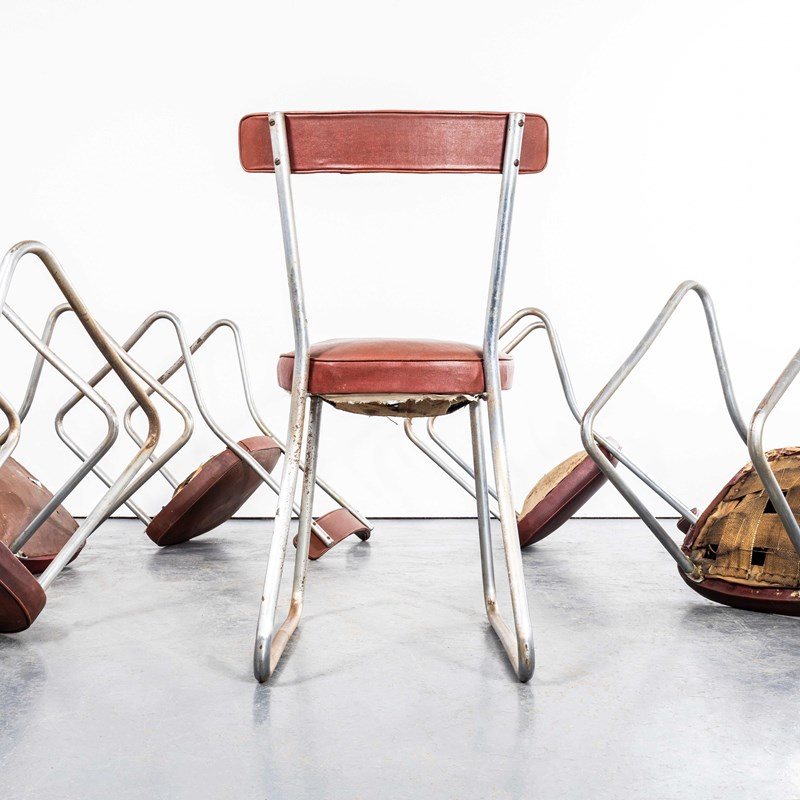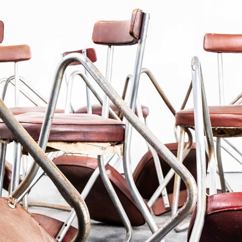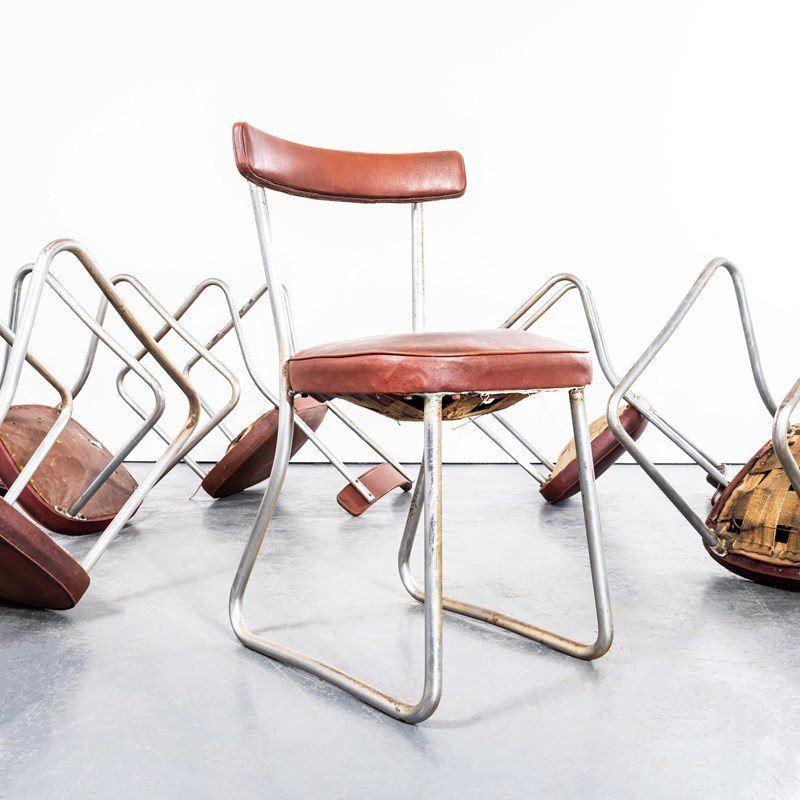 The phrase Roneo referred to a very early precursor to the photo copy machine, a simple machine that used ink and stencils to produce copies. The company was founded in England and later found its success in France where it dominated the office seating and storage market This model of chair is one of our favourites, the sled chrome bases, sprung seats and faded Rexine upholstery. In great condition for their age we have left them as is, our workshop has cleaned them that is all. The seats feature sprung coil suspension which is supported on the original hessian webbing. The fabric hanging in places is the early original cotton under cloth used simply to finish the underside. We have left them as they are because we love the originality. If you would like the bottoms tidied up with a new cotton cloth our workshop team can do this for a small charge. Comfortable chairs full of character and very hard to find. Seat Height: 46cm