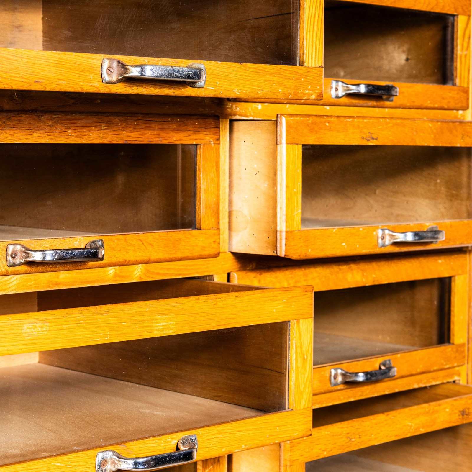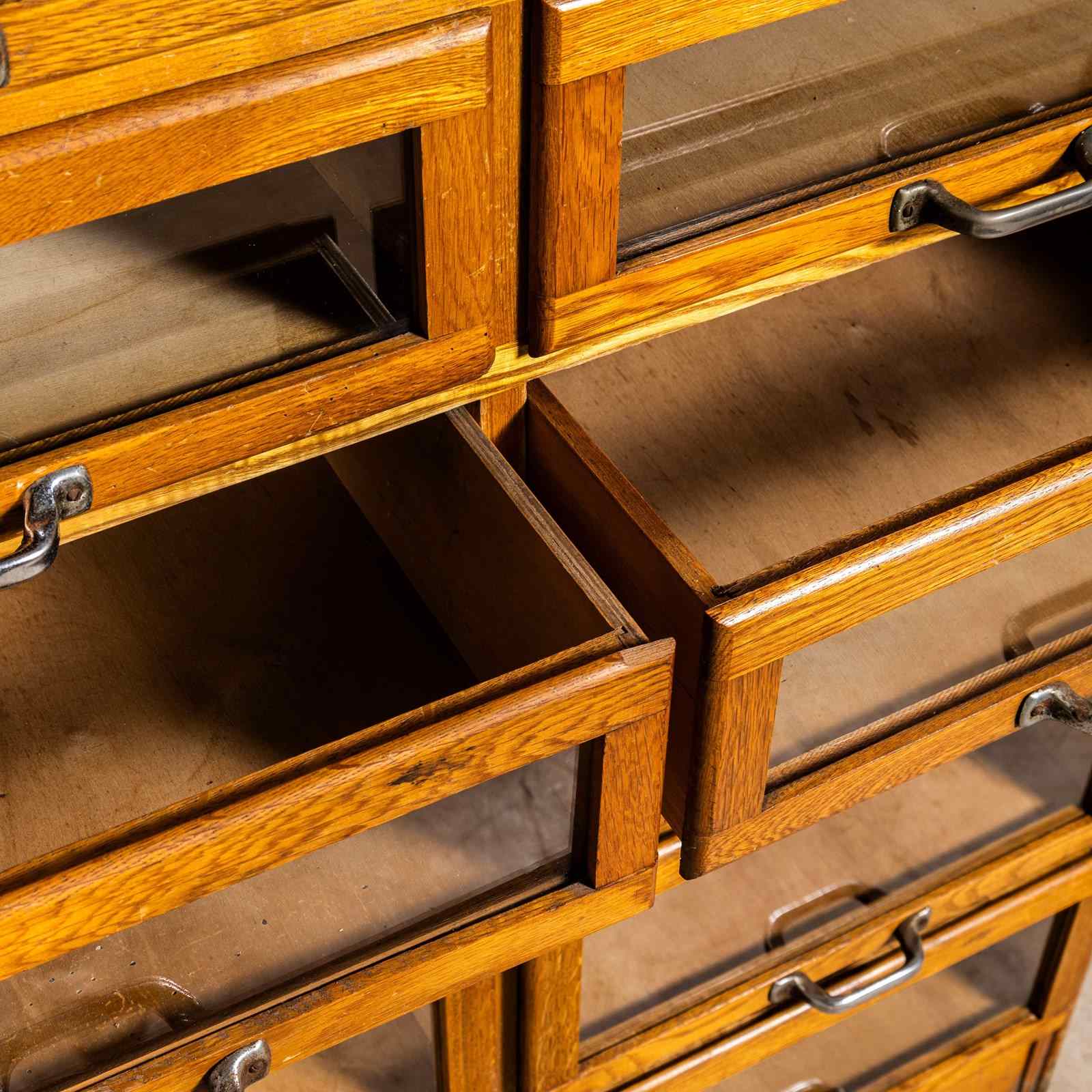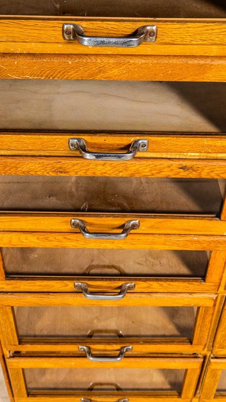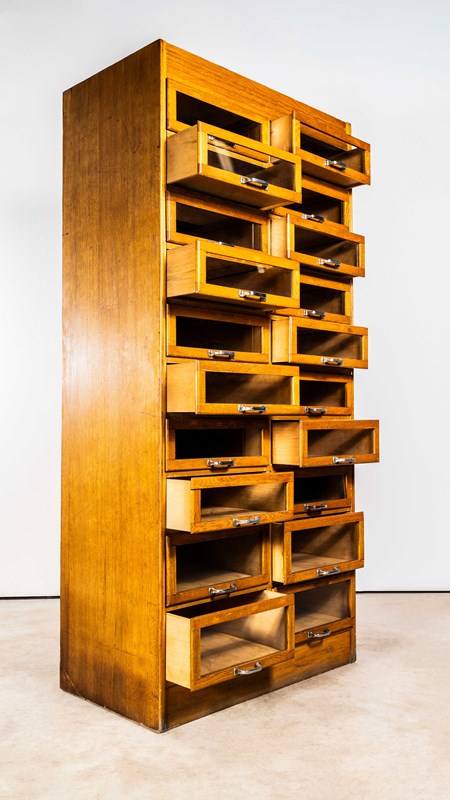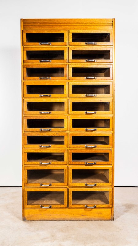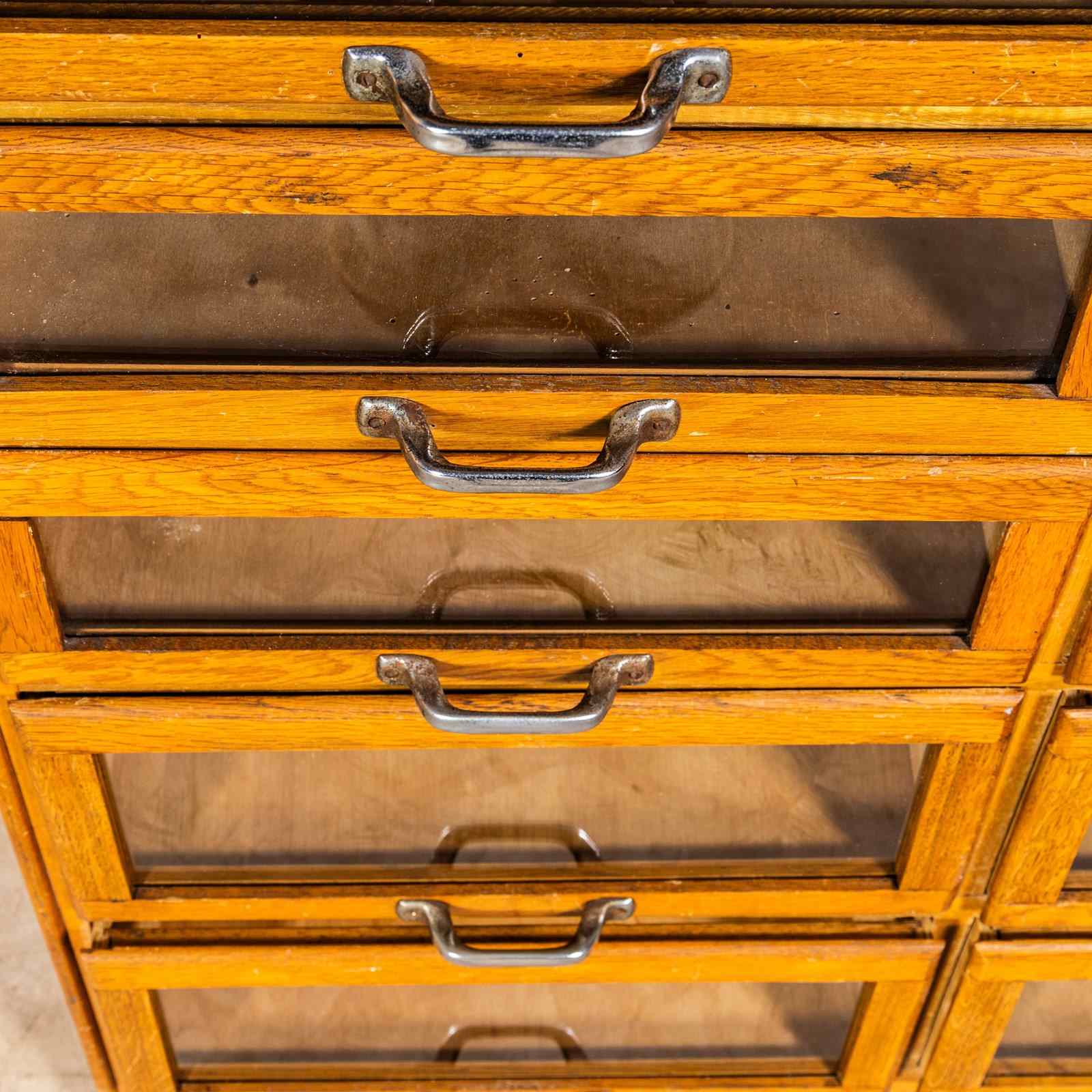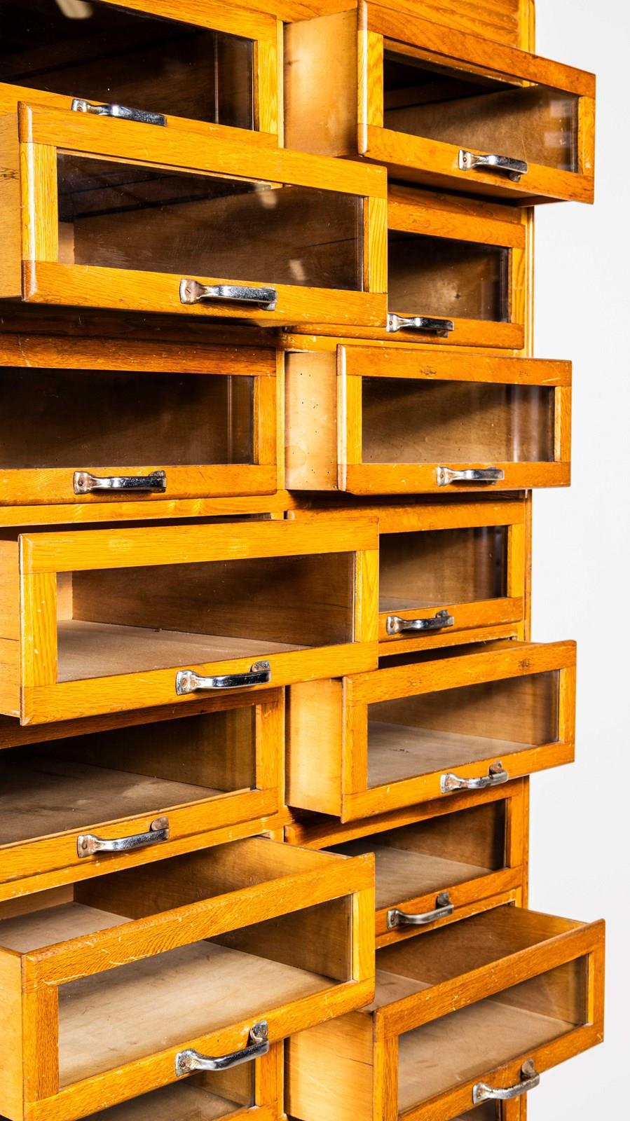 Sourced in Scotland from the original tailors shop, this unit is very well made principally of oak with oak fronts and sides. This is a beautiful and practical piece of cabinet making that has survived in exceptional original condition. The cabinet features a bank of twenty glass fronted drawers with original pressed handles. Our workshop has cleaned and serviced the cabinet, all drawers run smoothly. stunning condition.