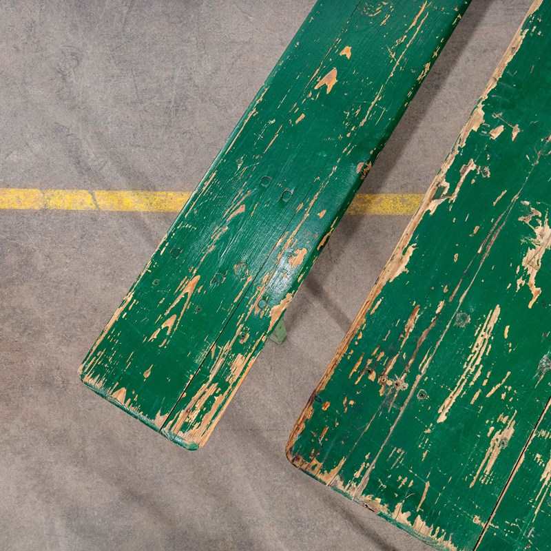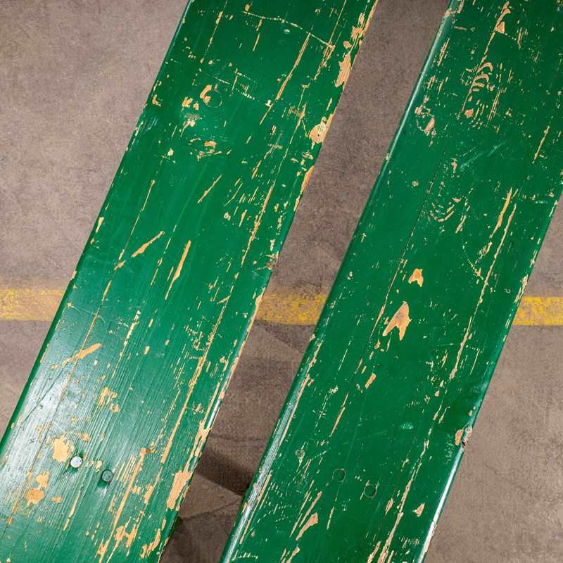These unique sets are made from solid pitch pine, they have folding steel legs which fold flat for easy storage. Each set varies, some have painted tops, some have coloured bases. Rich in character and age, our workshop has cleaned and serviced each set, they are good to go. Made of pine they can be used outside occasionally but we would not recommend long term exposure to the weather. Listing is for two benches and one table.