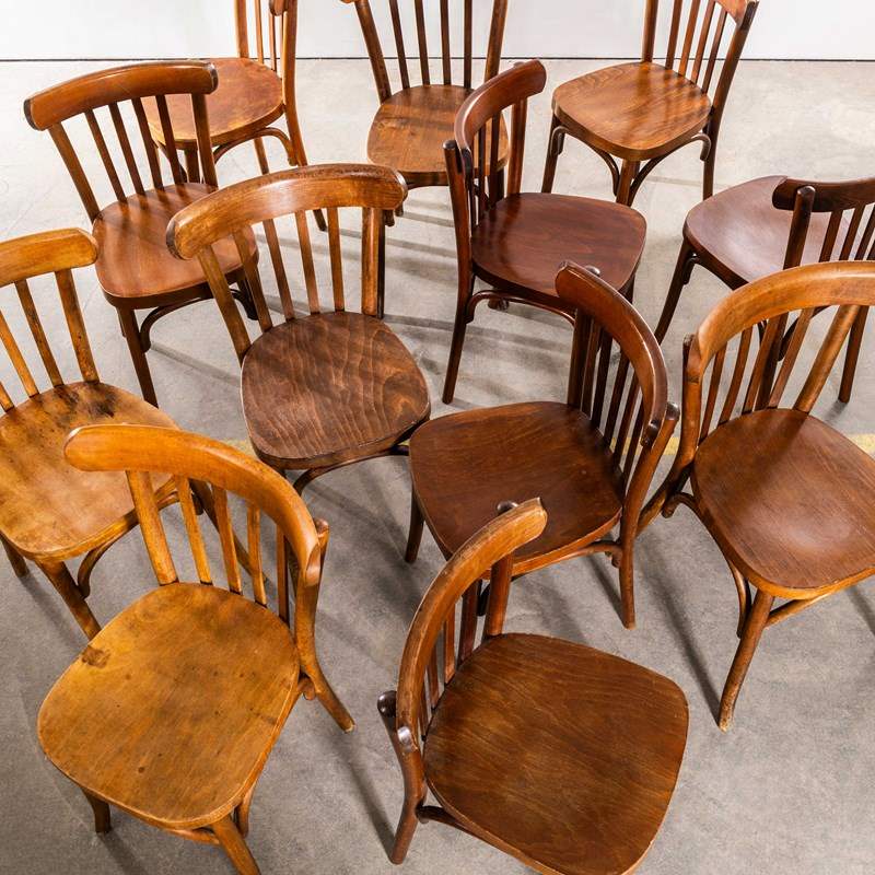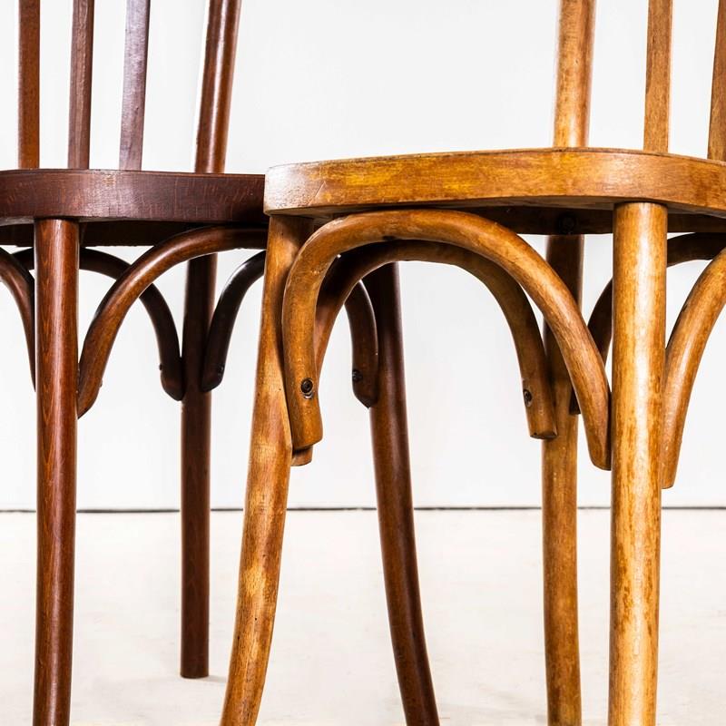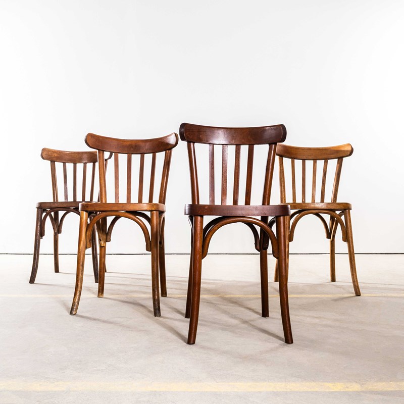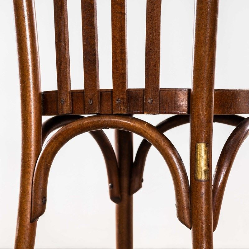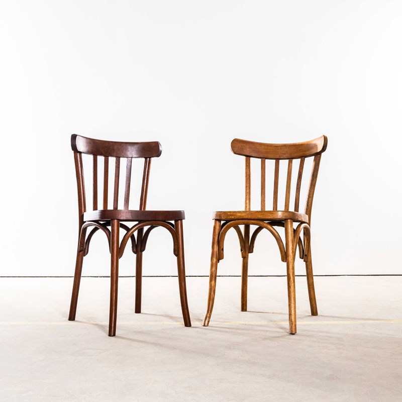 The process of steam bending beech to create elegant chairs was discovered and developed by Thonet, but when its patents expired in 1869 many companies including Luterma launched production. Luterma was one of the brands marketed by Estonian factory A.M. Luther which was founded in the late 19th Century in Tallinn. Luthers production was principally in Estonia but they also had factories in France for local market production. At the time of the Bauhaus movement Walter Gropius and Marcel Breuer worked with the factory to develop various models. These chairs date from the 1950’s, a simple classic shape with a beautiful colour and elegant shaped backs. Although we are not sure, we believe this mixed set to be Luterma. We service and rejuvenate each chair before it leaves our workshop and we deliver chairs of excellent quality.