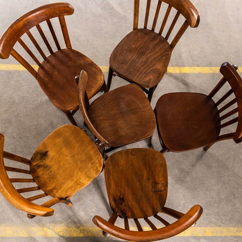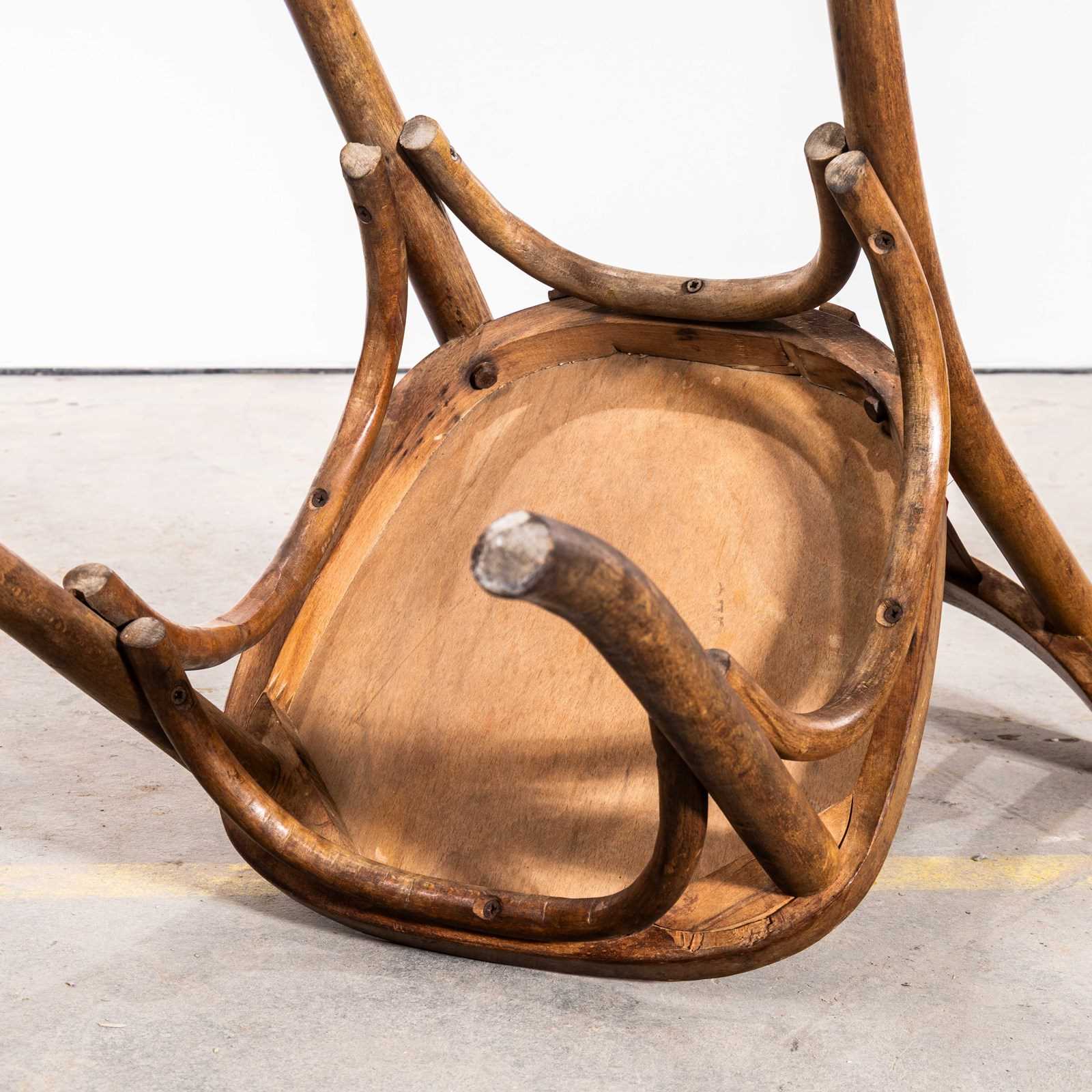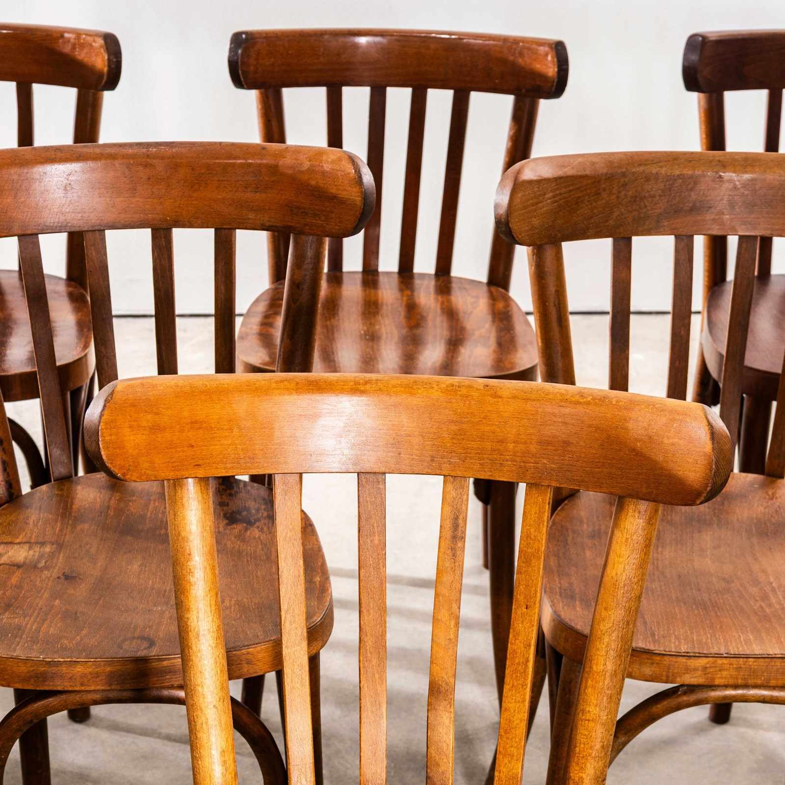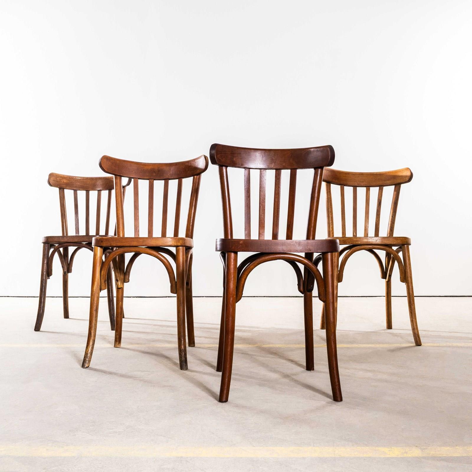 The process of steam bending beech to create elegant chairs was discovered and developed by Thonet, but when its patents expired in 1869 many companies including Luterma launched production. Luterma was one of the brands marketed by Estonian factory A.M. Luther which was founded in the late 19th Century in Tallinn. Luthers production was principally in Estonia but they also had factories in France for local market production. At the time of the Bauhaus movement Walter Gropius and Marcel Breuer worked with the factory to develop various models. These chairs date from the 1950’s, a simple classic shape with a beautiful colour and elegant shaped backs. Although we are not sure, we believe this mixed set to be Luterma. We service and rejuvenate each chair before it leaves our workshop and we deliver chairs of excellent quality.