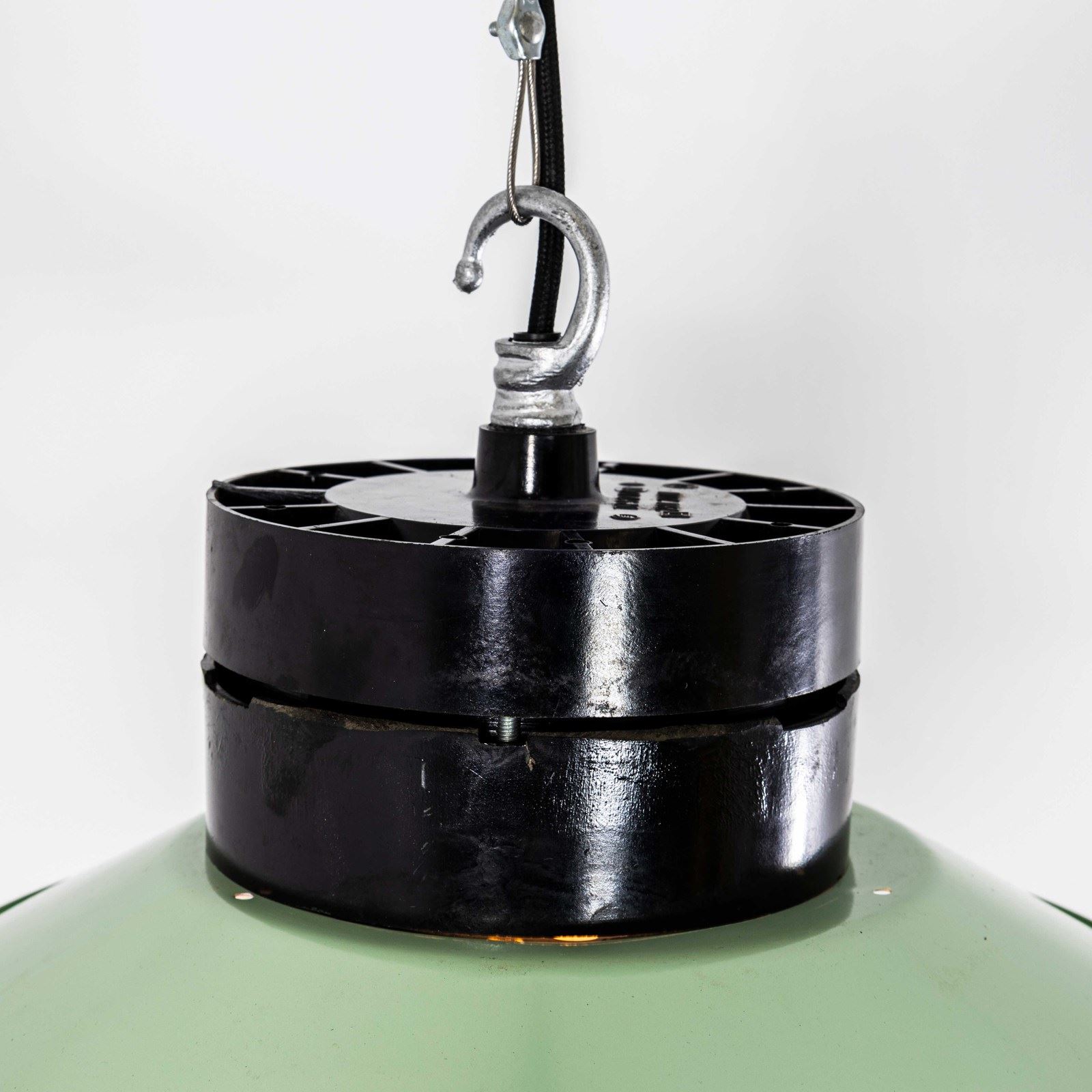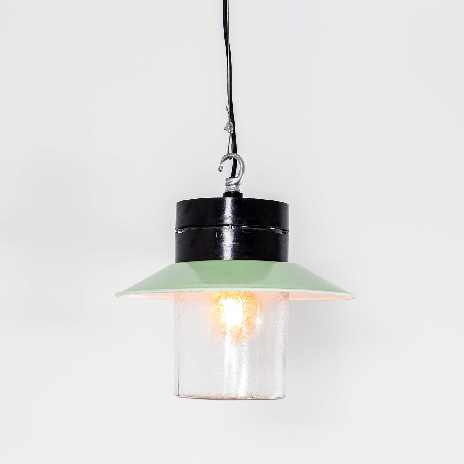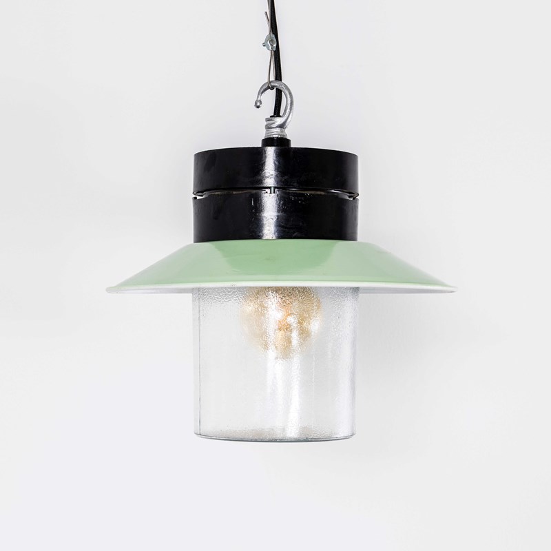 Please note in this design there are a number of slightly different glass domes, each design is listed separately. Sourced in Eastern Europe the lamps are completely original with bold Bakelite tops, an enamelled mint green shade and cast glass domes. Each lamp has been cleaned and restored and all electrical components have been removed and replaced with modern European CE standard components to BS EN 60598. Each lamp is individually tested and labelled to BS EN 60598. INCLUDED: Each lamp comes completely wired and ready to install including; 2 metres of wire for hanging the lamps, 2 metres of black silk covered electrical cable and a ceiling hook as shown. We can also supply more than 2 metres of hanging cable/wire/chain etc. as required, please contact us separately to discuss. The lamp is fitted with a standard E27 threaded lamp holder for which a wide range of modern and vintage style filament bulbs are widely available. We do not currently sell bulbs and recommend LED bulbs 6W maximum. We are specialists in refurbishment of vintage lighting, please contact us with any questions regarding purchase or installation. The lamp is currently wired and fitted for UK and EU compliance. The lamp can be wired for compliance in the US or any global market. Listing is for one lamp.