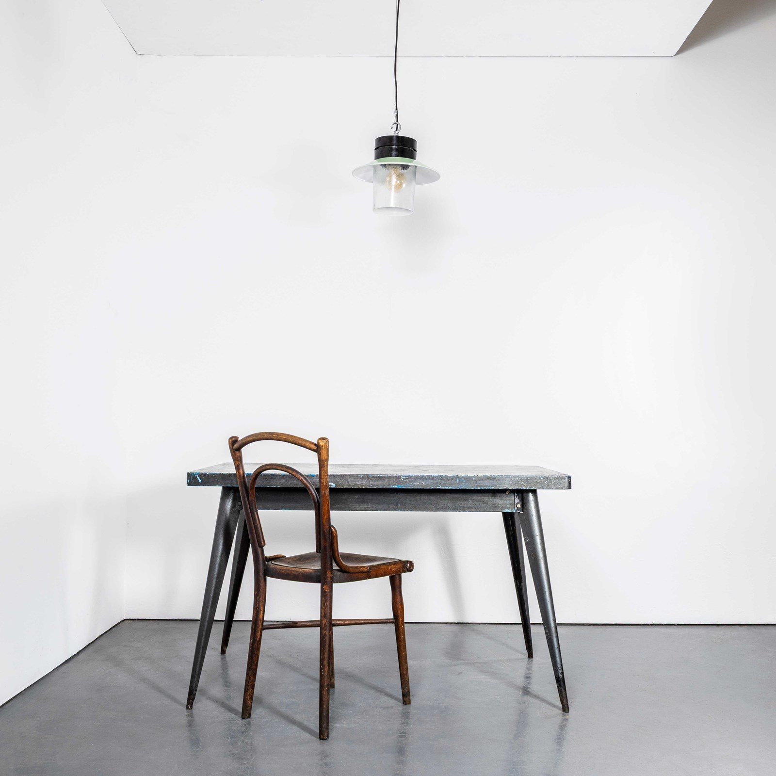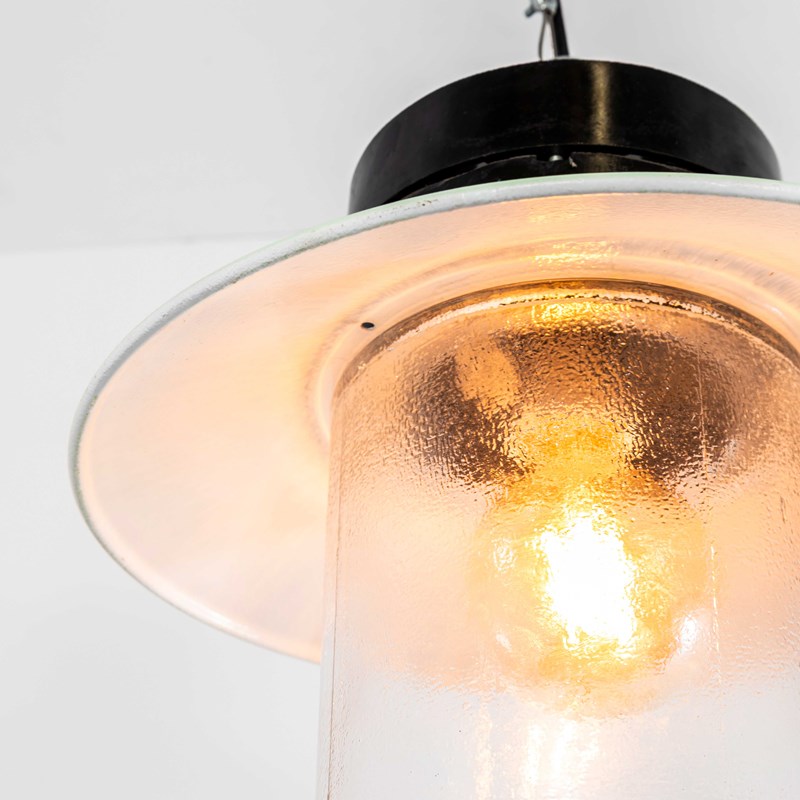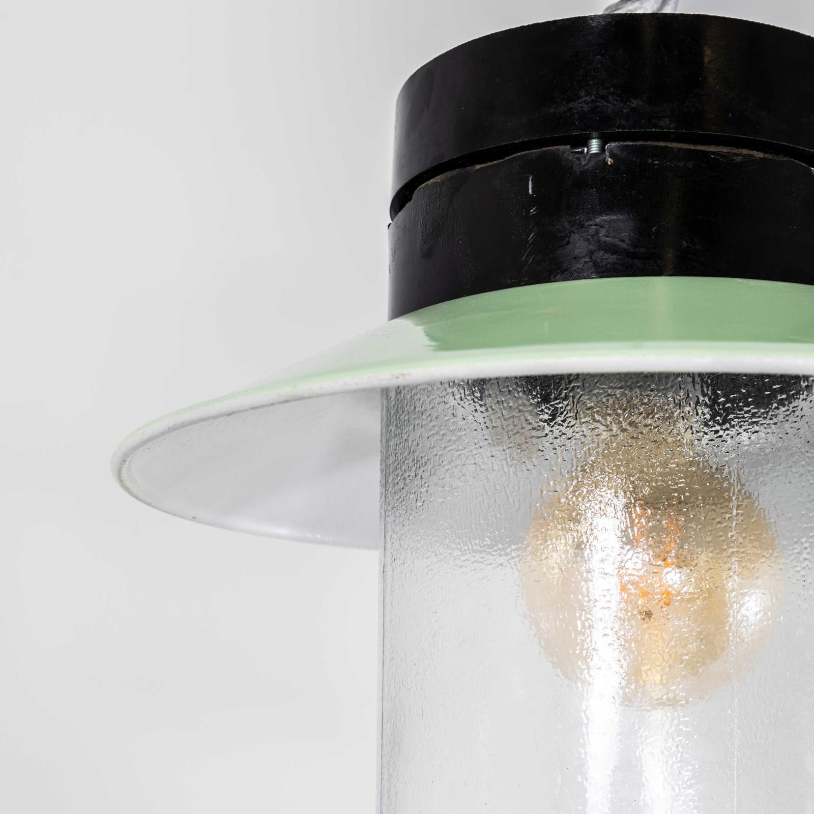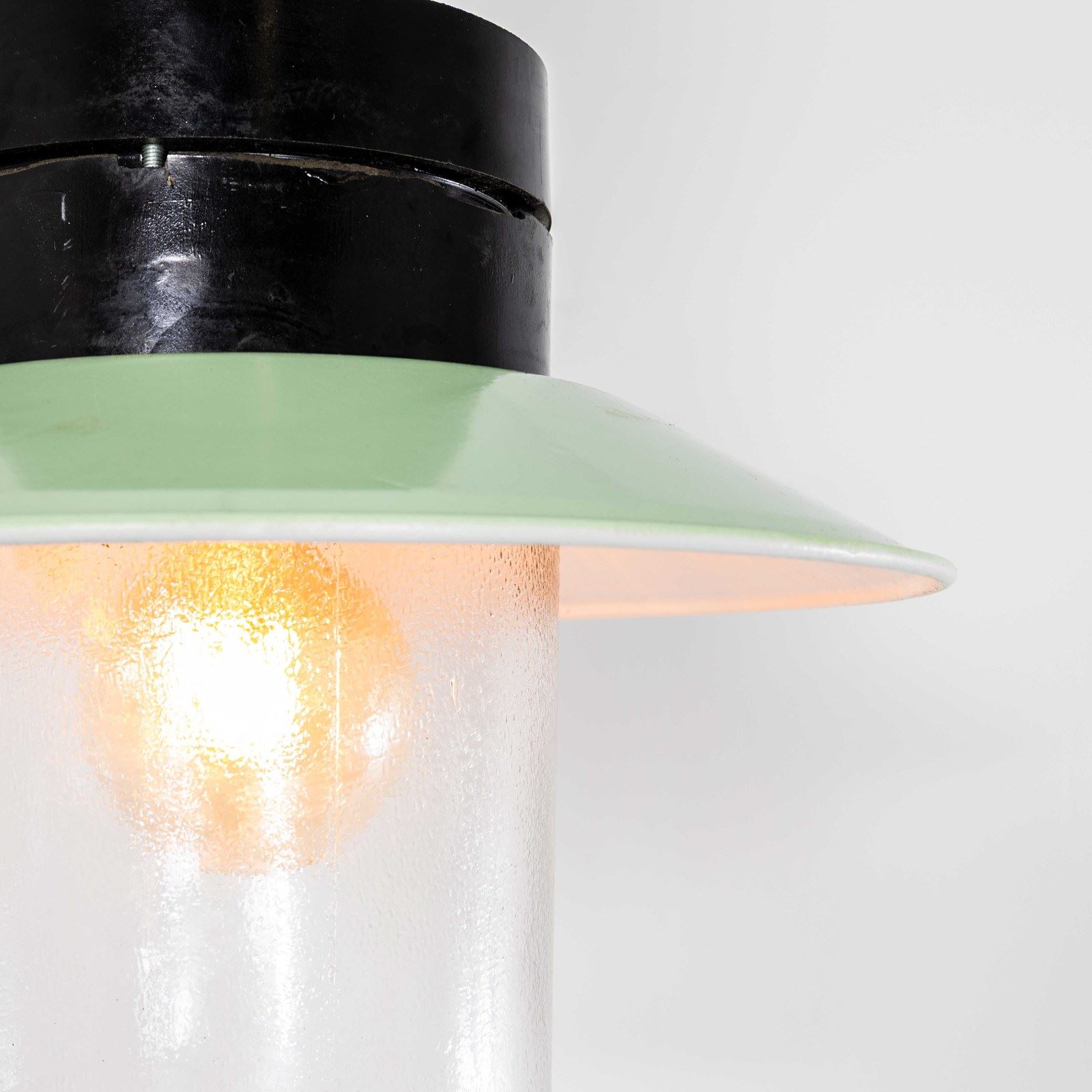 Please note in this design there are a number of slightly different glass domes, each design is listed separately. Sourced in Eastern Europe the lamps are completely original with bold Bakelite tops, an enamelled mint green shade and cast glass domes. Each lamp has been cleaned and restored and all electrical components have been removed and replaced with modern European CE standard components to BS EN 60598. Each lamp is individually tested and labelled to BS EN 60598. INCLUDED: Each lamp comes completely wired and ready to install including; 2 metres of wire for hanging the lamps, 2 metres of black silk covered electrical cable and a ceiling hook as shown. We can also supply more than 2 metres of hanging cable/wire/chain etc. as required, please contact us separately to discuss. The lamp is fitted with a standard E27 threaded lamp holder for which a wide range of modern and vintage style filament bulbs are widely available. We do not currently sell bulbs and recommend LED bulbs 6W maximum. We are specialists in refurbishment of vintage lighting, please contact us with any questions regarding purchase or installation. The lamp is currently wired and fitted for UK and EU compliance. The lamp can be wired for compliance in the US or any global market. Listing is for one lamp.