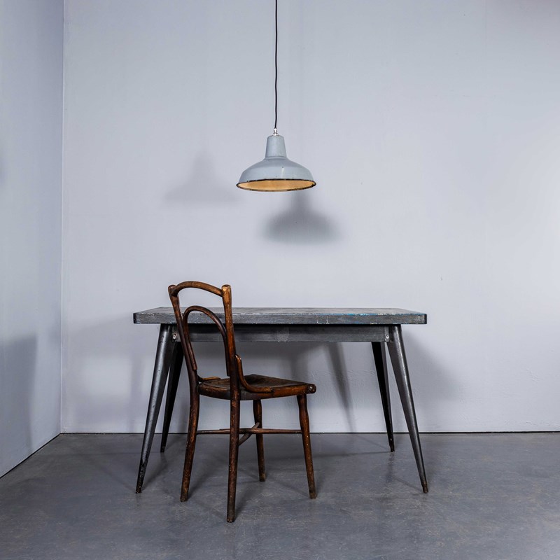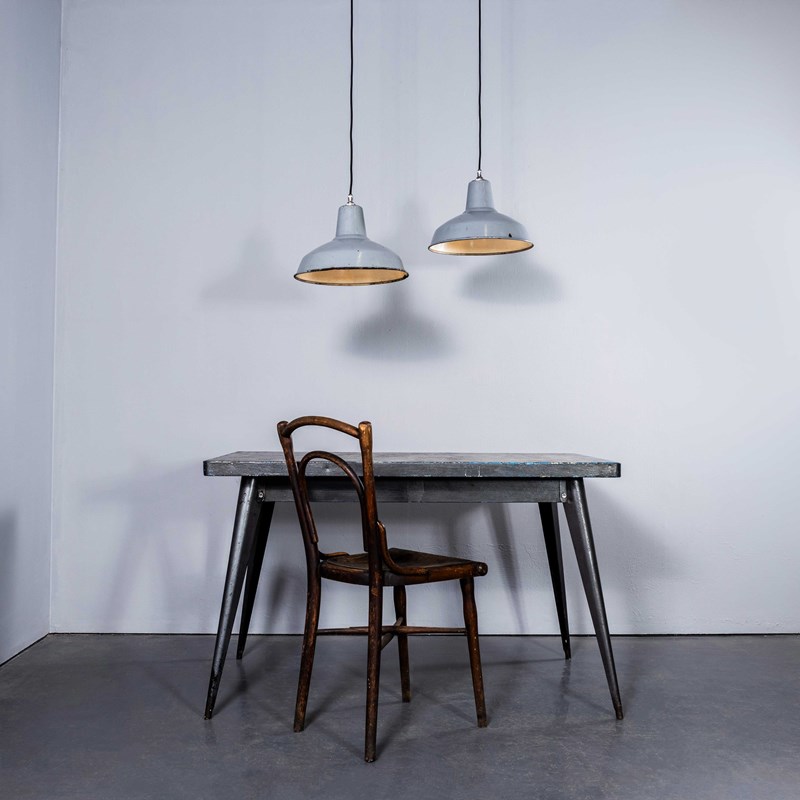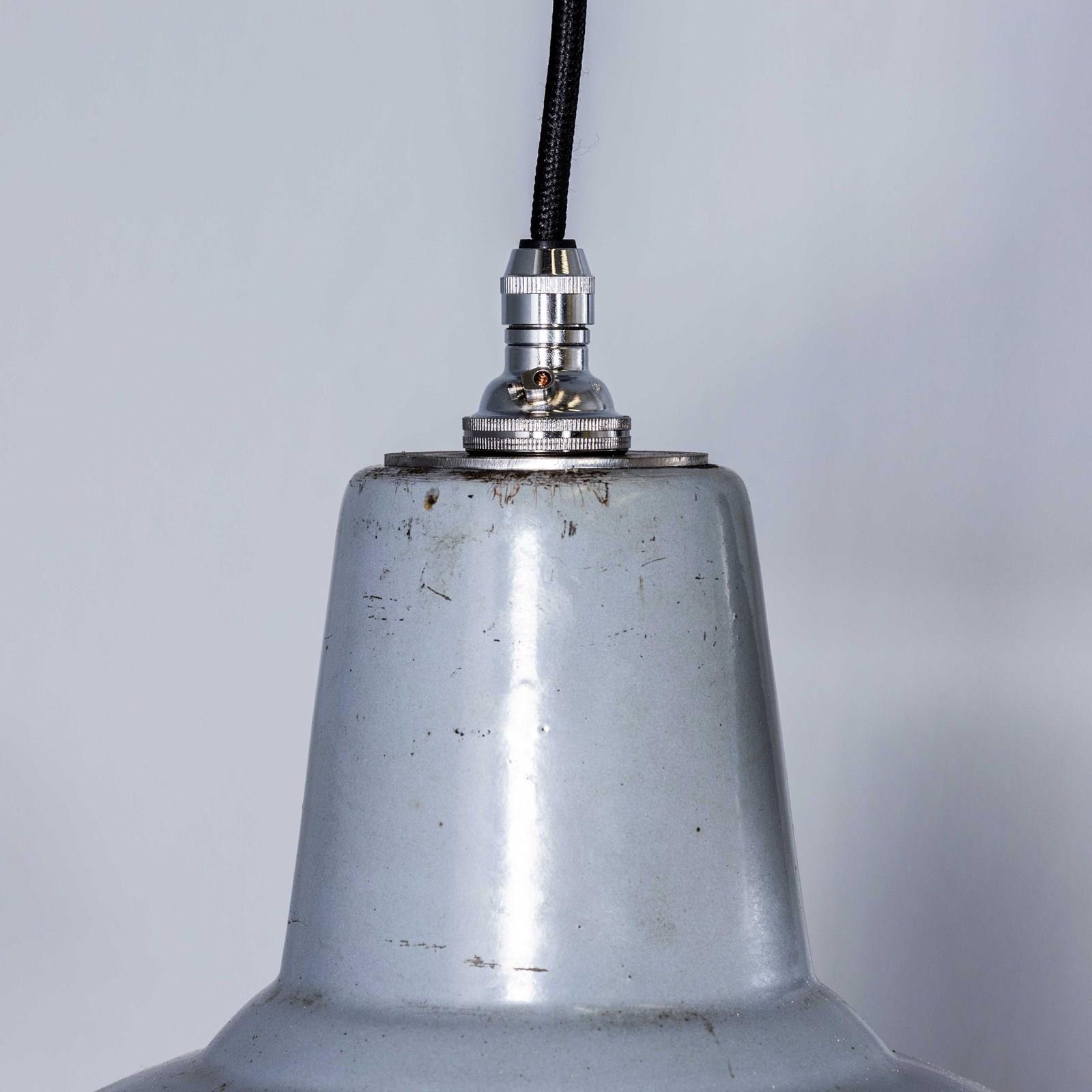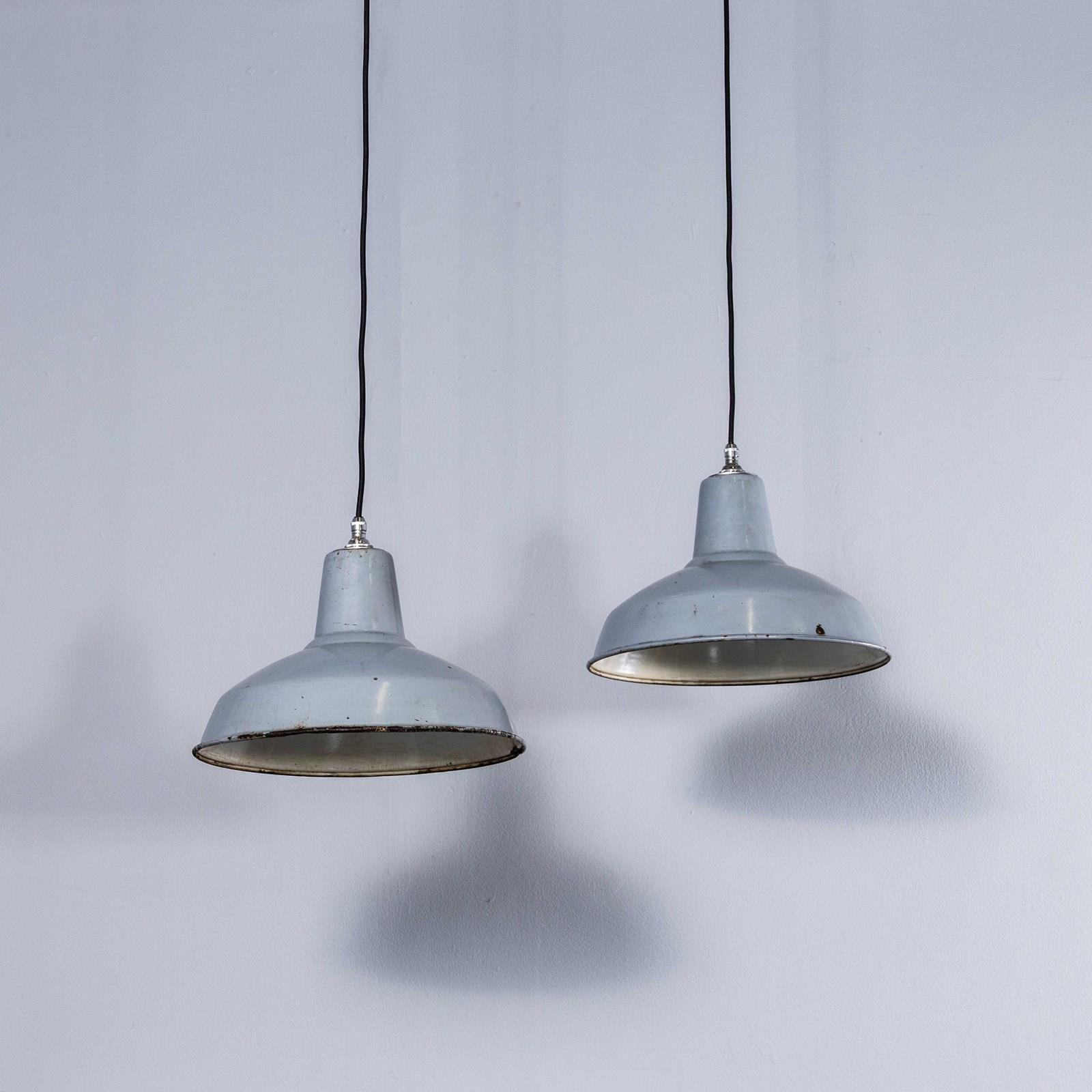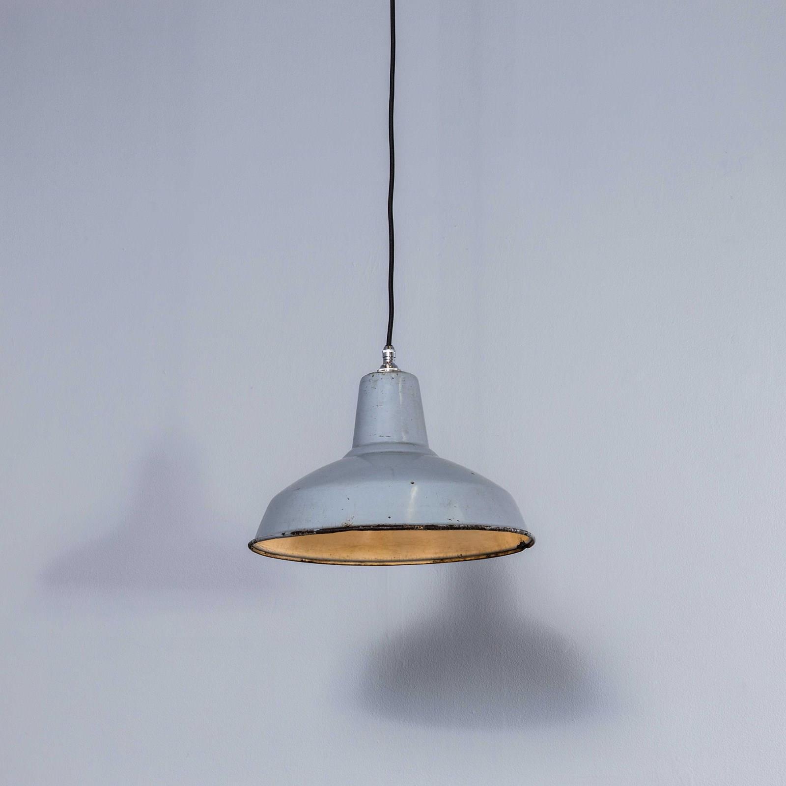 Benjamin was arguably the market leader in industrial lighting in the 1930’s through to 1960’s. Their main market was providing tough enamelled lamps to large factories. These lamps came from a warehouse in Doncaster. The lamps were covered in paint, grease and dirt which was removed to reveal lamps in exceptional original condition. Each lamp has been cleaned and restored and all electrical components have been removed and replaced with modern European CE standard components to BS EN 60598. Each lamp is individually tested and labelled to BS EN 60598. INCLUDED: Each lamp comes completely wired and ready to install with integrated cable clamps allowing the lamps to self hang on the electrical flex. The lamp comes with 2 metres of black silk covered electrical cable and integrated clamp ceiling hook as shown. The lamp is fitted with a standard E27 threaded lamp holder for which a wide range of modern and vintage style filament bulbs are widely available. We do not currently sell bulbs and recommend LED bulbs 6W maximum. We can also supply more than 2 metres of wire as required, please contact us separately to discuss. We are specialists in refurbishment of vintage lighting, please contact us with any questions regarding purchase or installation. The lamp is currently wired and fitted for UK and EU compliance. The lamp can be wired for compliance in the US or any global market.