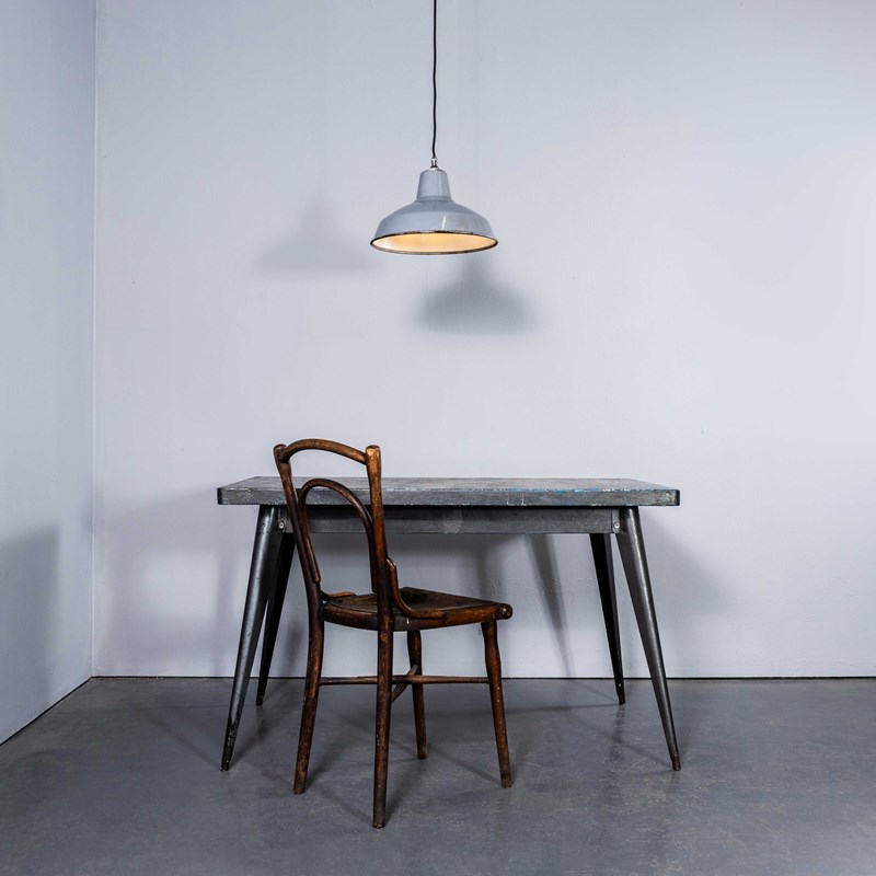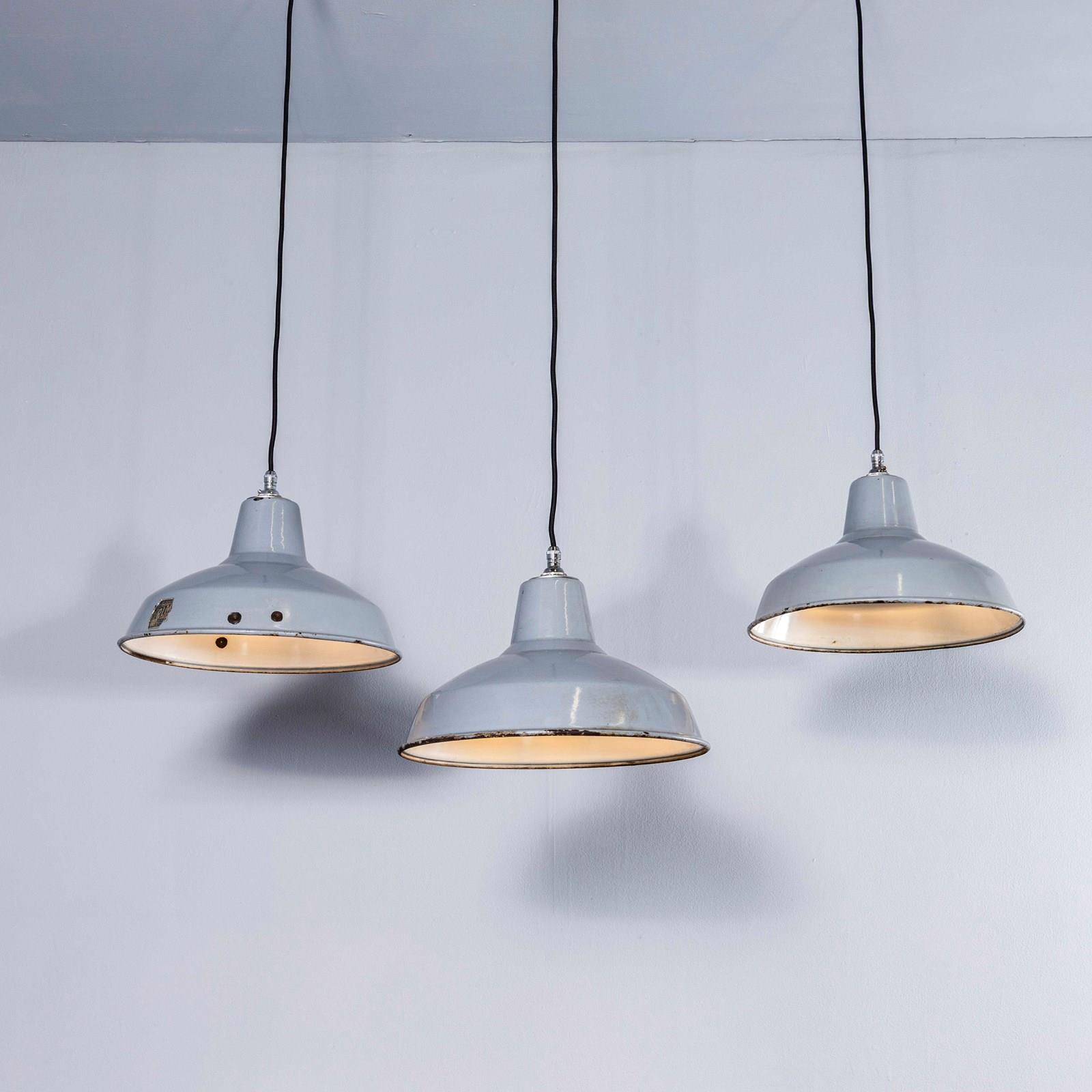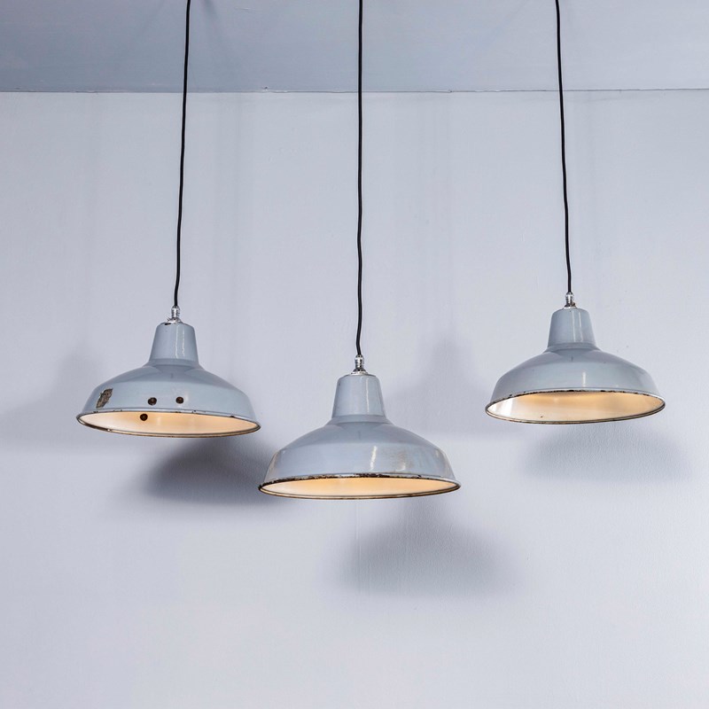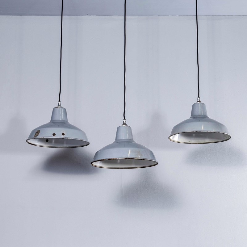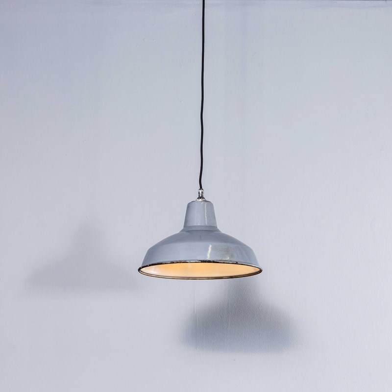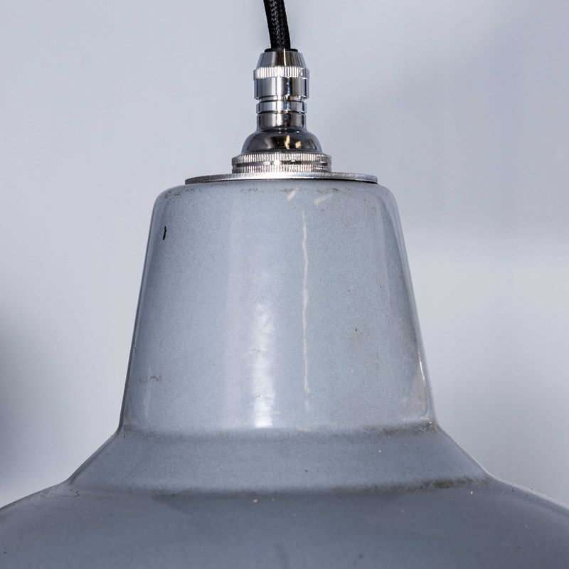 Benjamin was arguably the market leader in industrial lighting in the 1930’s through to 1960’s. Their main market was providing tough enamelled lamps to large factories. These lamps came from a warehouse in Doncaster. The lamps were covered in paint, grease and dirt which was removed to reveal lamps in exceptional original condition. Each lamp has been cleaned and restored and all electrical components have been removed and replaced with modern European CE standard components to BS EN 60598. Each lamp is individually tested and labelled to BS EN 60598. INCLUDED: Each lamp comes completely wired and ready to install with integrated cable clamps allowing the lamps to self hang on the electrical flex. The lamp comes with 2 metres of black silk covered electrical cable and integrated clamp ceiling hook as shown. The lamp is fitted with a standard E27 threaded lamp holder for which a wide range of modern and vintage style filament bulbs are widely available. We do not currently sell bulbs and recommend LED bulbs 6W maximum. We can also supply more than 2 metres of wire as required, please contact us separately to discuss. We are specialists in refurbishment of vintage lighting, please contact us with any questions regarding purchase or installation. The lamp is currently wired and fitted for UK and EU compliance. The lamp can be wired for compliance in the US or any global market.