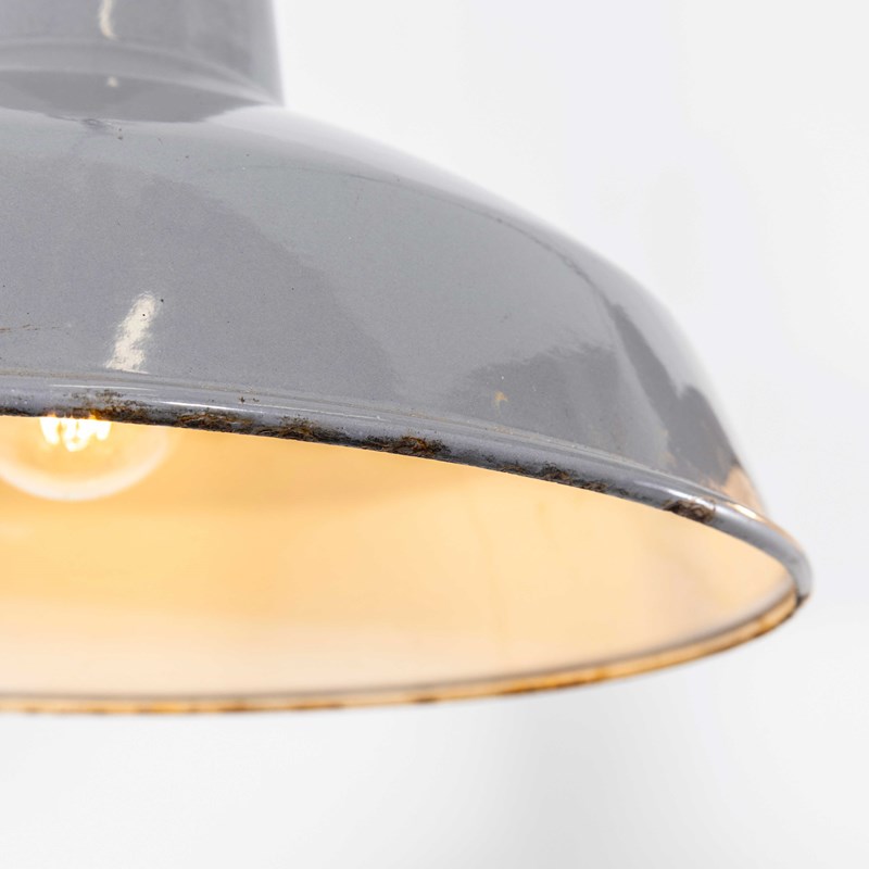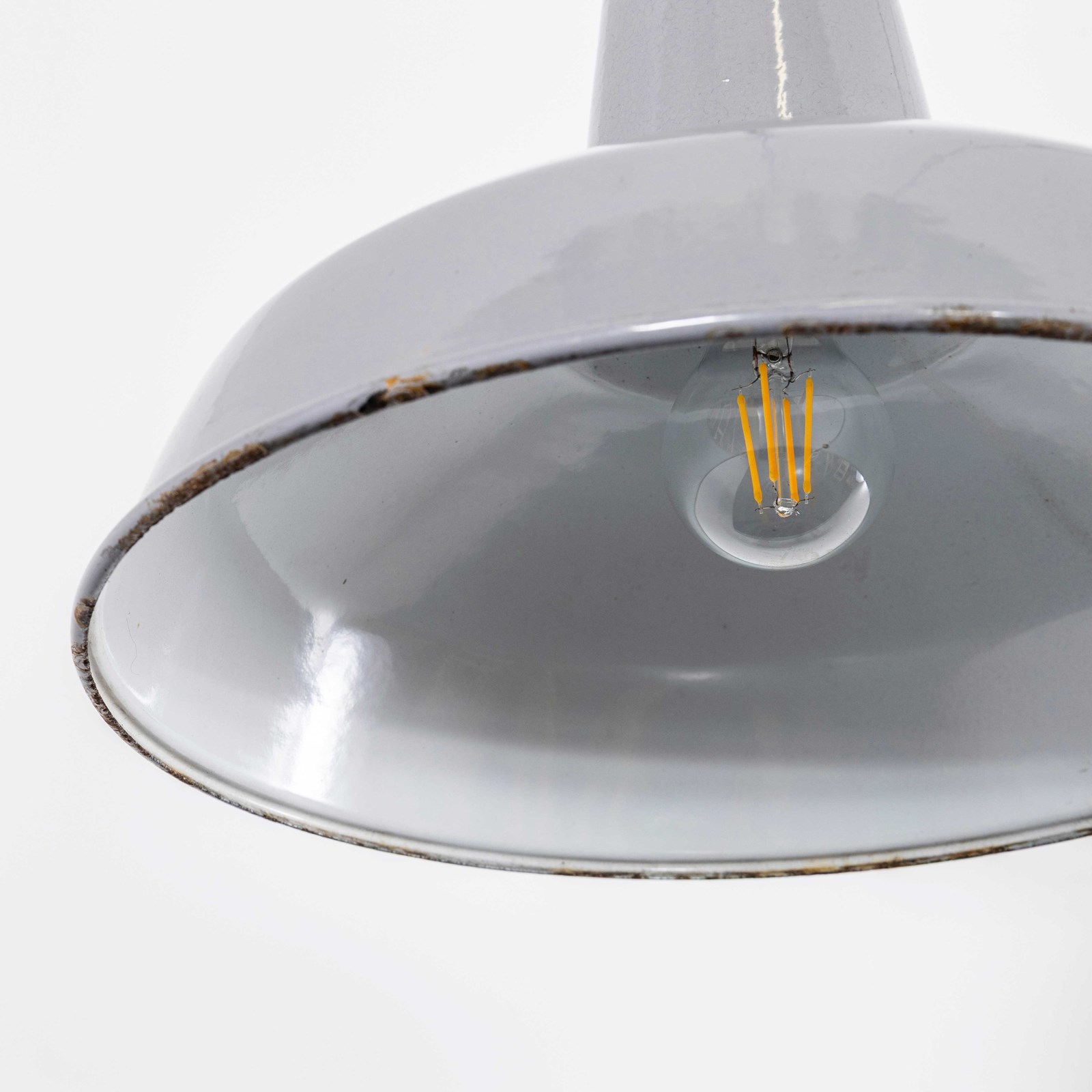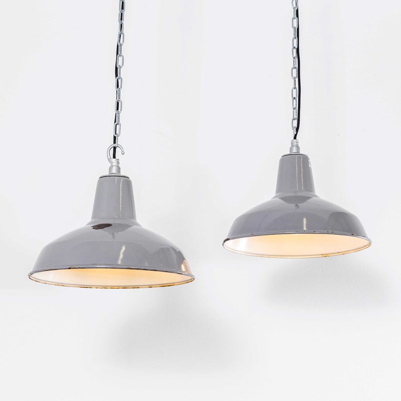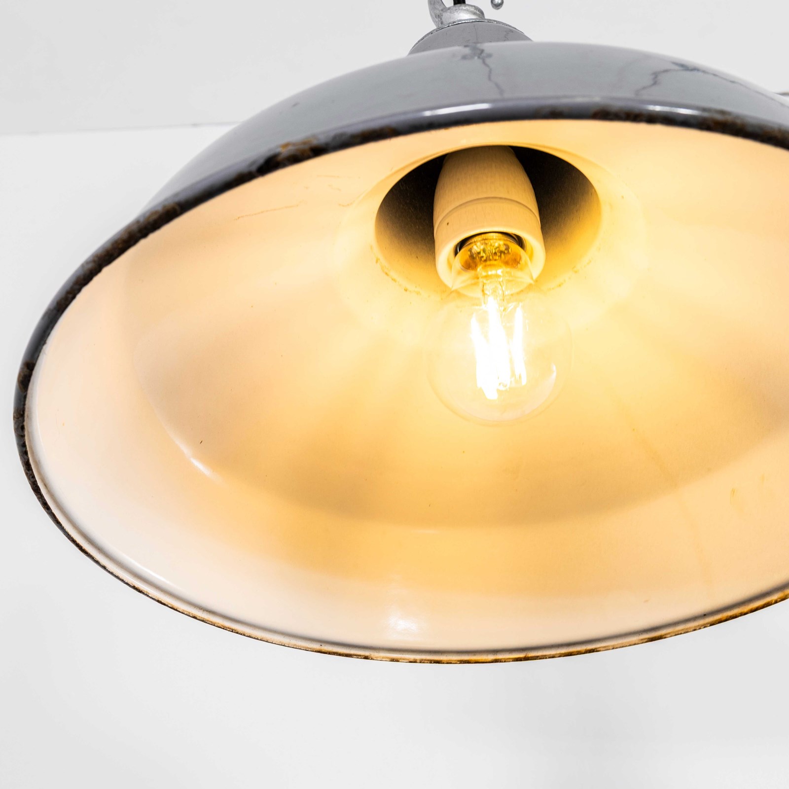 Benjamin was arguably the market leader in industrial lighting in the 1930’s through to 1960’s. Their main market was providing tough enamelled lamps to large factories. These lamps came from the Eastleigh train yards on the South Coast. The Eastleigh yard opened in 1891 and has an illustrious history including producing parts for Blenheim bombers and Horsa gliders for D-Day. Made from spun and enamelled steel the lamps were covered in paint, grease and dirt which was removed to reveal lamps in exceptional original condition. Each lamp has been cleaned and restored and all electrical components have been removed and replaced with modern European CE standard components to BS EN 60598. Each lamp is individually tested and labelled to BS EN 60598. INCLUDED: Each lamp comes completely wired and ready to install including; 2 metres of wire for hanging the lamps, 2 metres of black silk covered electrical cable and a ceiling hook as shown. The lamp is fitted with a standard E27 threaded lamp holder for which a wide range of modern and vintage style filament bulbs are widely available. We do not currently sell bulbs and recommend LED bulbs 6W maximum. We can also supply more than 2 metres of hanging cable/wire/chain etc as required, please contact us separately to discuss. We are specialists in refurbishment of vintage lighting, please contact us with any questions regarding purchase or installation. The lamp is currently wired and fitted for UK and EU compliance. The lamp can be wired for compliance in the US or any global market.
