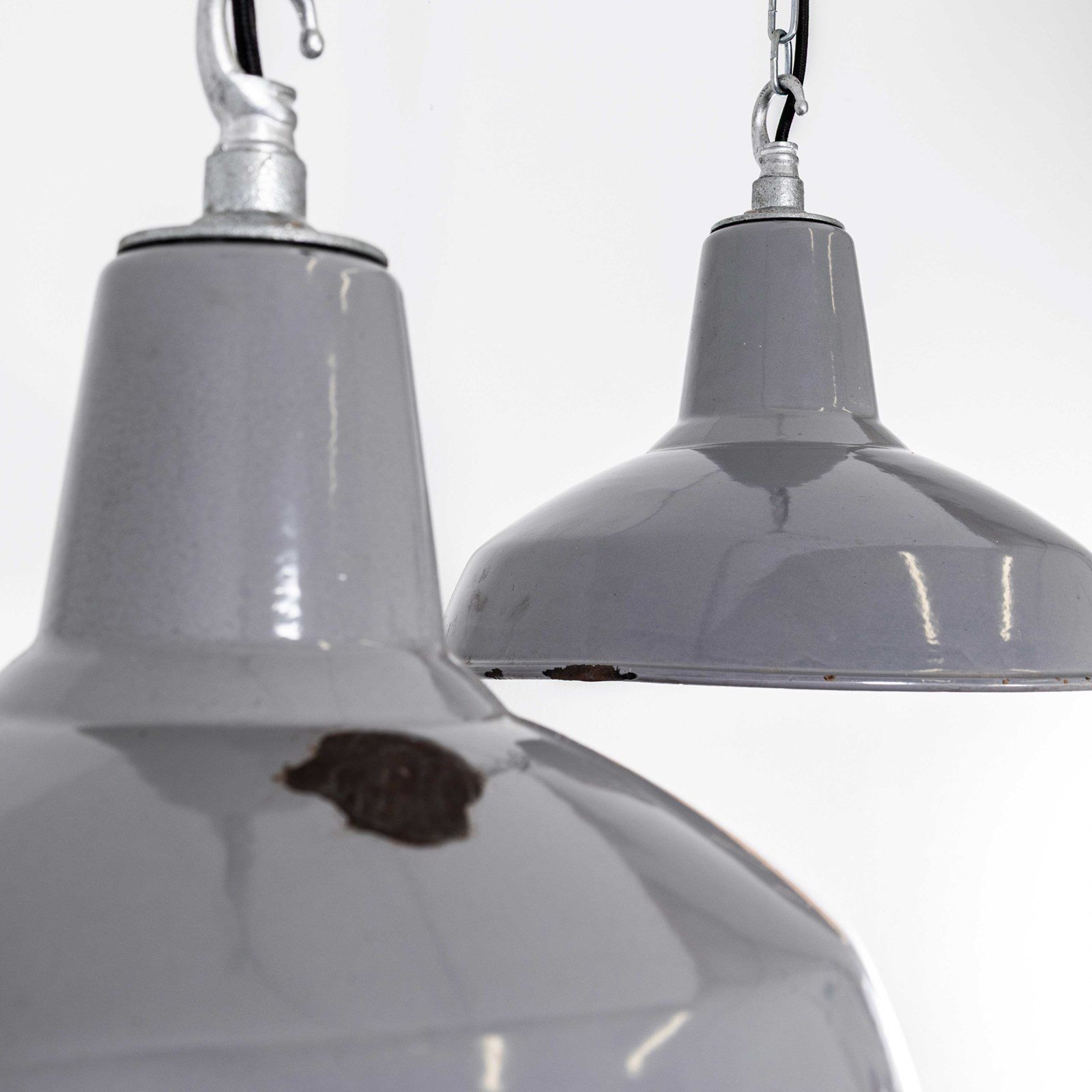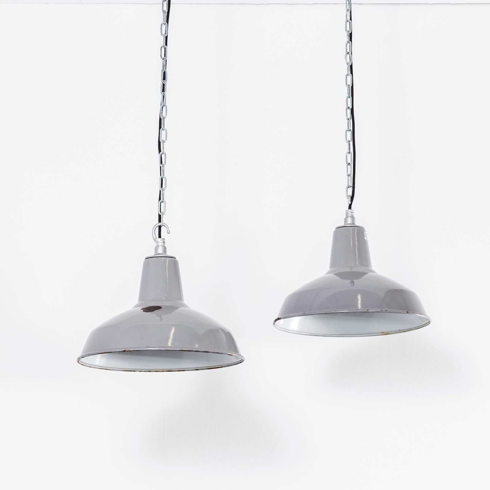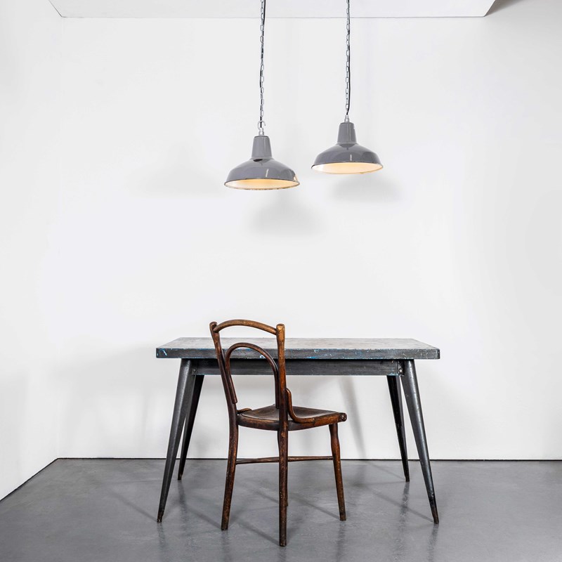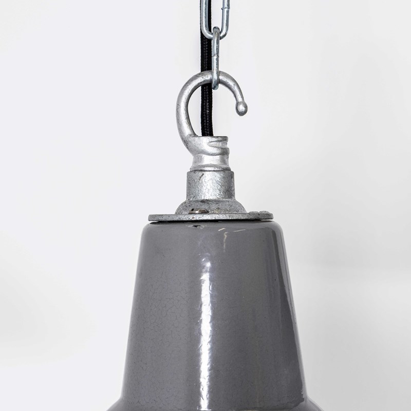 Benjamin was arguably the market leader in industrial lighting in the 1930’s through to 1960’s. Their main market was providing tough enamelled lamps to large factories. These lamps came from the Eastleigh train yards on the South Coast. The Eastleigh yard opened in 1891 and has an illustrious history including producing parts for Blenheim bombers and Horsa gliders for D-Day. Made from spun and enamelled steel the lamps were covered in paint, grease and dirt which was removed to reveal lamps in exceptional original condition. Each lamp has been cleaned and restored and all electrical components have been removed and replaced with modern European CE standard components to BS EN 60598. Each lamp is individually tested and labelled to BS EN 60598. INCLUDED: Each lamp comes completely wired and ready to install including; 2 metres of wire for hanging the lamps, 2 metres of black silk covered electrical cable and a ceiling hook as shown. The lamp is fitted with a standard E27 threaded lamp holder for which a wide range of modern and vintage style filament bulbs are widely available. We do not currently sell bulbs and recommend LED bulbs 6W maximum. We can also supply more than 2 metres of hanging cable/wire/chain etc as required, please contact us separately to discuss. We are specialists in refurbishment of vintage lighting, please contact us with any questions regarding purchase or installation. The lamp is currently wired and fitted for UK and EU compliance. The lamp can be wired for compliance in the US or any global market.