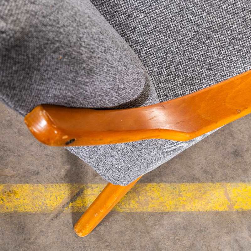 Sourced direct in the Czech republic this is one of Šmídek’s most elegant designs for Jitona. The frames are beech throughout and are in excellent condition. The chairs have been reupholstered in a new cotton linen grey marl fabric, the internal foam and components have been checked and replaced as required by our workshop team. To comply with UK fire regulations the internal components are covered in a flame retardant barrier cloth.