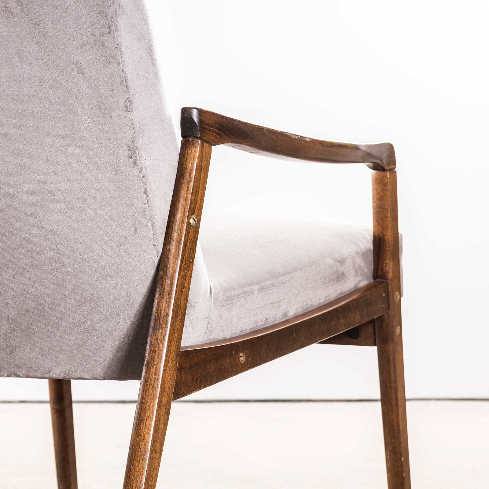 Sourced direct in the Czech republic this is one of Smidek’s most elegant designs. We carefully select very original armchairs ensuring the frames are in excellent original condition and then reupholster them. The frame is beech throughout and the arms have been cleaned and waxed but retain their original character. The upholstery is a new cotton velvet which has been reupholstered by us. When reupholstering we inspect all internal components and replace as required. To comply with UK fire regulations the internal components are covered in a flame retardant barrier cloth. Seat Height: 41cm.