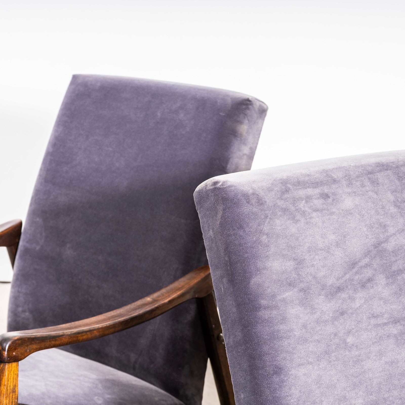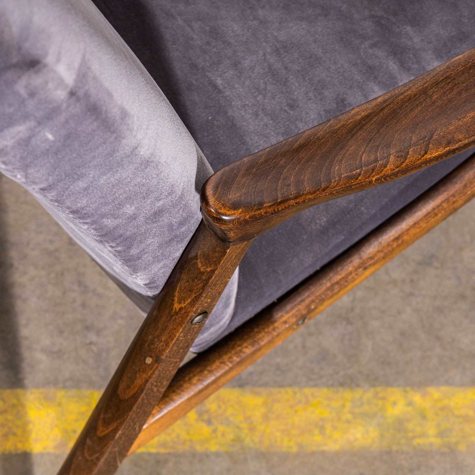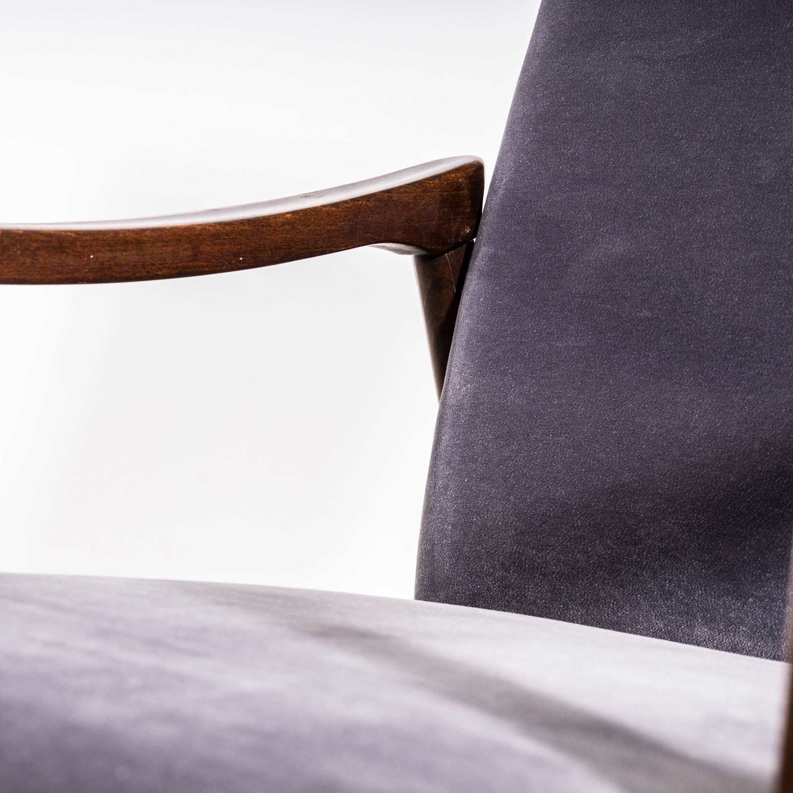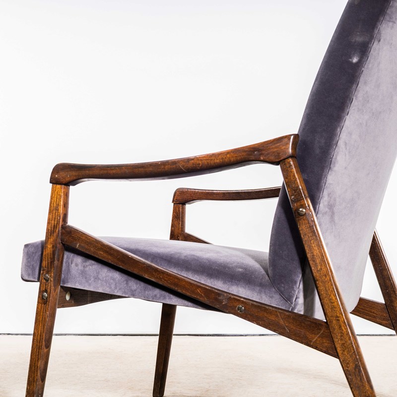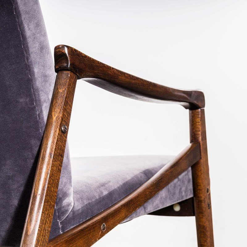 Sourced direct in the Czech republic this is one of Smidek’s most elegant designs. We carefully select very original armchairs ensuring the frames are in excellent original condition and then reupholster them. The frame is beech throughout and the arms have been cleaned and waxed but retain their original character. The upholstery is a new grey cotton velvet which has been reupholstered by us. When reupholstering we inspect all internal components and replace as required. To comply with UK fire regulations the internal components are covered in a flame retardant barrier cloth.