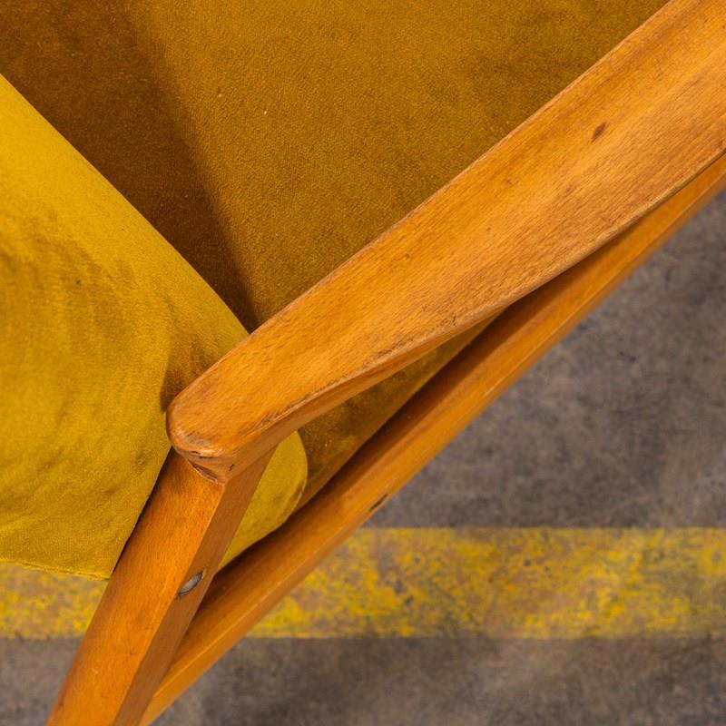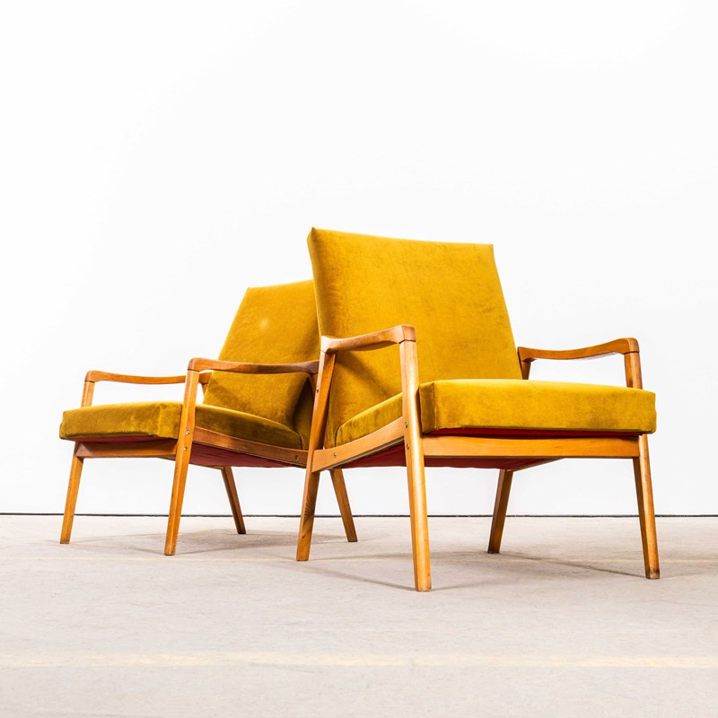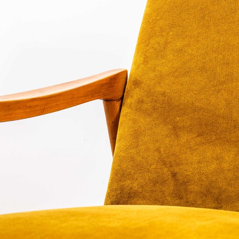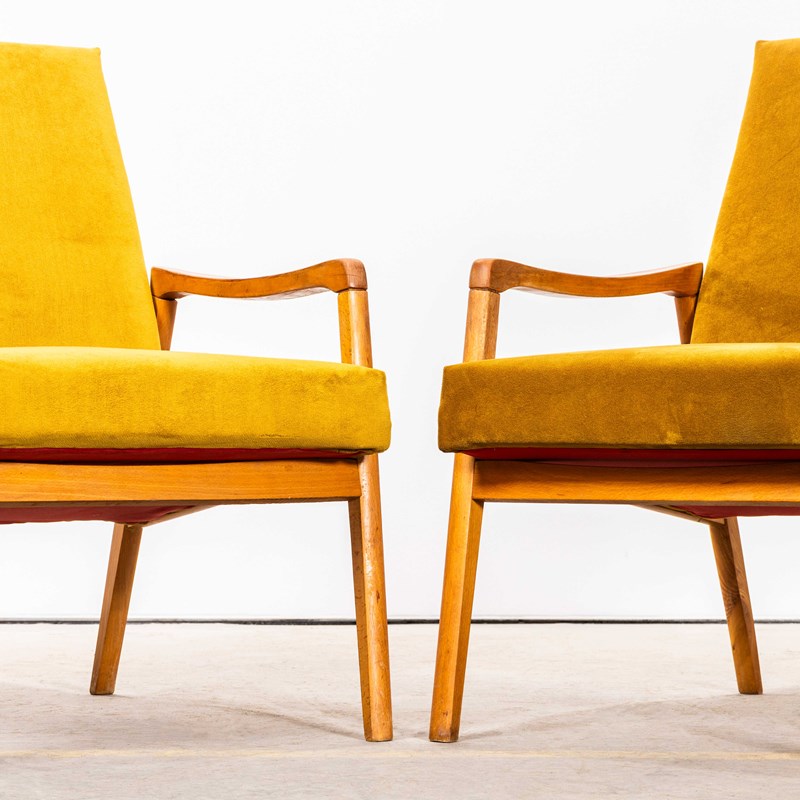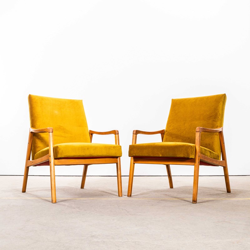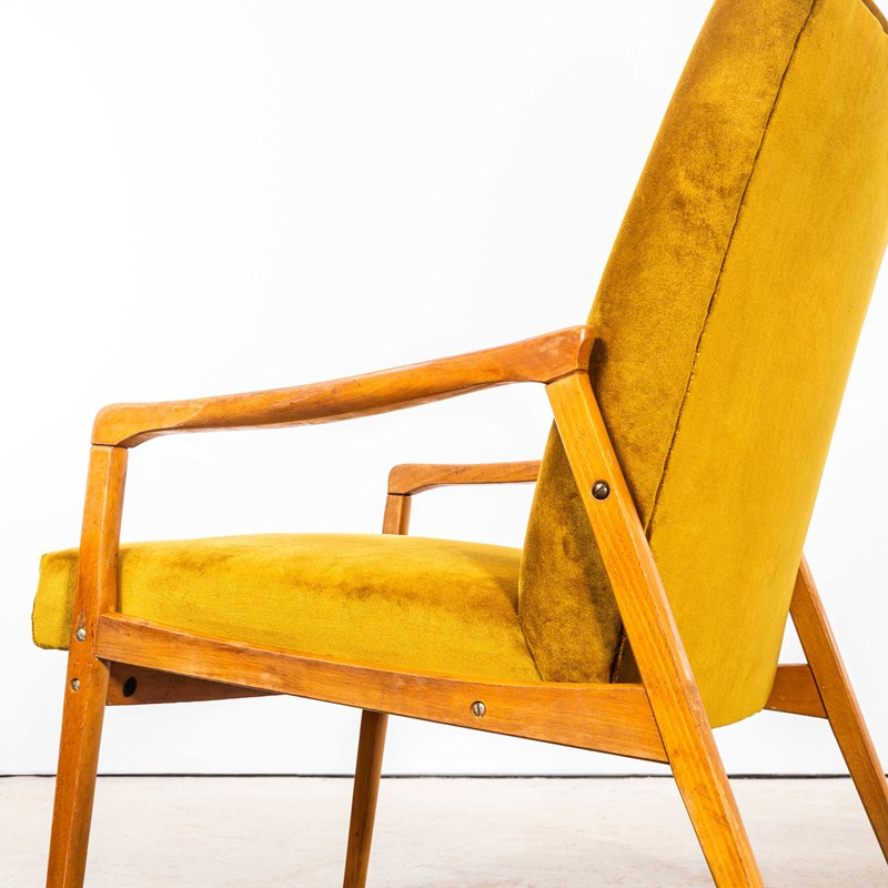 Sourced direct in the Czech republic this is one of Smidek’s most elegant designs. We carefully select very original armchairs ensuring the frames are in excellent original condition and then reupholster them. The frame is beech throughout and the arms have been cleaned and waxed but retain their original character. The upholstery is a new mustard cotton velvet which has been reupholstered by us. When reupholstering we inspect all internal components and replace as required. To comply with UK fire regulations the internal components are covered in a flame retardant barrier cloth.