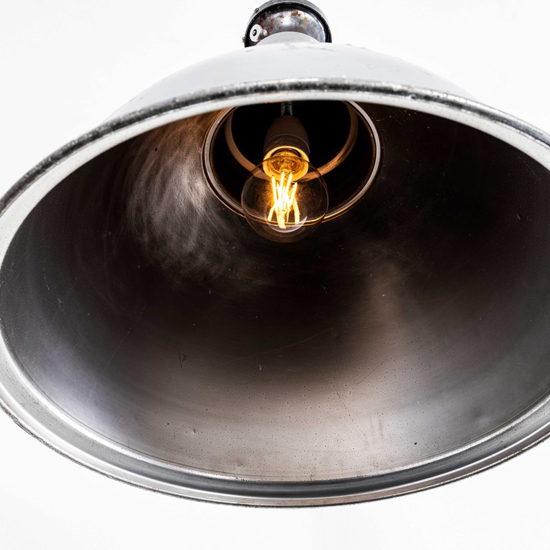 Sadly we don’t know the manufacturer, the lamp is made from spun and painted aluminium with intricate cast aluminium tops. The lamp has been cleaned, but we left the history of paint scars, all electrical components have been removed and replaced with modern European CE standard components to BS EN 60598. Each lamp is individually tested and labelled to BS EN 60598. INCLUDED: The lamp comes completely wired and ready to install including; 2 metres of chain for hanging the lamps, 2 metres of black silk covered electrical cable and a ceiling hook as shown. The lamp is fitted with a standard E27 threaded lamp holder for which a wide range of modern and vintage style filament bulbs are widely available. We do not currently sell bulbs and recommend LED bulbs 6W maximum. We select the best colour/style of cable for each lamp but additional colours are available for different projects. Our alternative cable colours (in stock) are as shown in the images with numbered cables. If you wish to select a different cable colour please state the colour number in the comments at checkout. Additional special order colours are available and we can also supply more than 2 metres of hanging cable/wire/chain etc as required, please contact us separately to discuss. We are specialists in refurbishment of vintage lighting, please contact us with any questions regarding purchase or installation. Listing is for one lamp only. The lamp is currently wired and fitted for UK and EU compliance. The lamp can be wired for compliance in the US or any global market.