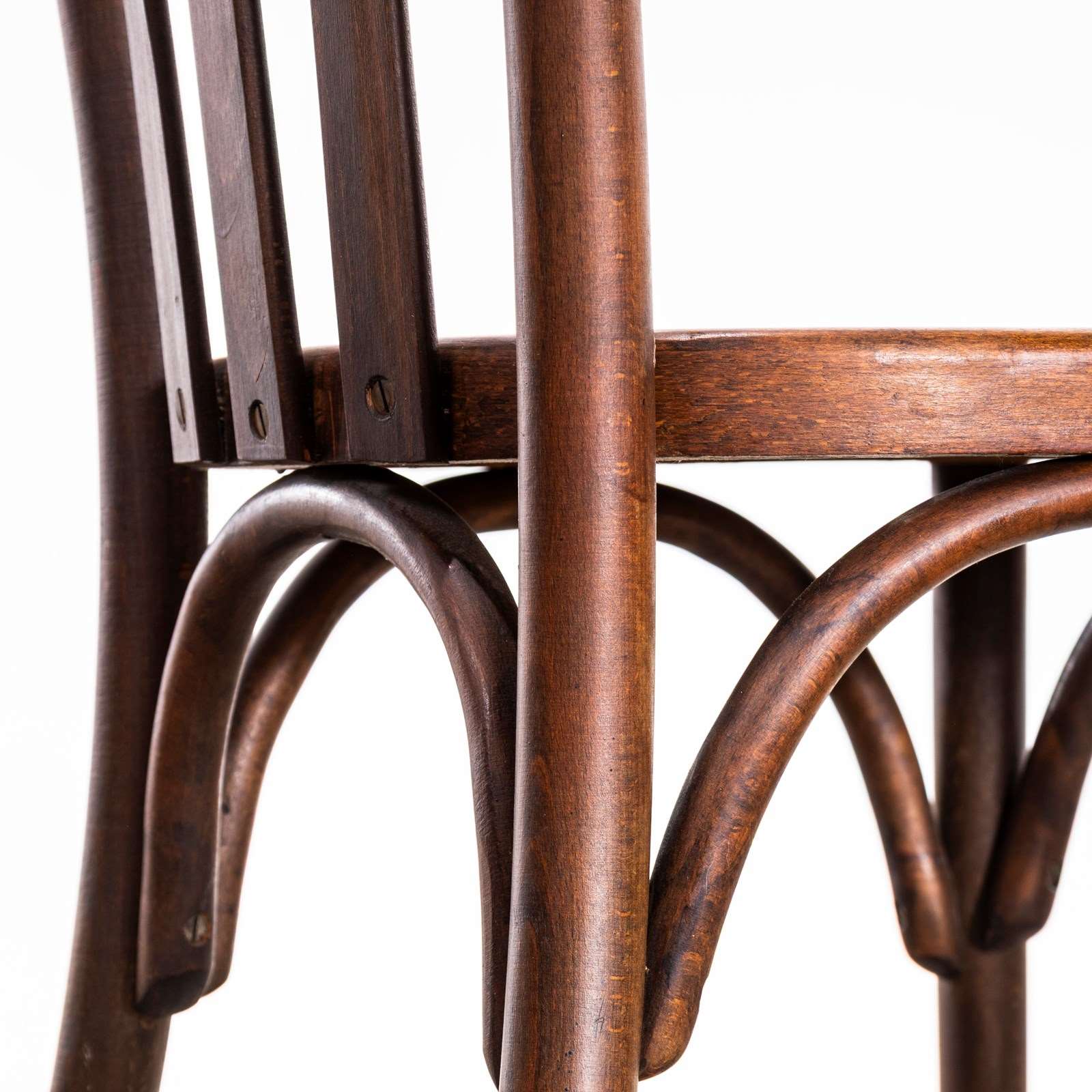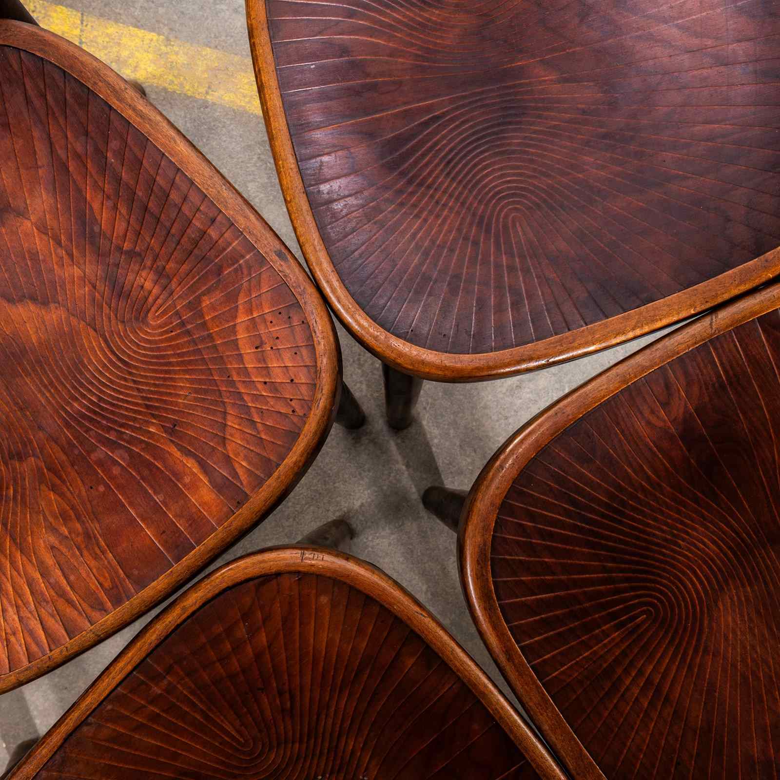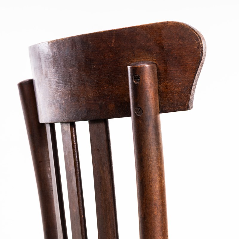 The process of steam bending beech to create elegant chairs was discovered and developed by Thonet, but when its patents expired in 1869 many companies including Luterma launched production. Luterma was one of the brands marketed by Estonian factory A.M. Luther which was founded in the late 19th Century in Tallinn. Luthers production was principally in Estonia but they also had factories in France for local market production. At the time of the Bauhaus movement Walter Gropius and Marcel Breuer worked with the factory to develop various models. These chairs date from the 1950’s, a simple classic shape with a beautiful colour and elegant shaped backs. The seats have been stamped with a stunning curvaceous design. We service and rejuvenate each chair before it leaves our workshop and we deliver chairs of excellent quality.