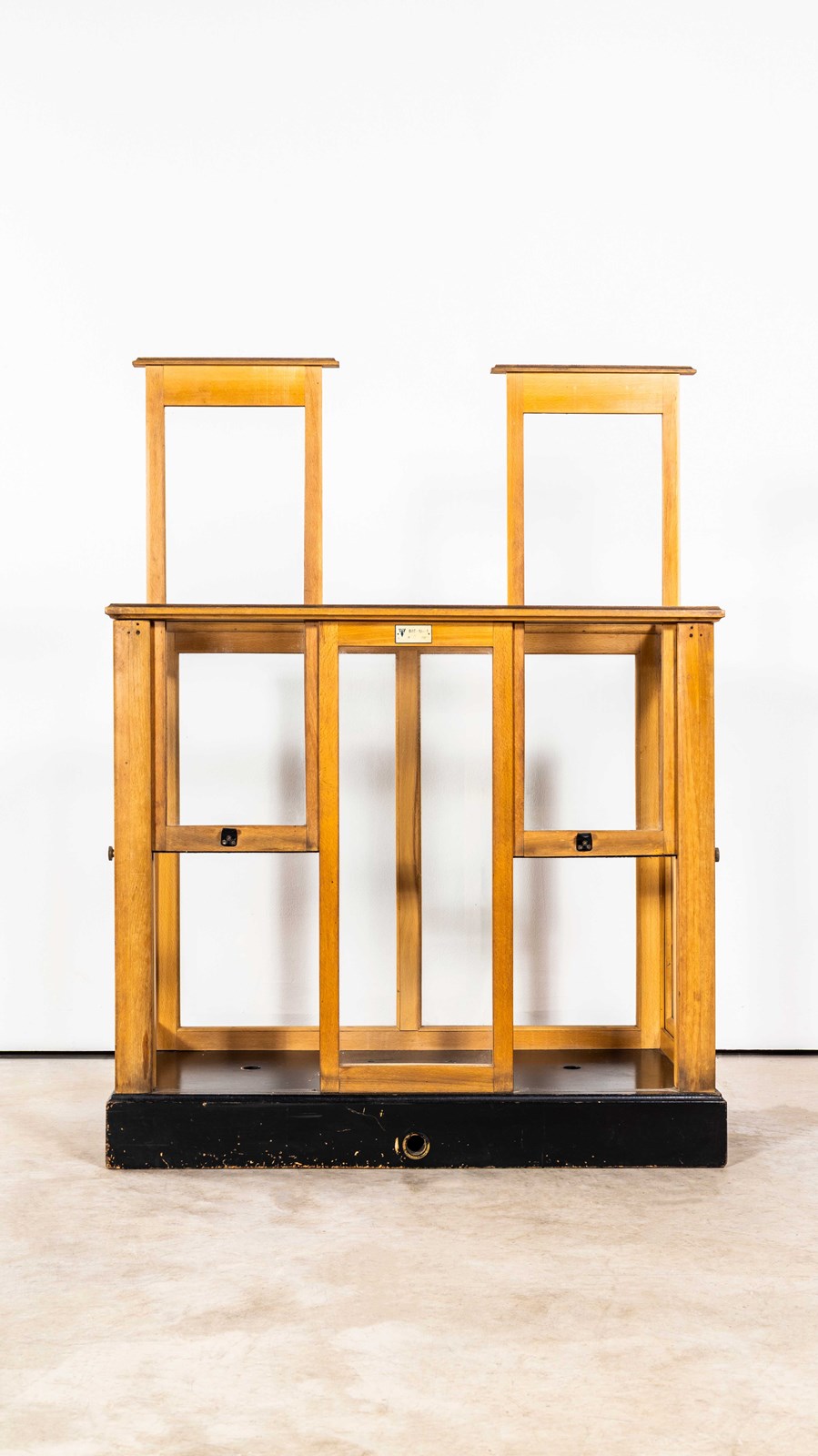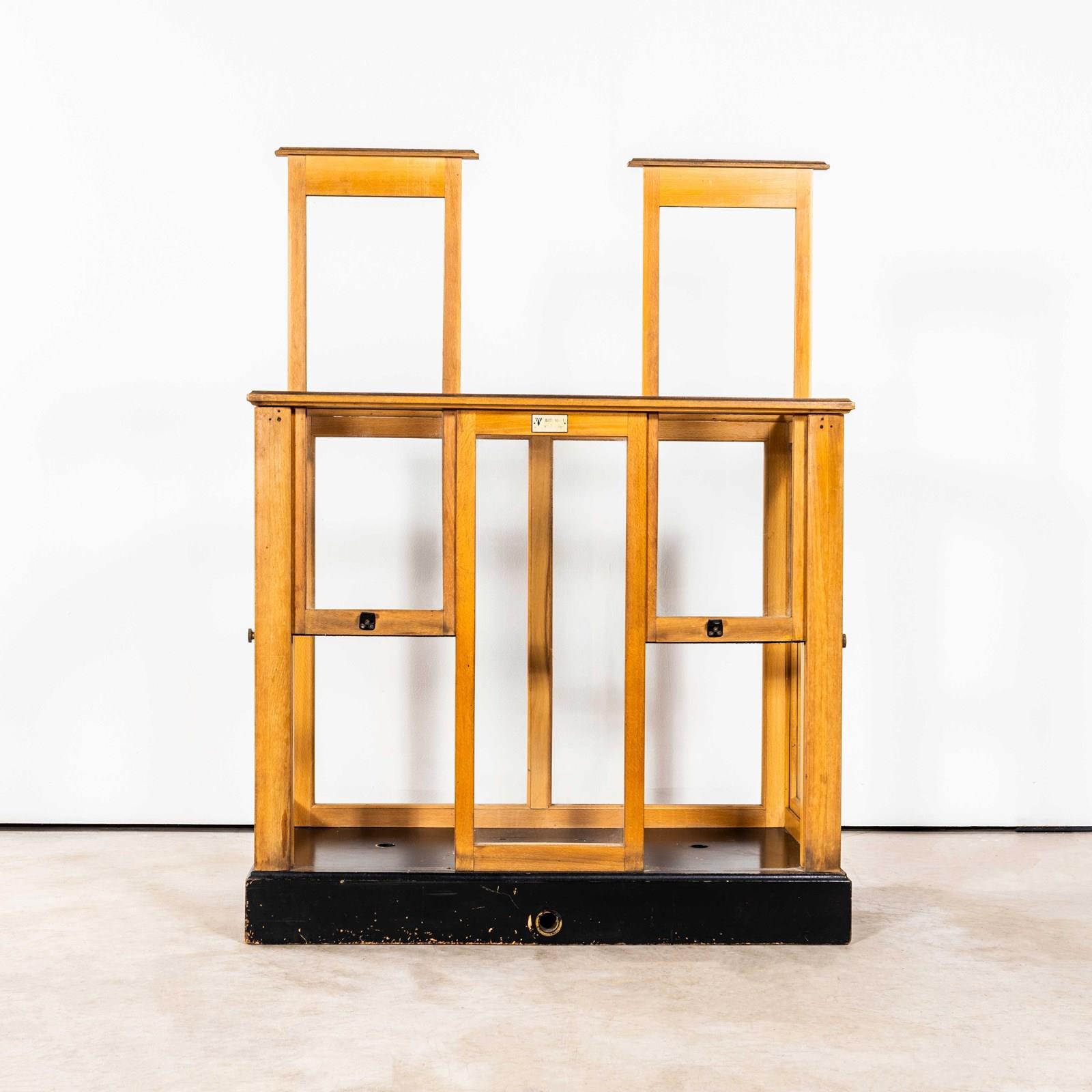 We salvaged a number of well made display cases previously used to house balance scales at the VEF factory in Latvia. The scales were used to check the accuracy of the master weights used throughout a factory. The VEF factory was an ex Soviet factory famous in the 30’s for making the worlds smallest spy camera and then in the 50’s it produced most of Soviet Russia’s radios and telephones. The display cases are great practical pieces for displaying larger items. Our workshop has cleaned and serviced the cabinet and the two counterweighted doors open well. The listing is for one case as shown.