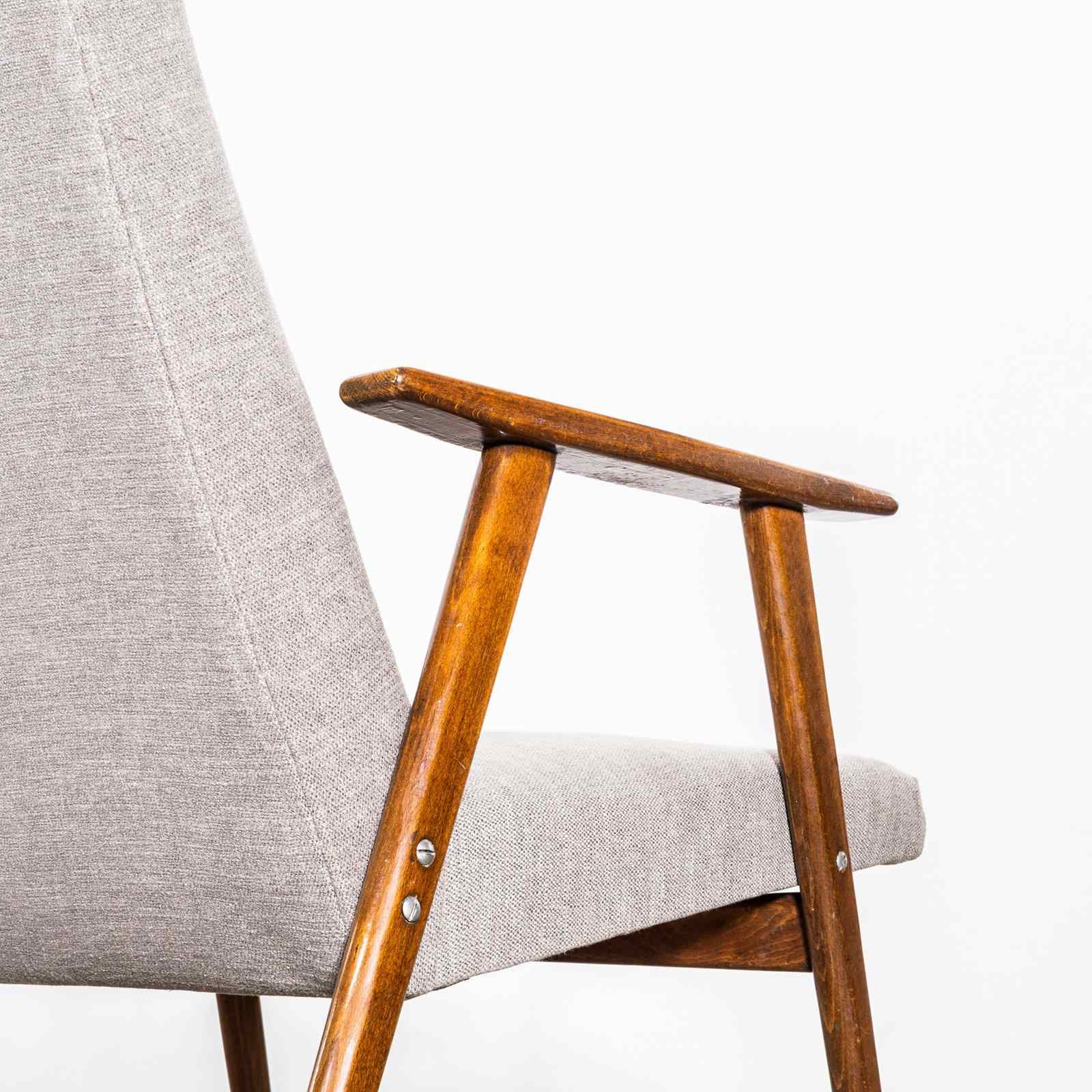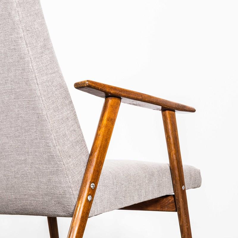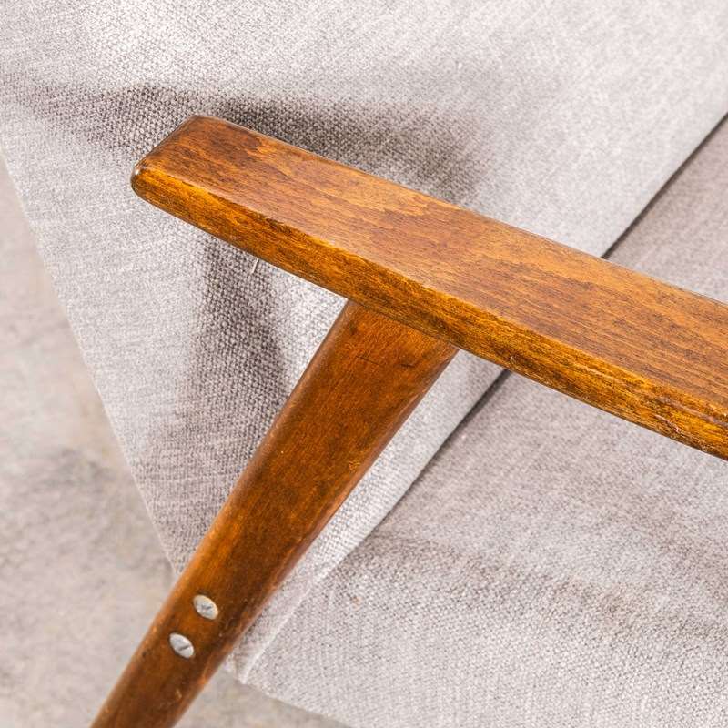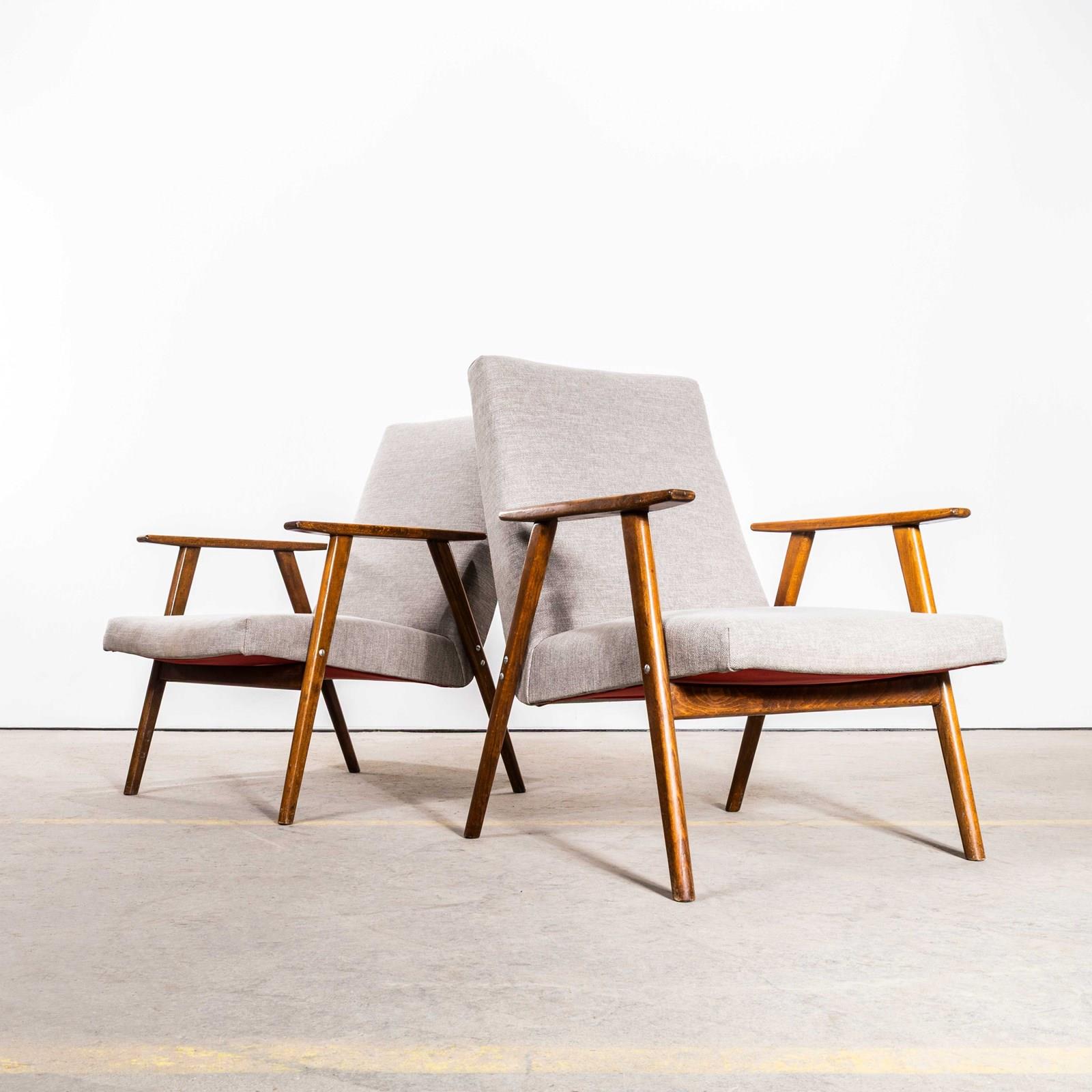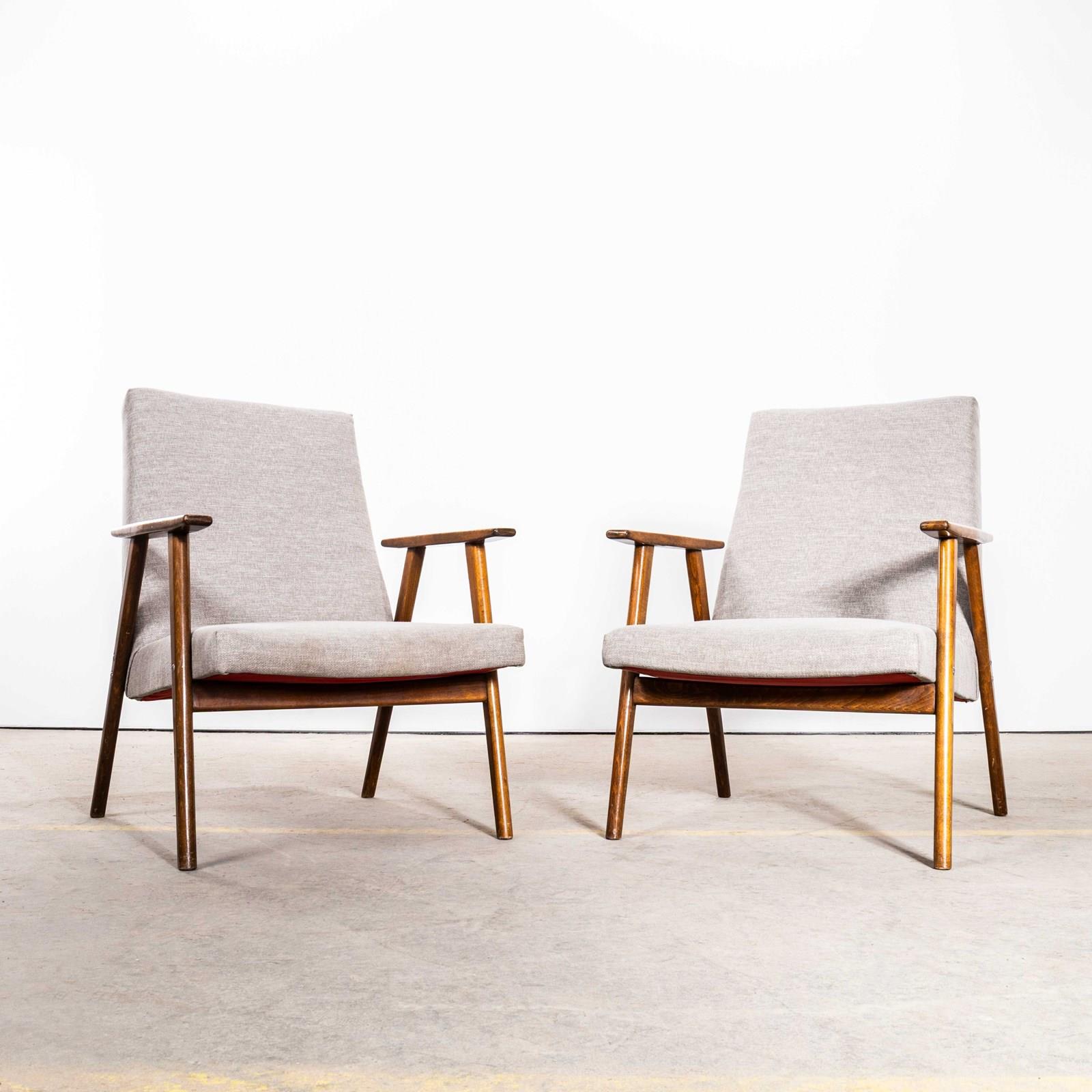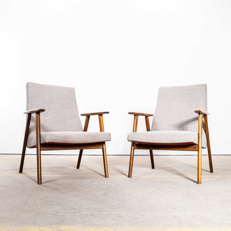 Sourced in Scandinavia this is a fully restored pair of mid century armchairs. The frame is beech throughout and the arms have been cleaned and waxed but retain their original character. The internal beech frame has been carefully restored, the internal foam and components have been checked and replaced as required by our workshop team. To comply with UK fire regulations the internal components are covered in a flame retardant barrier cloth. We have selected this brand new grey brushed cotton fabric and reupholstered the chairs throughout.