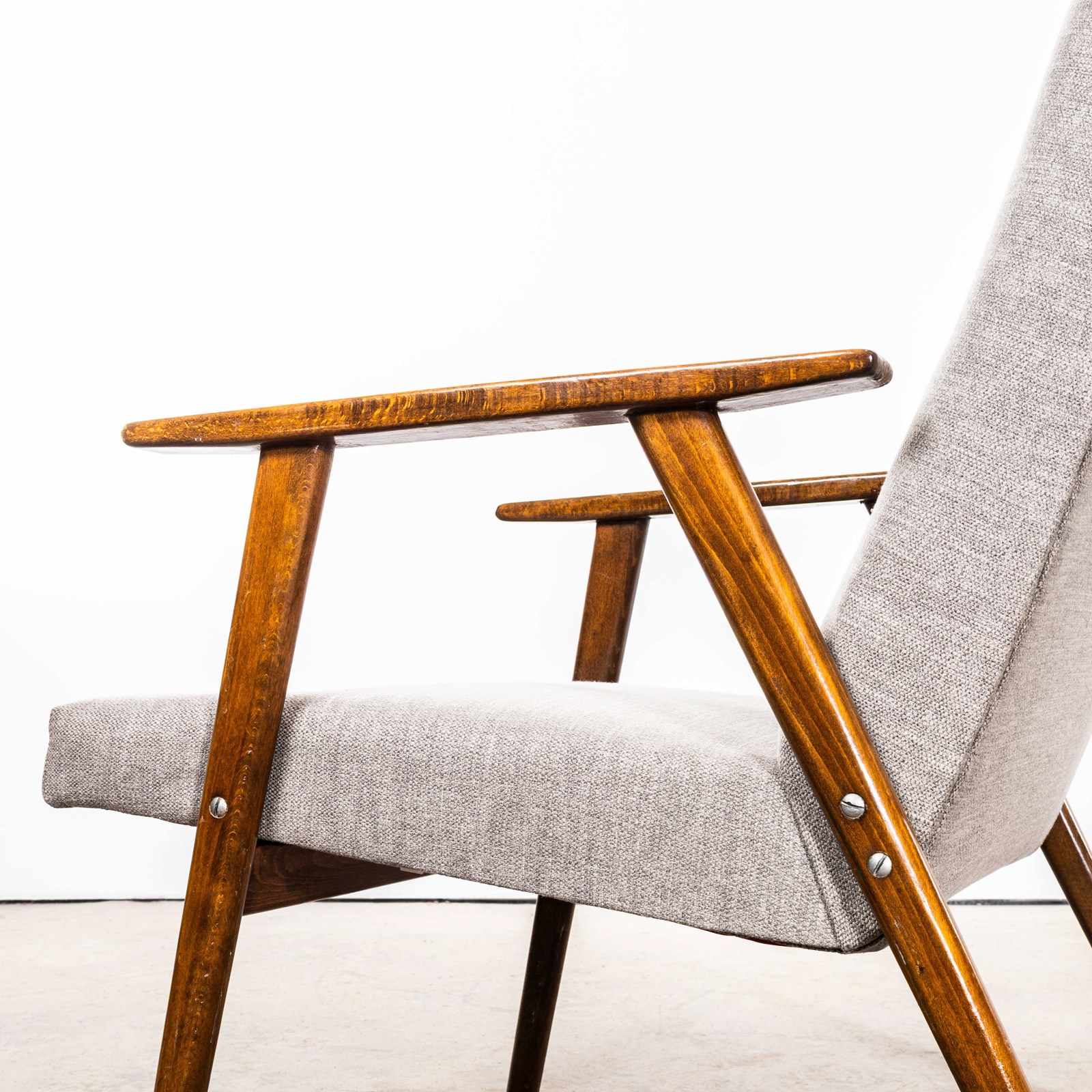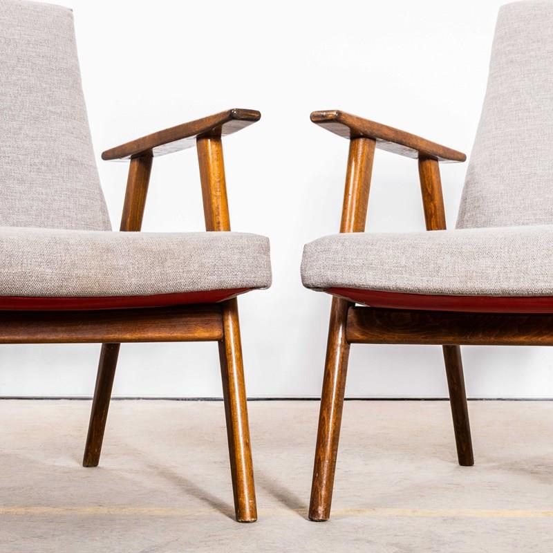 1950’S Mid Century Upholstered Armchairs With Straight Arms And Top Caps In Grey