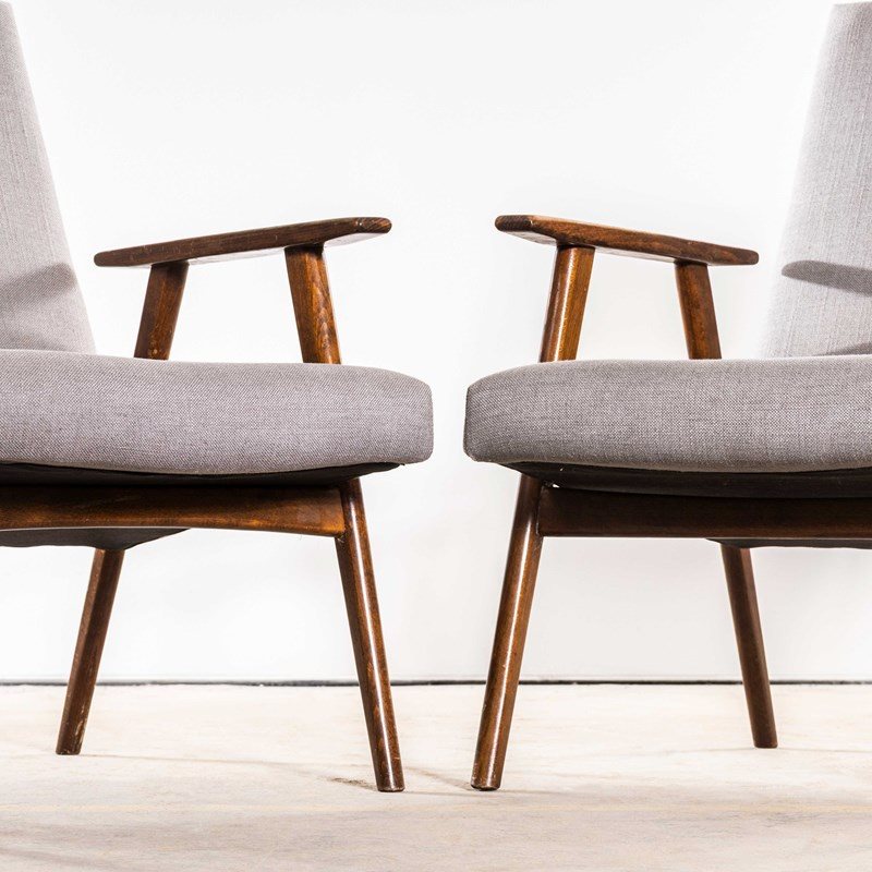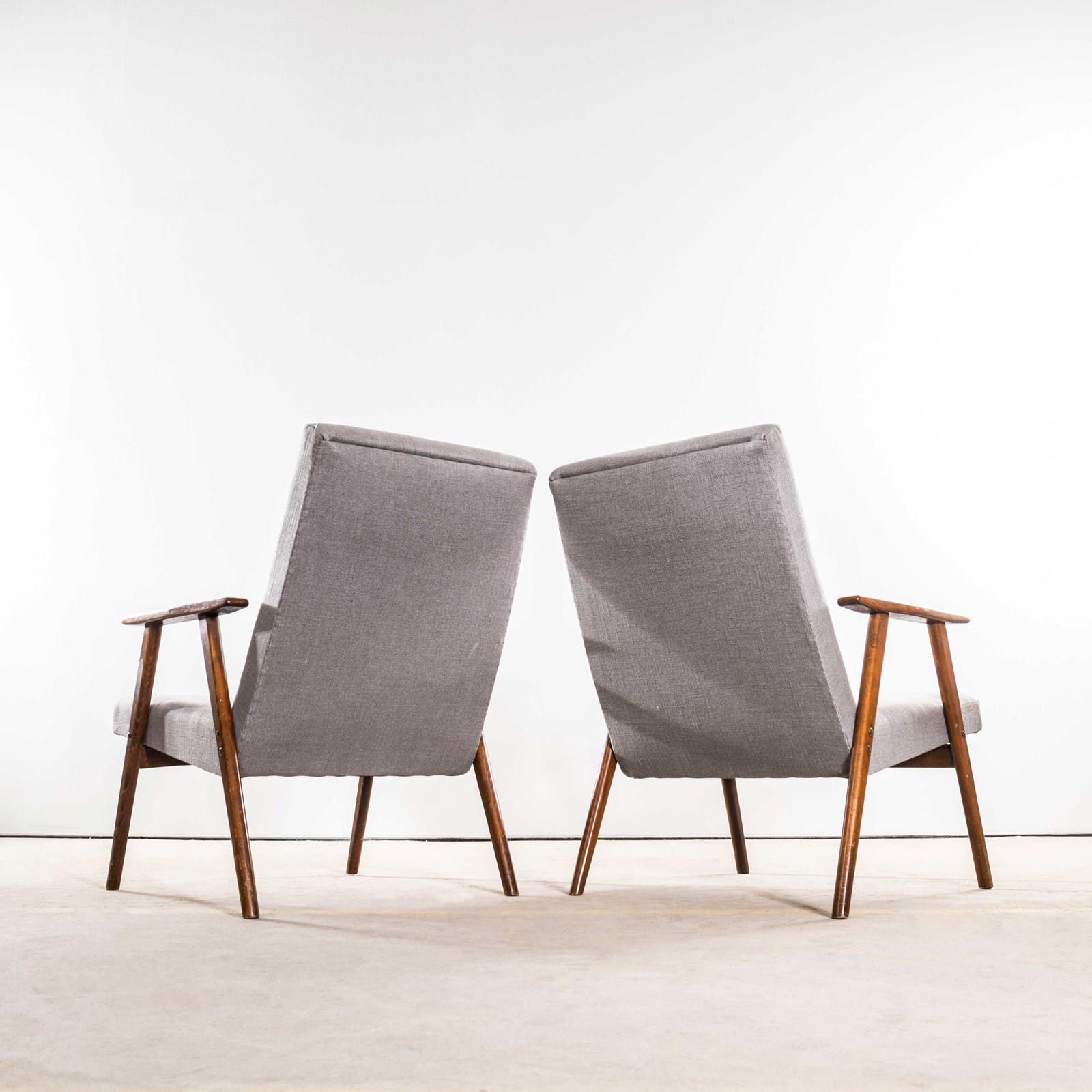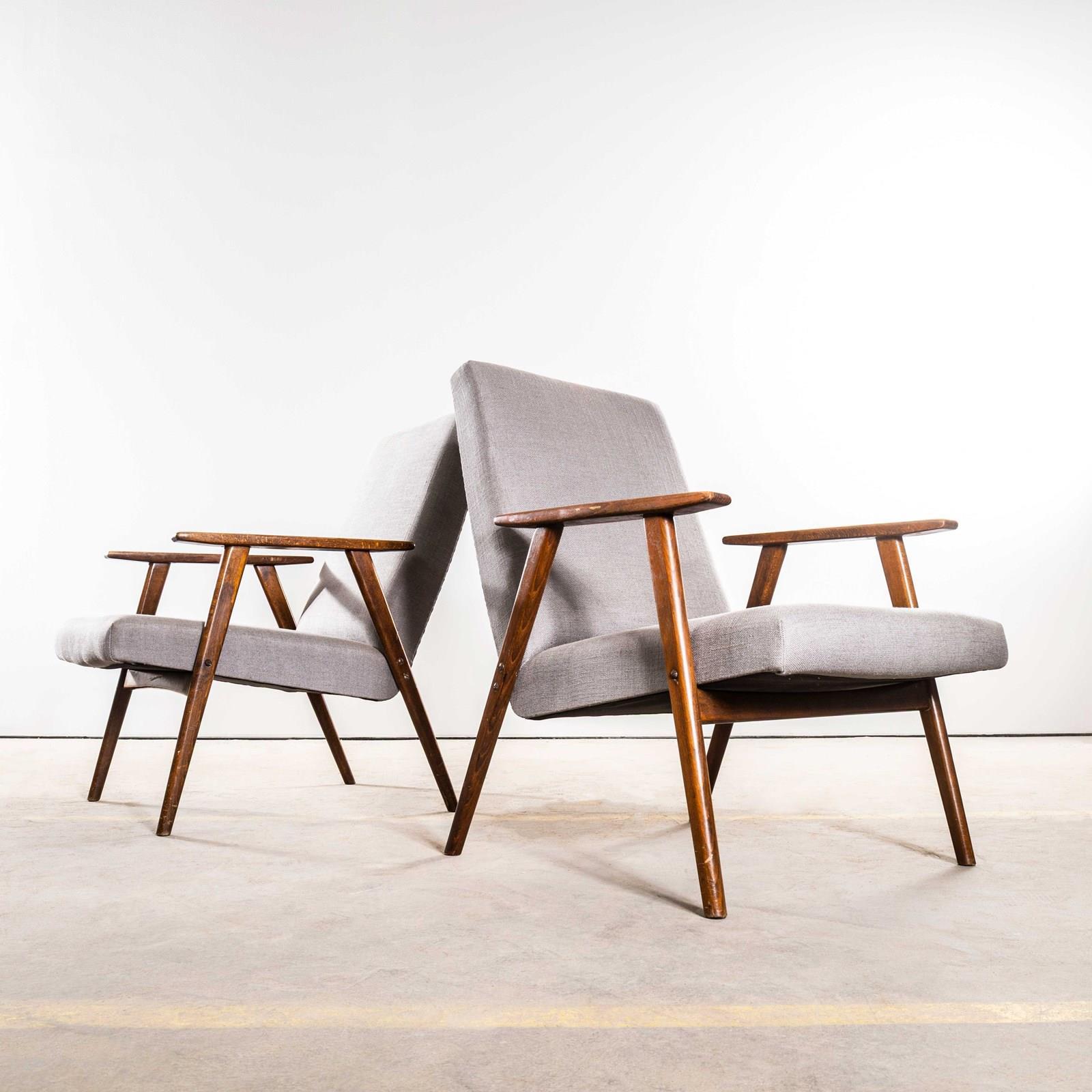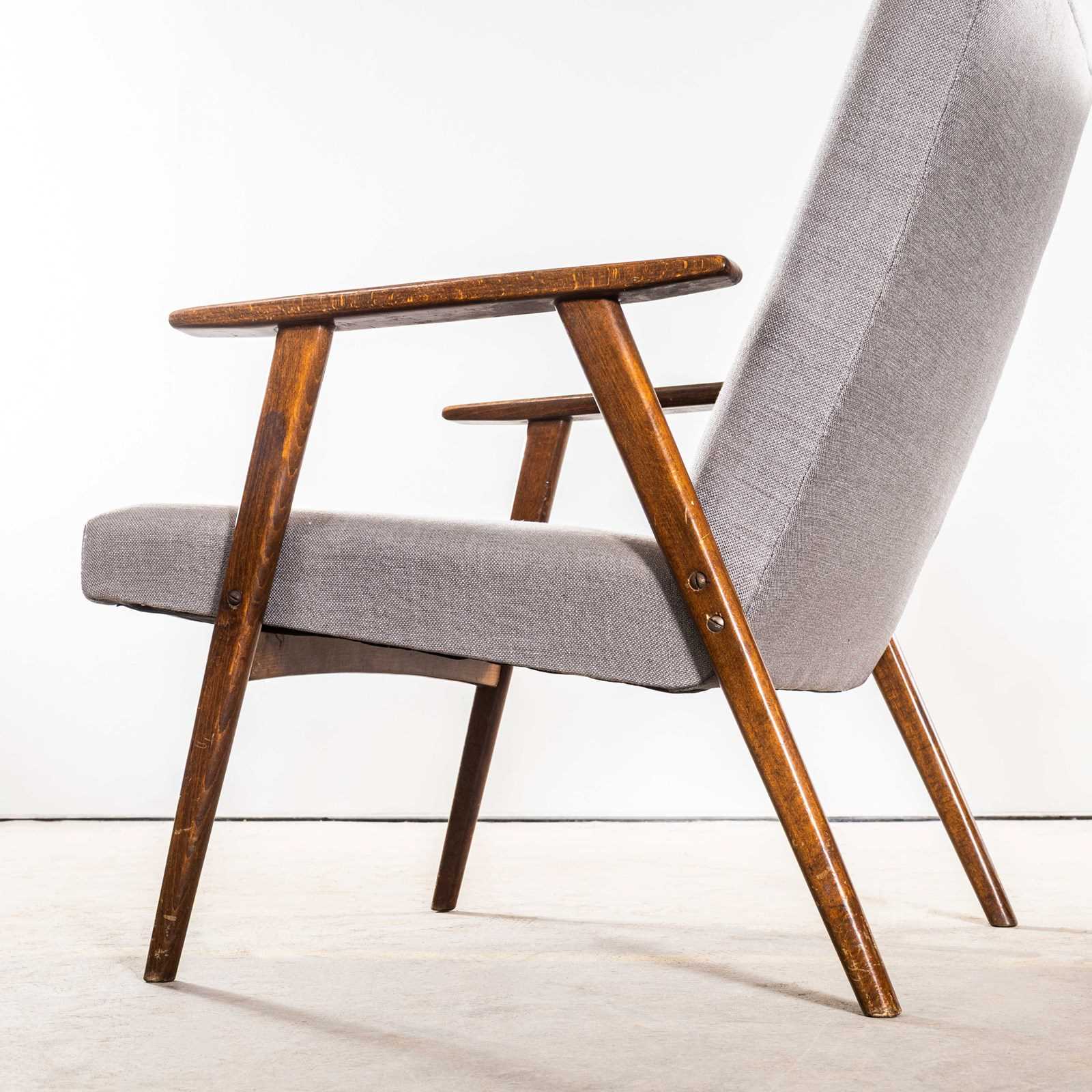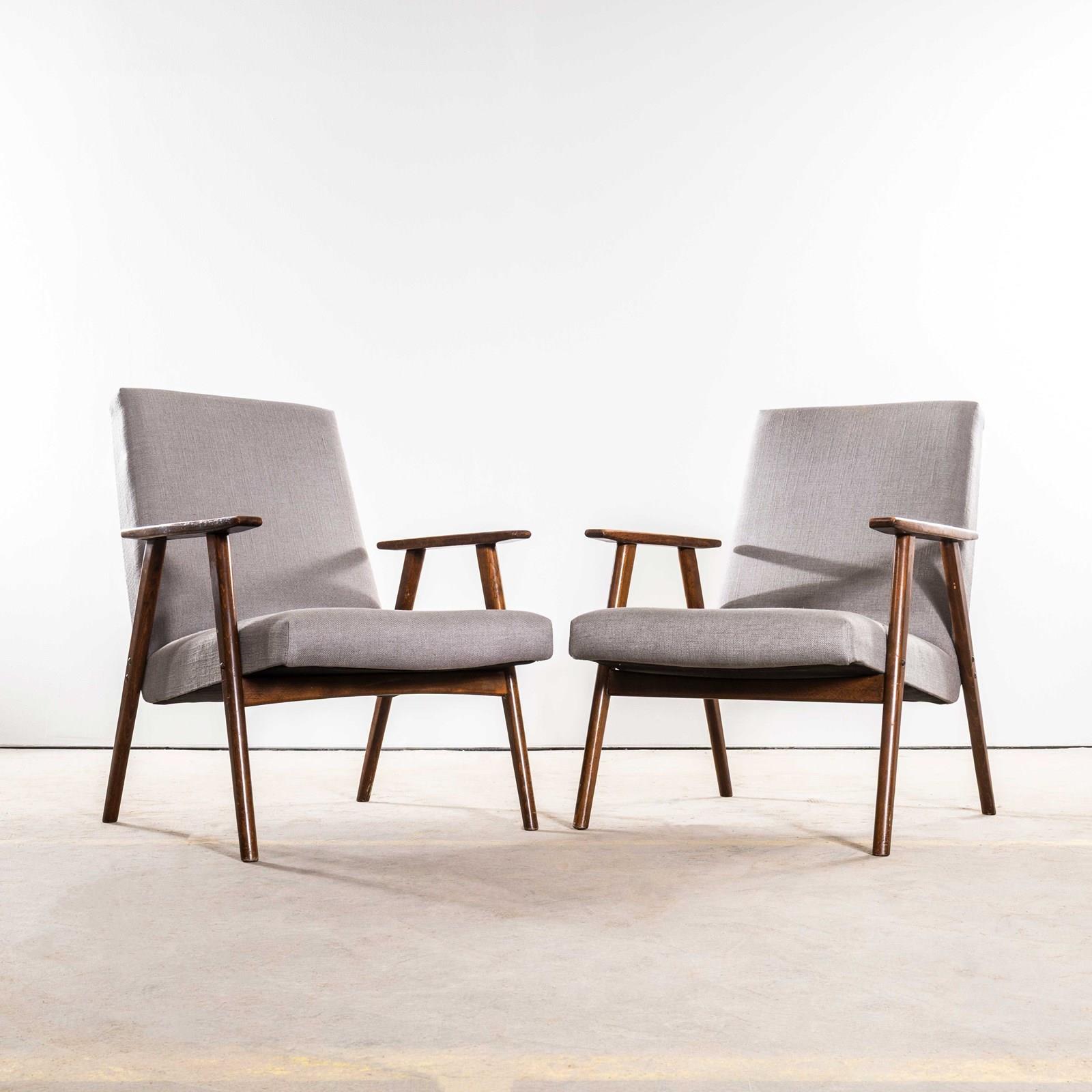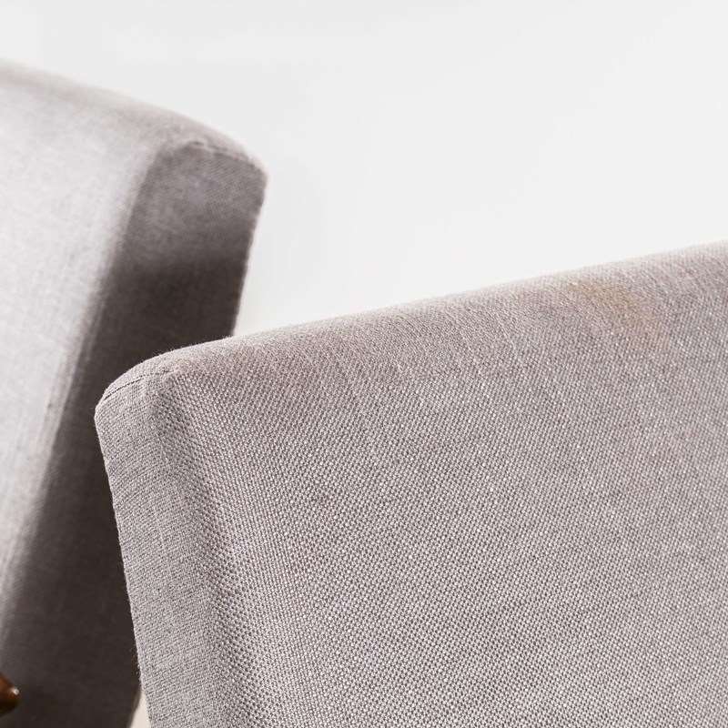 1950’S Mid Century Upholstered Grey Armchairs With Straight Arms And Top Caps
