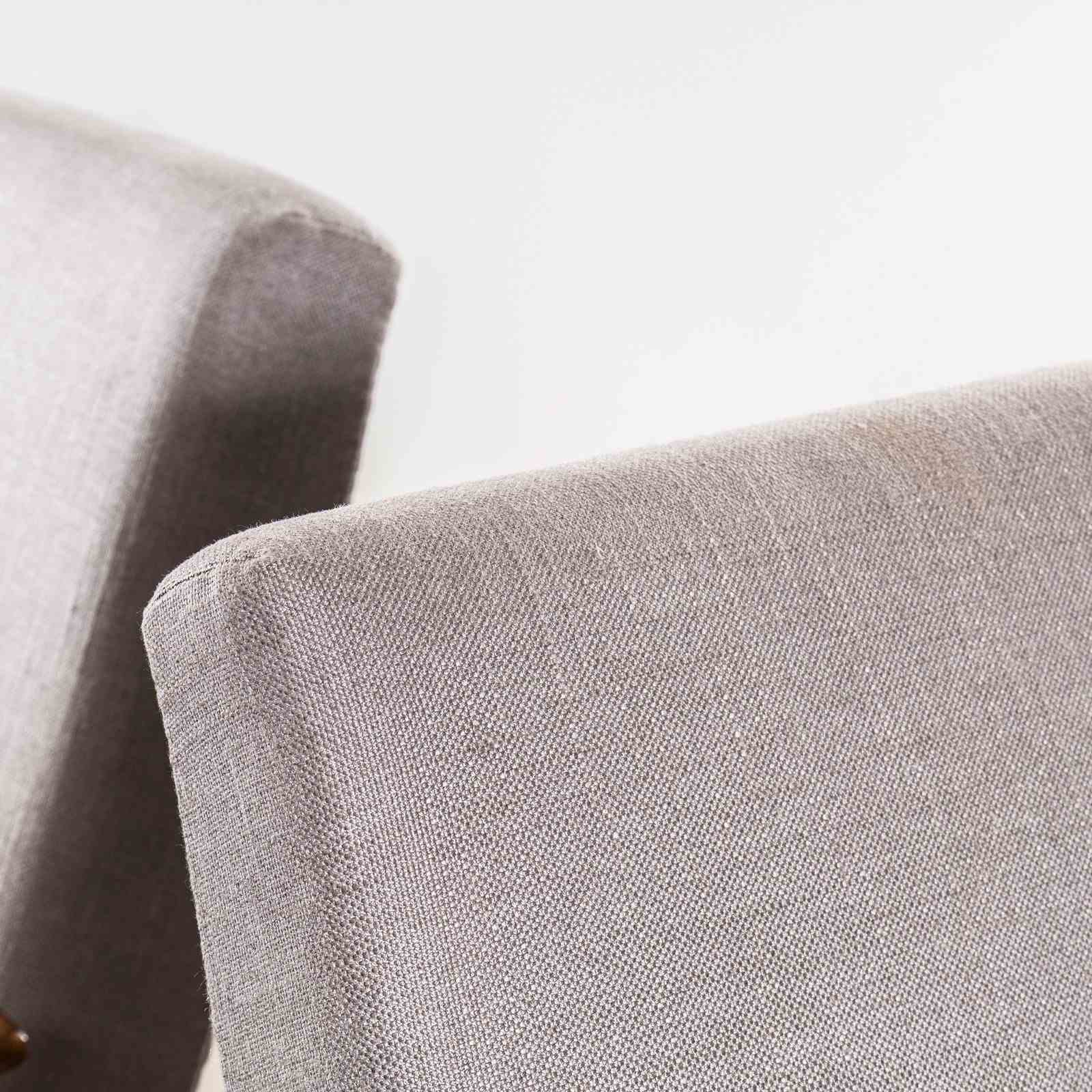 Sourced in Scandinavia these are fully restored mid century armchairs. The frame is beech throughout and the arms have been cleaned and waxed but retain their original character. The internal beech frame has been carefully restored, the internal foam and components have been checked and replaced as required by our workshop team. To comply with UK fire regulations the internal components are covered in a flame retardant barrier cloth. We have selected this brand new slubbed cotton fabric and reupholstered the chairs throughout. Seat Height 40cm.