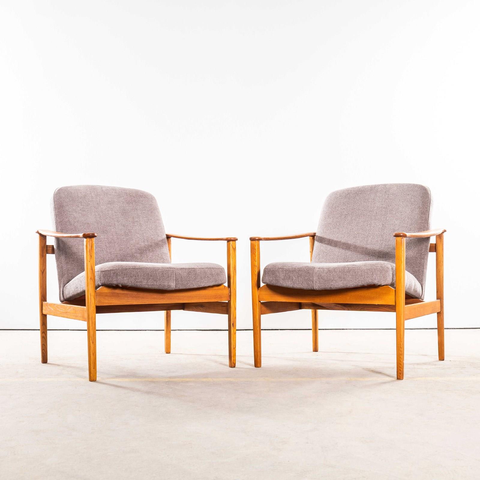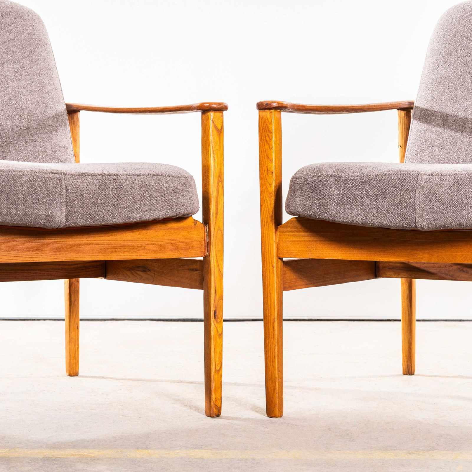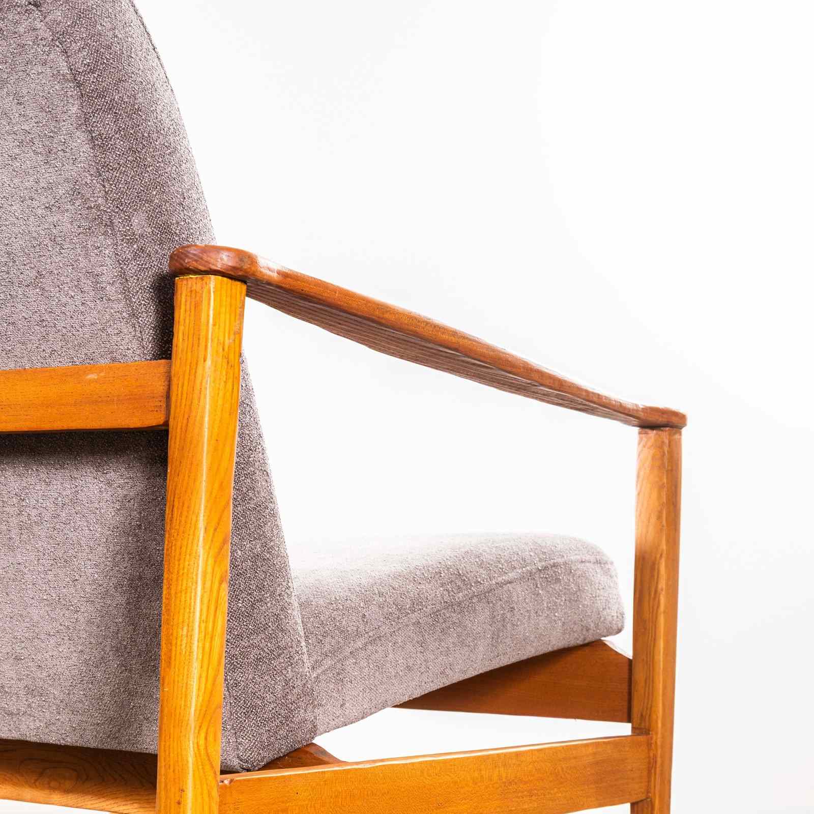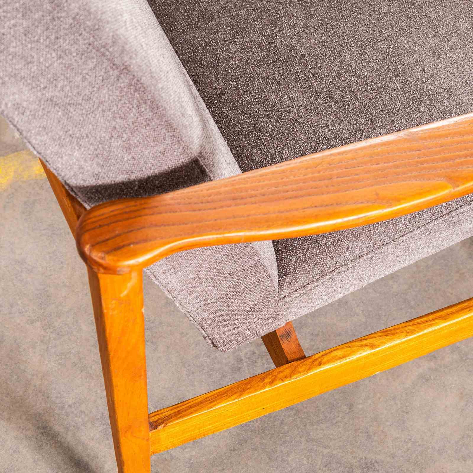 Sourced in Scandinavia these are fully restored mid century armchairs. The frame is beech throughout and the arms have been cleaned and waxed but retain their original character. The internal beech frame has been carefully restored, the internal foam and components have been checked and replaced as required by our workshop team. To comply with UK fire regulations the internal components are covered in a flame retardant barrier cloth. We have selected this brand new grey brushed cotton fabric and reupholstered the chairs throughout. Seat Height 43cm.