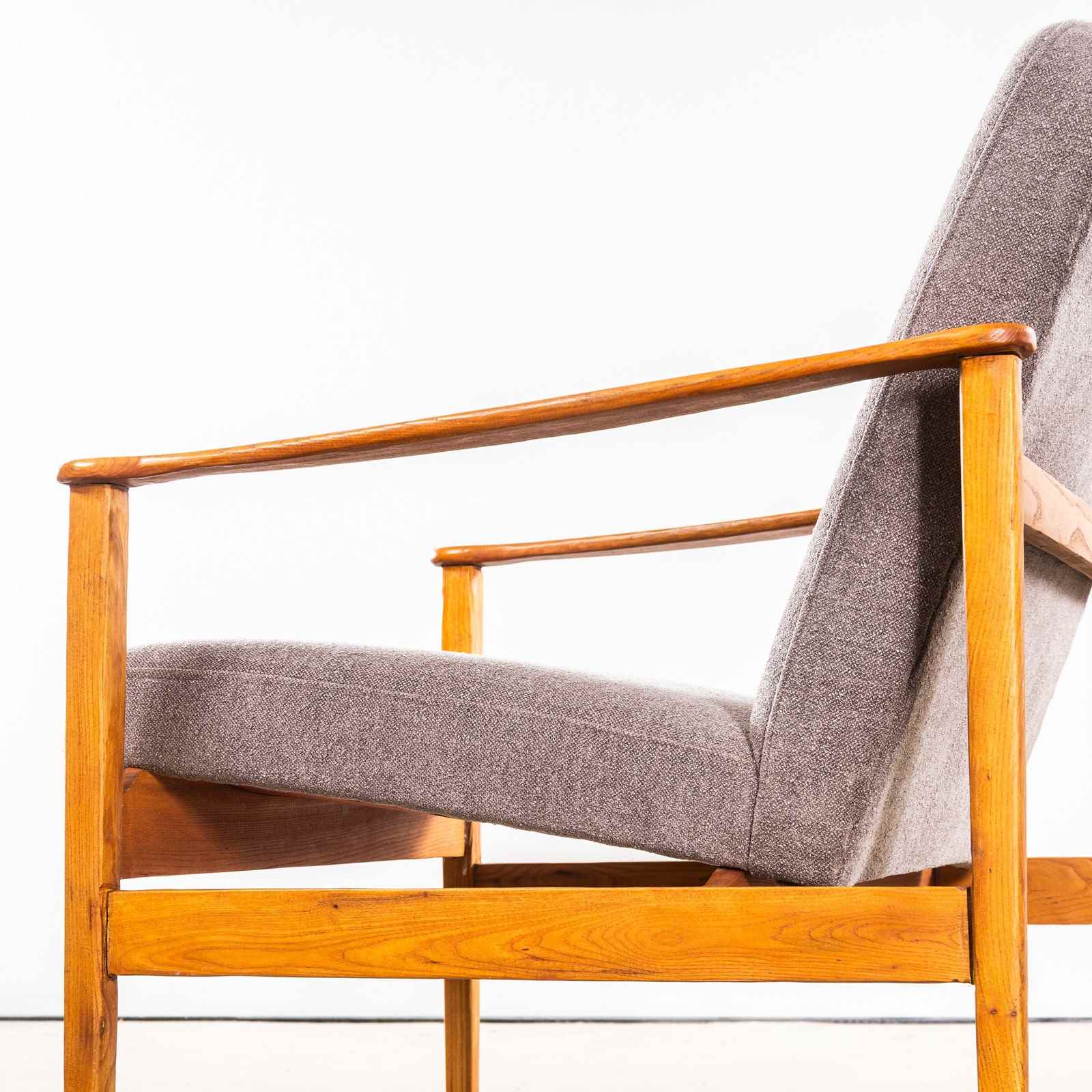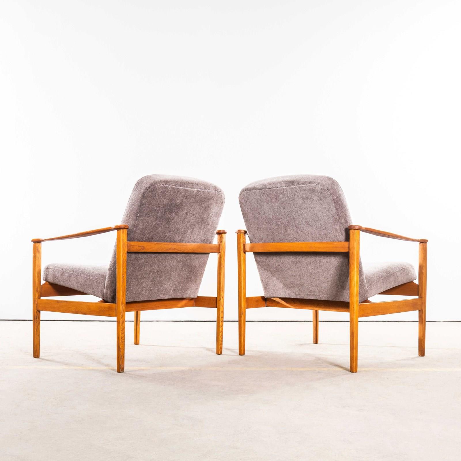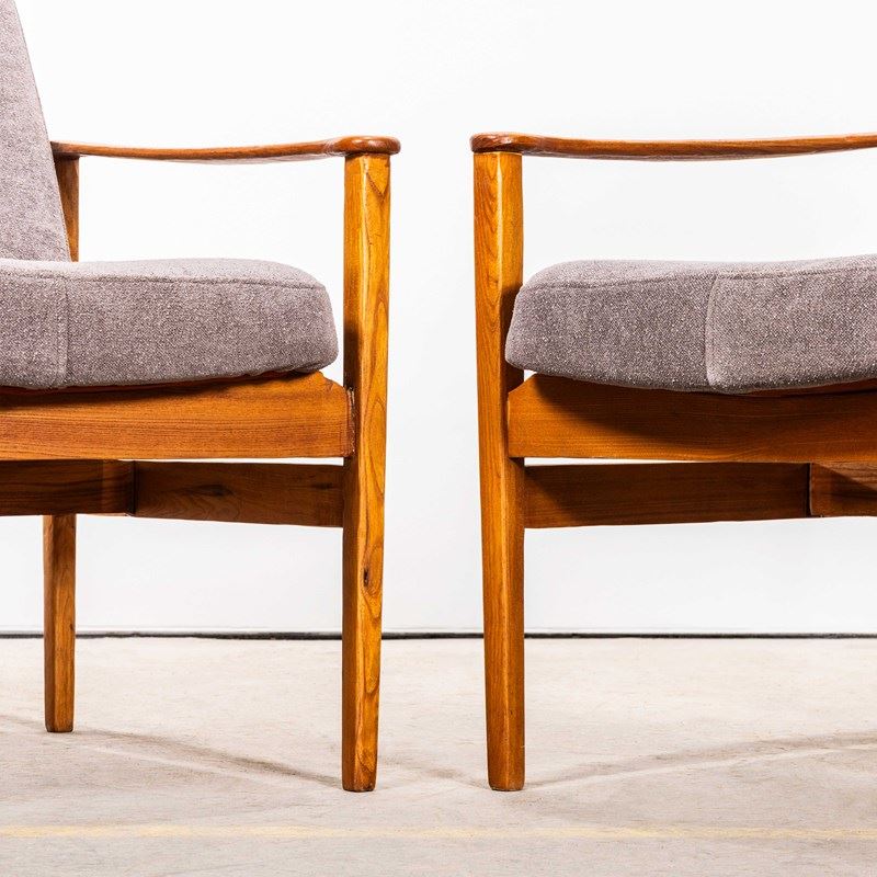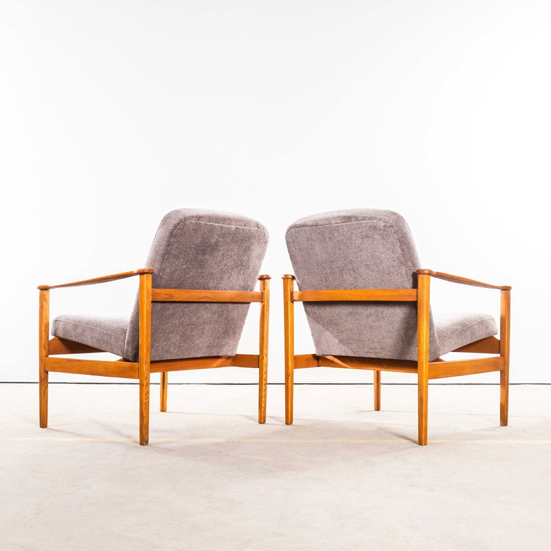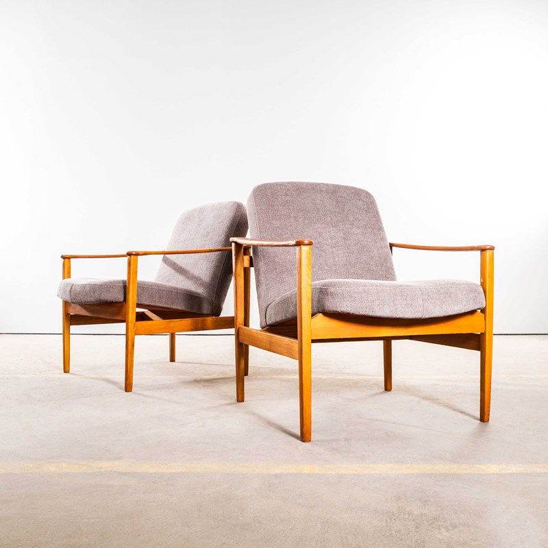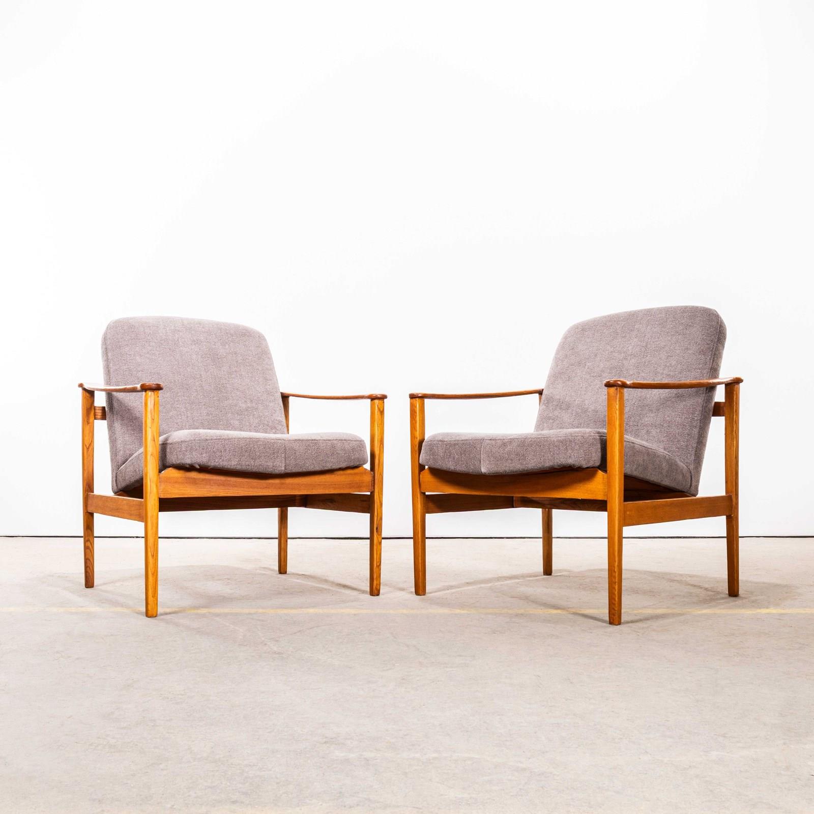 Sourced in Scandinavia these are fully restored mid century armchairs. The frame is beech throughout and the arms have been cleaned and waxed but retain their original character. The internal beech frame has been carefully restored, the internal foam and components have been checked and replaced as required by our workshop team. To comply with UK fire regulations the internal components are covered in a flame retardant barrier cloth. We have selected this brand new grey brushed cotton fabric and reupholstered the chairs throughout. Seat Height 43cm.