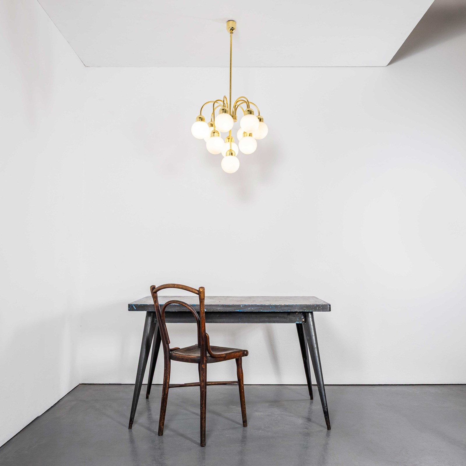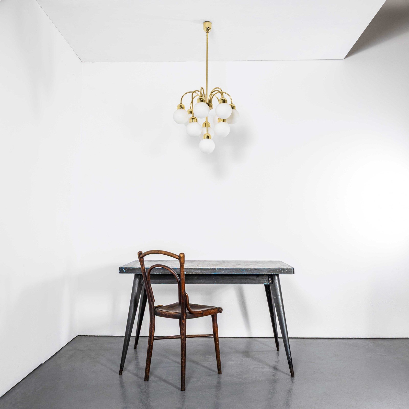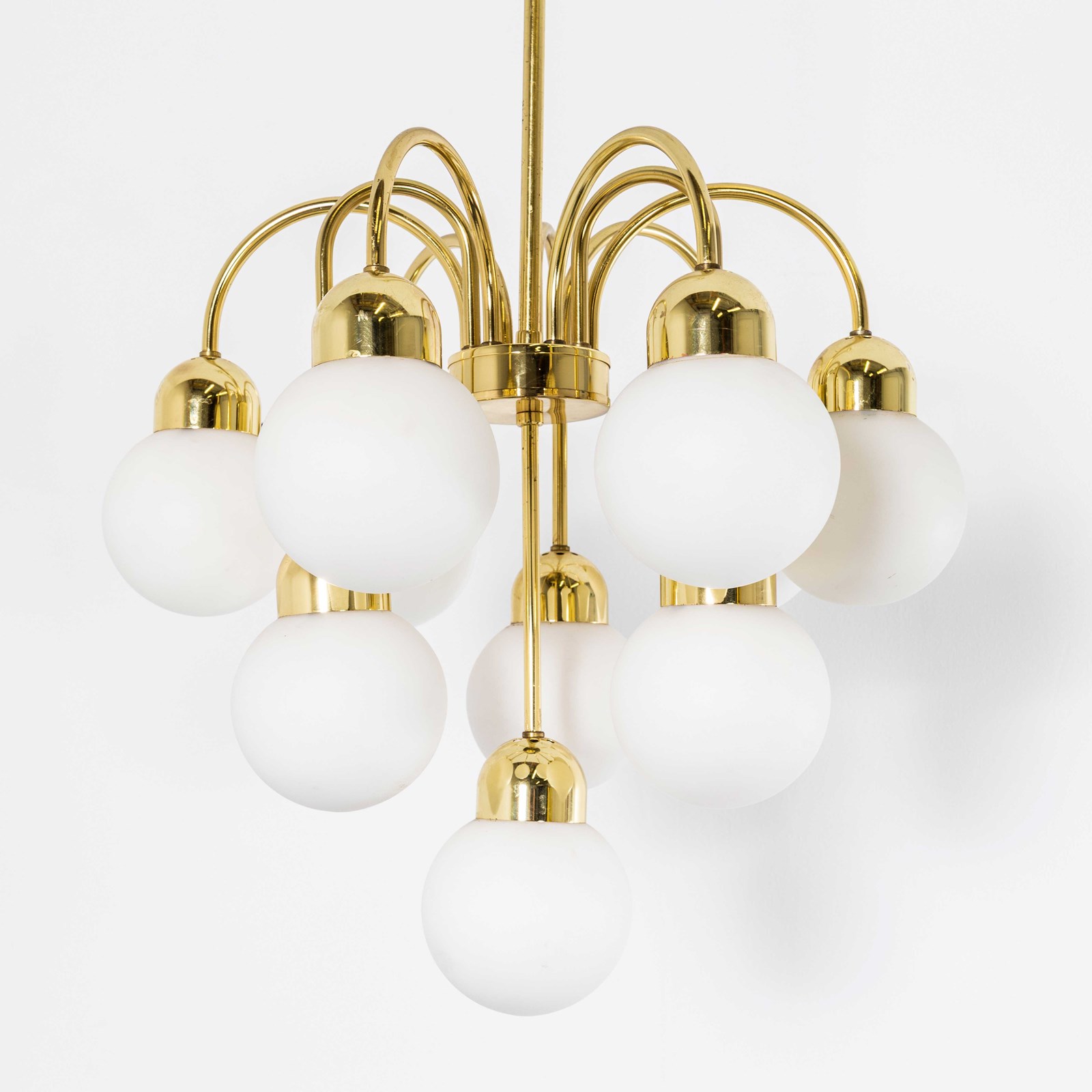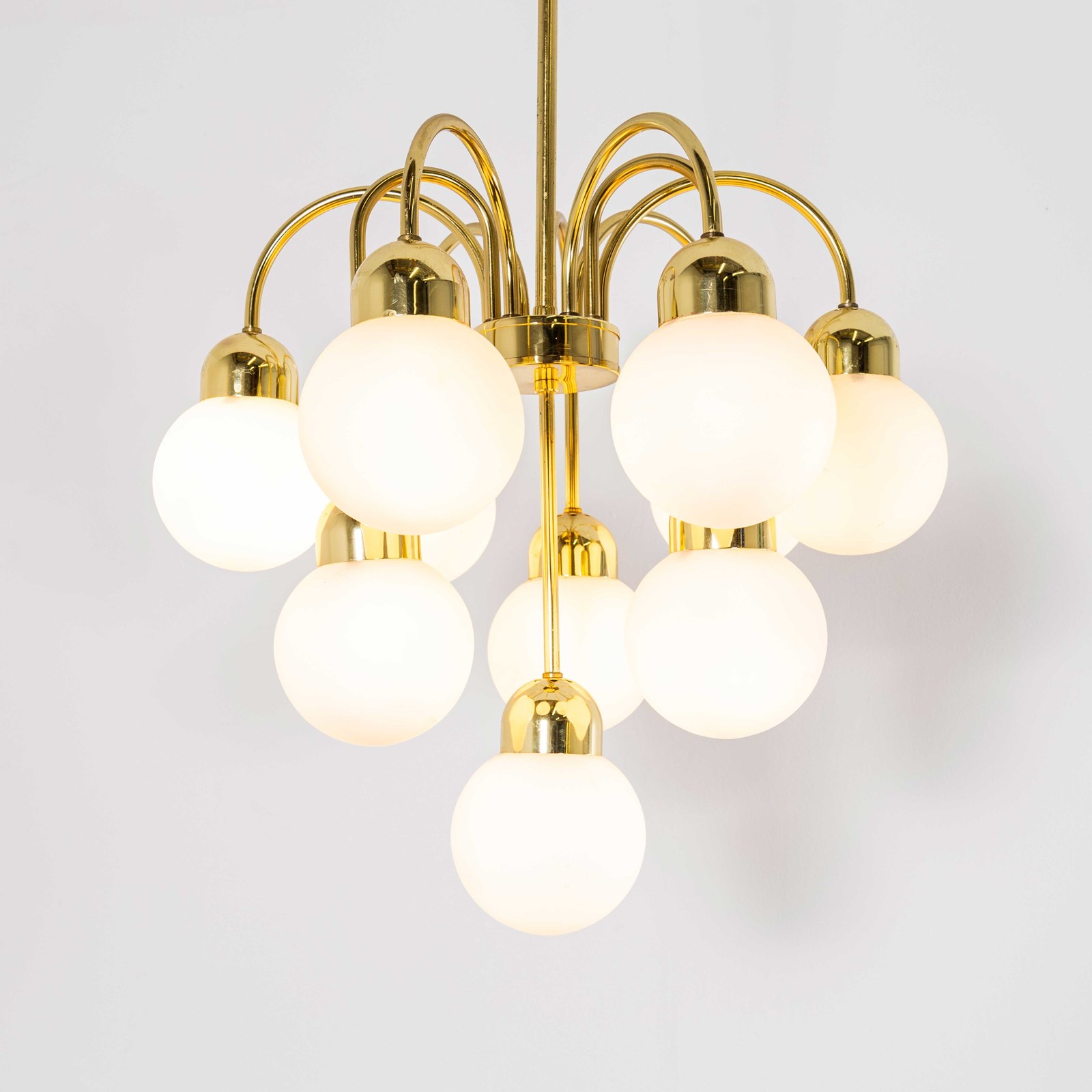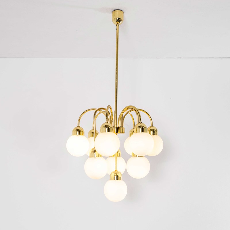 Brass and glass opal globe chandelier hand made in the Czech republic by the iconic Lustry Kamenicky Senon glassworks. The pendant is made with all the original brass components and original mouth blown opal glass balls. Original vintage opal glass has a soft colour that is rarely attained with contemporary opal glass which is often painted and not opal actual opal glass. The Czech republic has a rich international history of glass production championed by the iconic Lustry Kamenicky Senon glassworks. In exceptional original condition, the lamp is hung on 1m of brass chain with three core clear cable and we provide a brass ceiling hook. Longer chain and cable is available if required. All our lamps have been carefully restored and all electrical components have been removed and replaced with modern European CE standard components to BS EN 60598. Each lamp is individually tested and labelled to BS EN 60598. INCLUDED: Each lamp comes completely wired and ready to install. The lamp is fitted with a standard E27 threaded lamp holder for which a wide range of modern and vintage style filament bulbs are widely available. We do not currently sell bulbs and recommend LED bulbs 6W maximum. Listing is for one lamp, six available when published. The lamp is currently wired and fitted for UK and EU compliance. The lamp can be wired for compliance in the US or any global market.