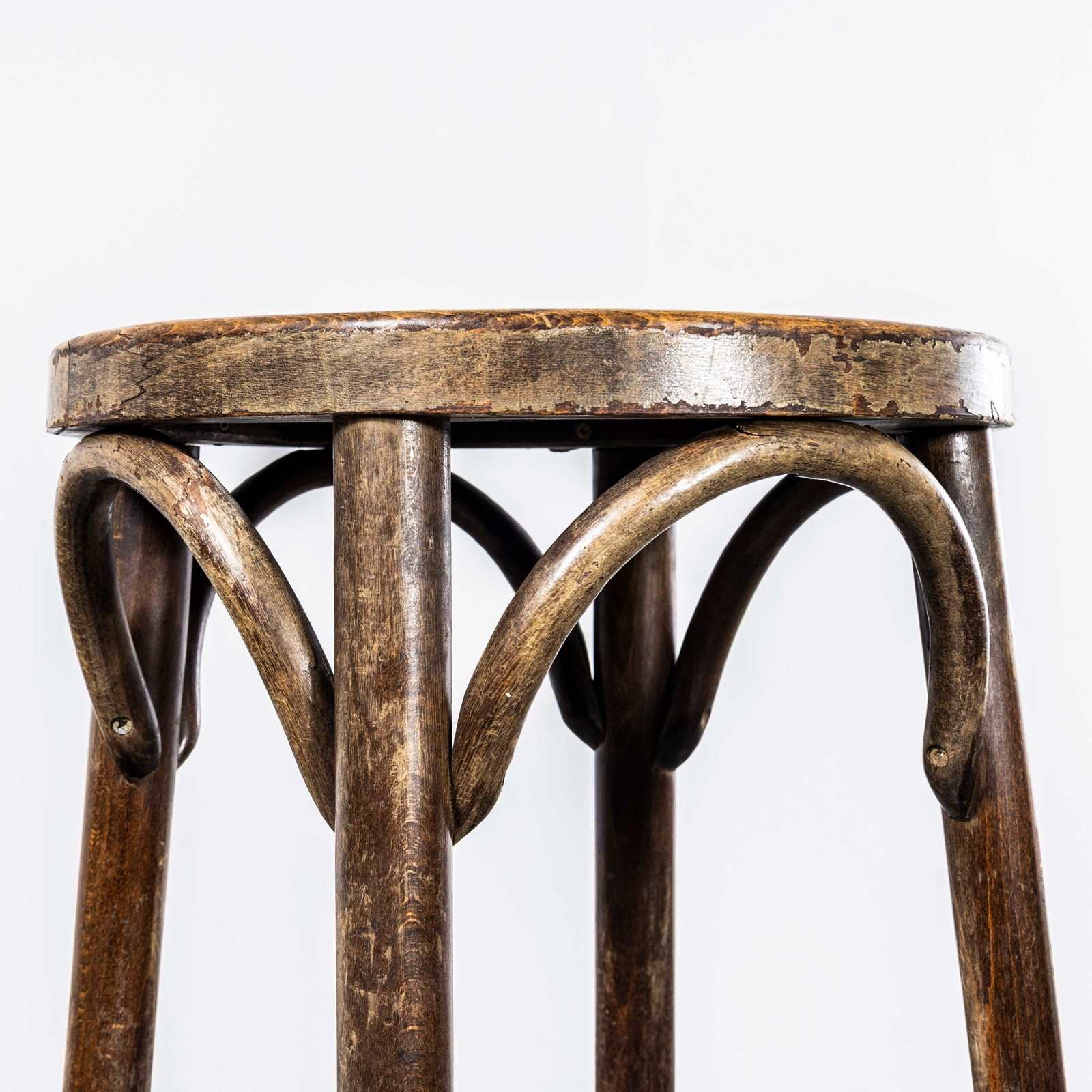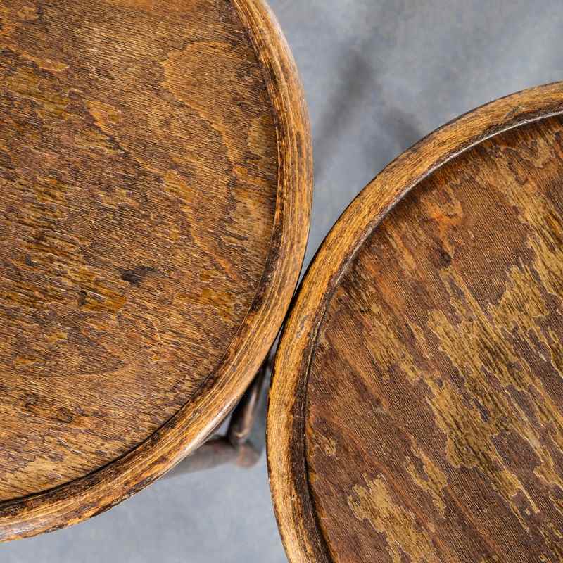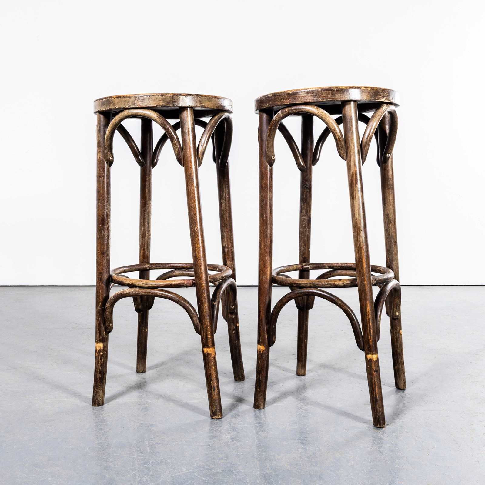 Good quality classic bentwood bar stools in a rich dark oak colour. The stools were made in Eastern Europe using solid steam bent beech, they are in an attractive oak colour and are in excellent condition. Each stool is serviced individually in our own workshops. The small whiteish marks at ankle height are where the stools have gently rubbed the foot rail present in most bars. Seat height 81cm.