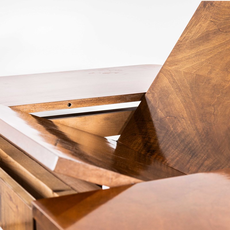 Superb practical piece of mid century furniture by the Czech maker Up Zavody and the designer Jindrich Halabala. Sourced direct in the Czech republic, Halabala was a Czech industrial designer, writer, and educator. Halabala was a key force in the development of post war industrially produced European furniture. Czech was a large producer of high quality mid century furniture following the surge of modernism originated by the Bauhaus school. Made principally from birch the legs are solid and strong, the top has rich birch character. The table extends from 120cm to 190cm with a simple mechanism using the central leaf that is stored neatly away underneath the table top. Please note the colour of the extension is original and slightly darker because it was stored and protected from sunlight. Our workshop has cleaned and serviced the table it is strong and steady and good to go. Length of extended table: 190cm. Knee Clearance: 66cm.
