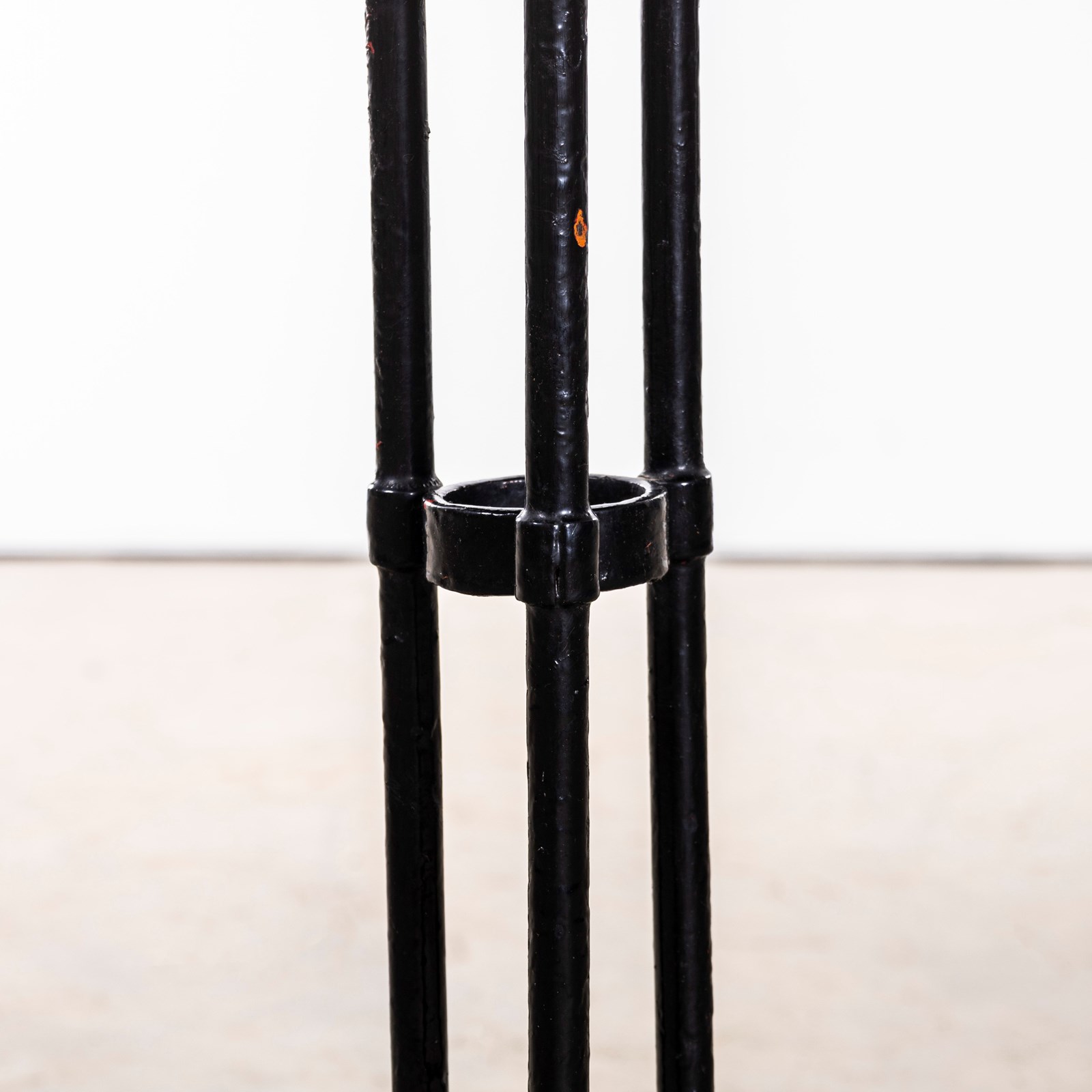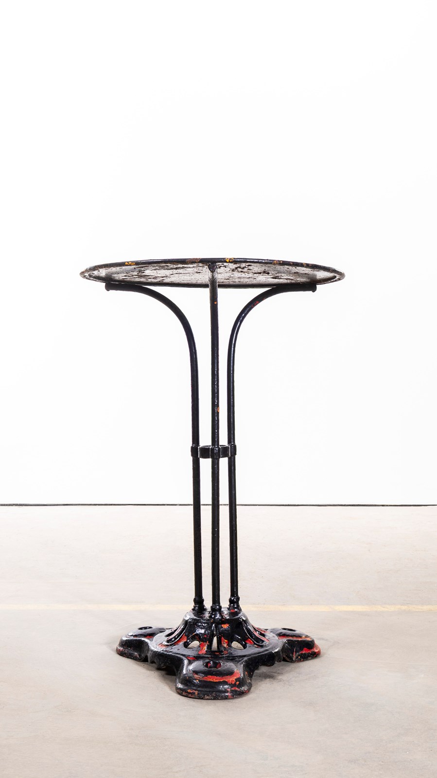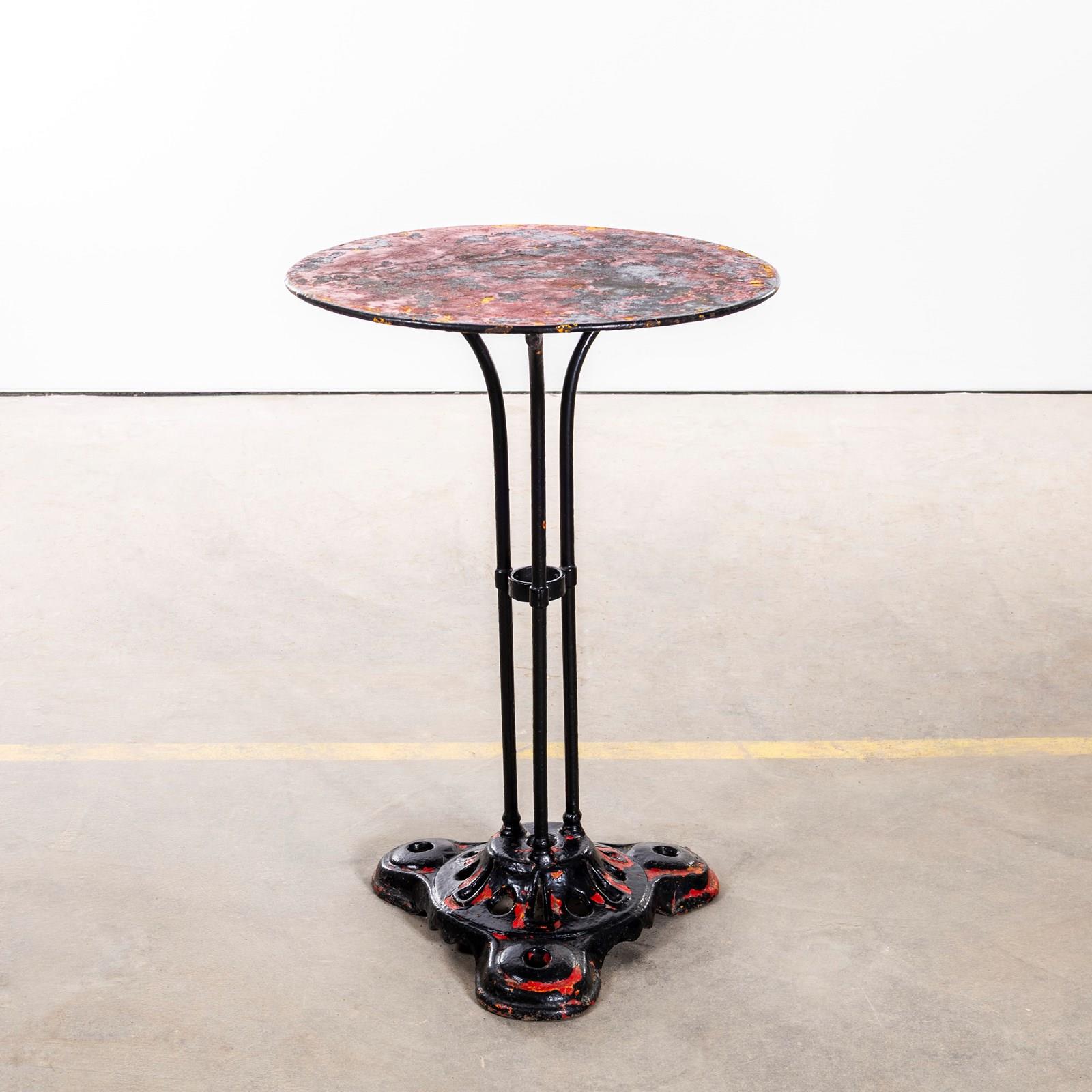 Classic French gueridon table with three solid bar hand shaped legs with a central riveted support ring and delicate curved feet on an elegant shaped sturdy cast metal base. Original paint gently restored by our workshop.