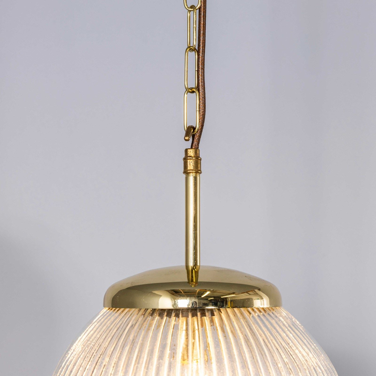 • Brass gallery tops suspended on brass chain and rust fabric flex.