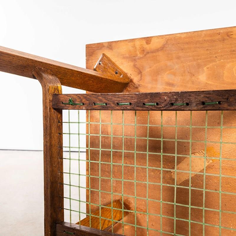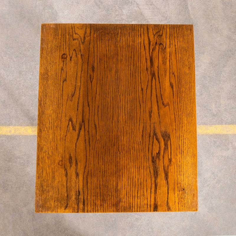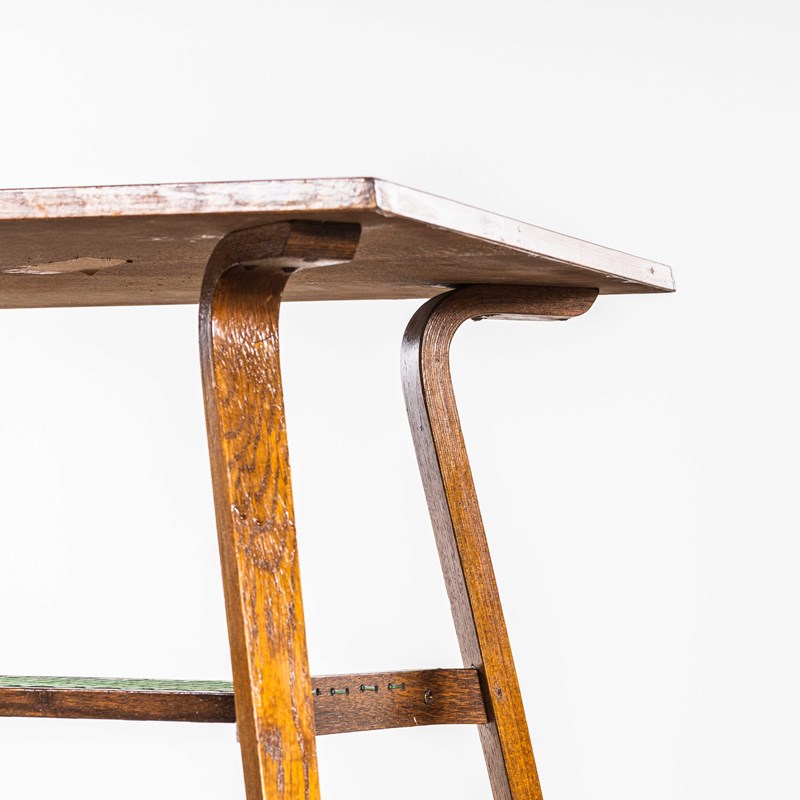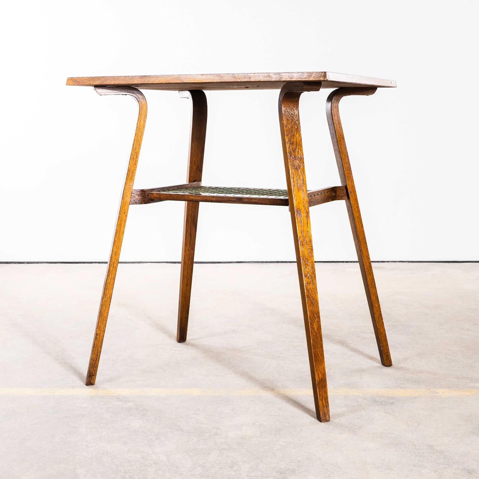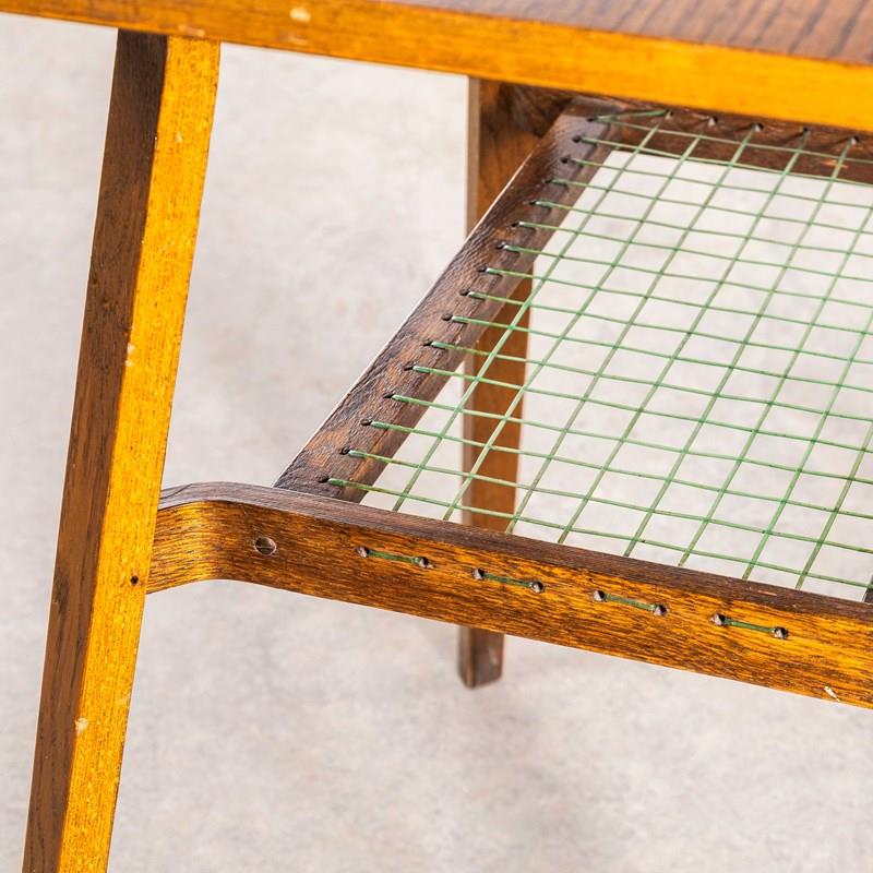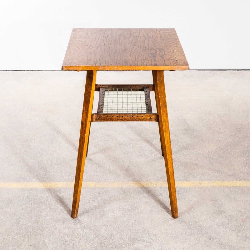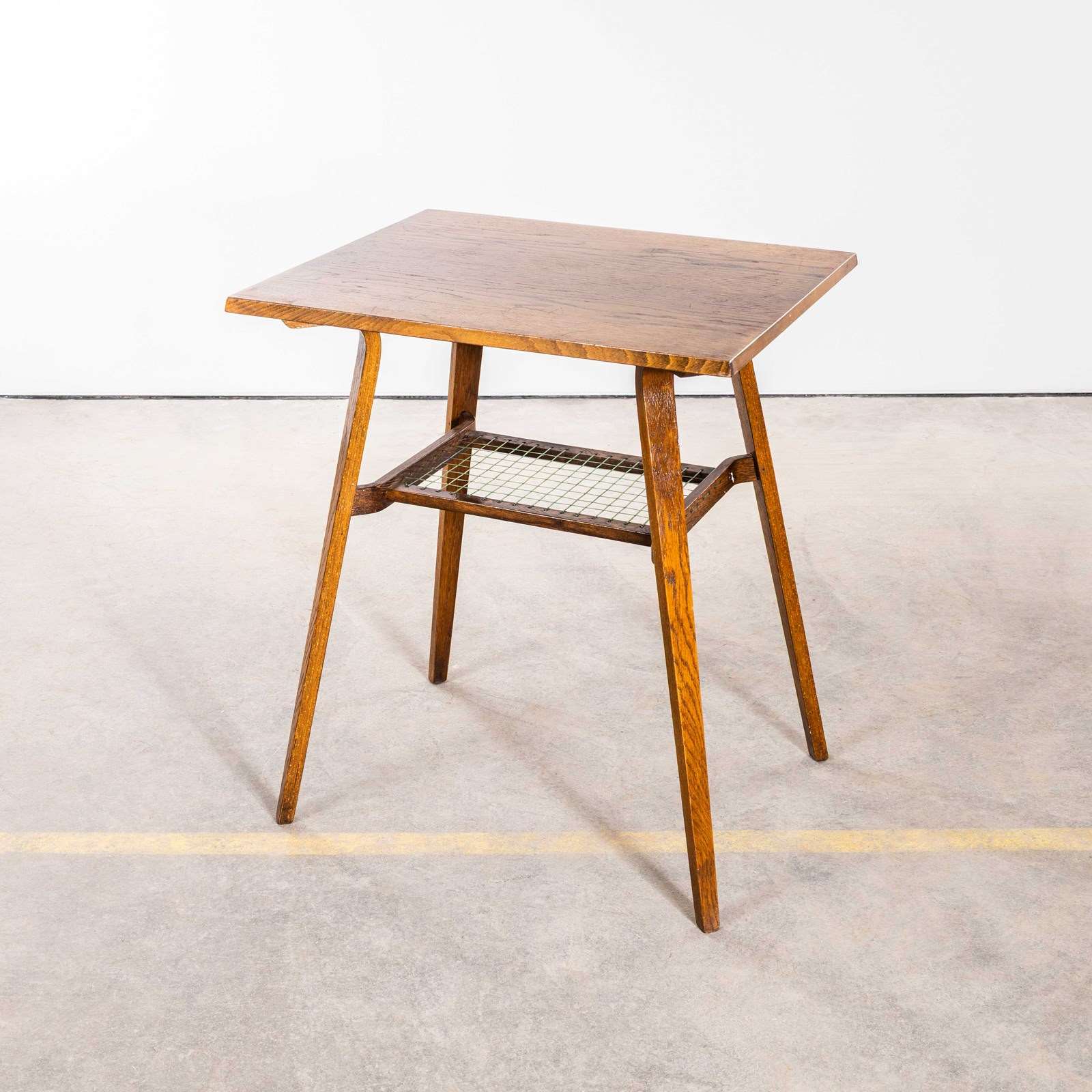 Really unusual and characterful small side table made in oak with a practical low shelf and graceful formed legs and shelf detail. The shelf is made from the original woven nylon cord. The table is in good condition. Our workshop has cleaned and serviced the table it is strong, stable and good to go.