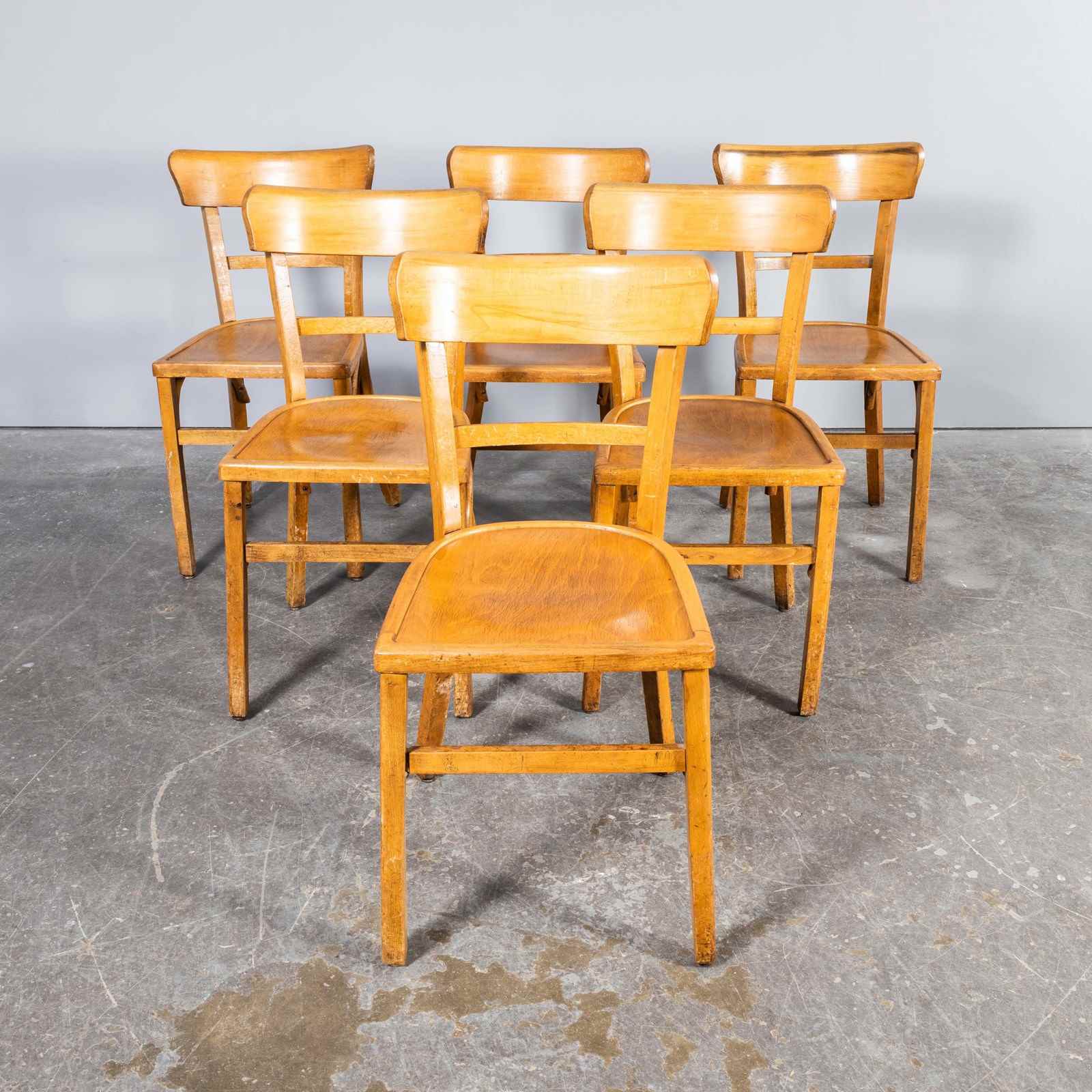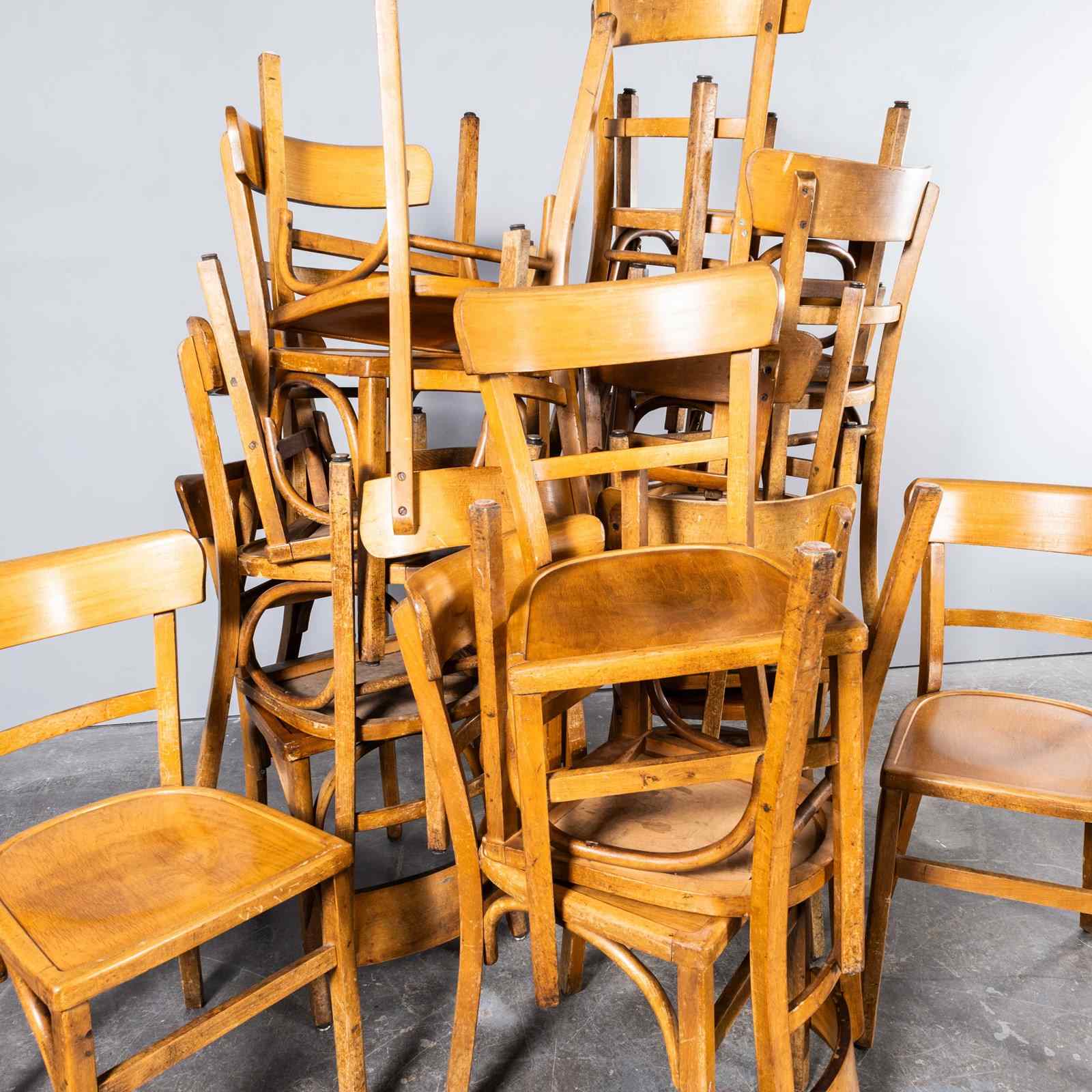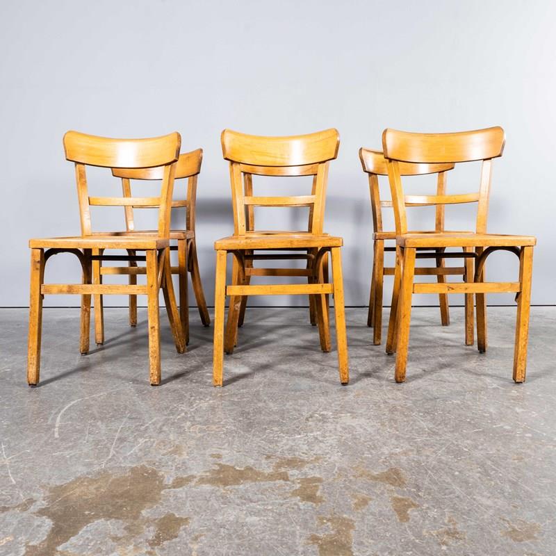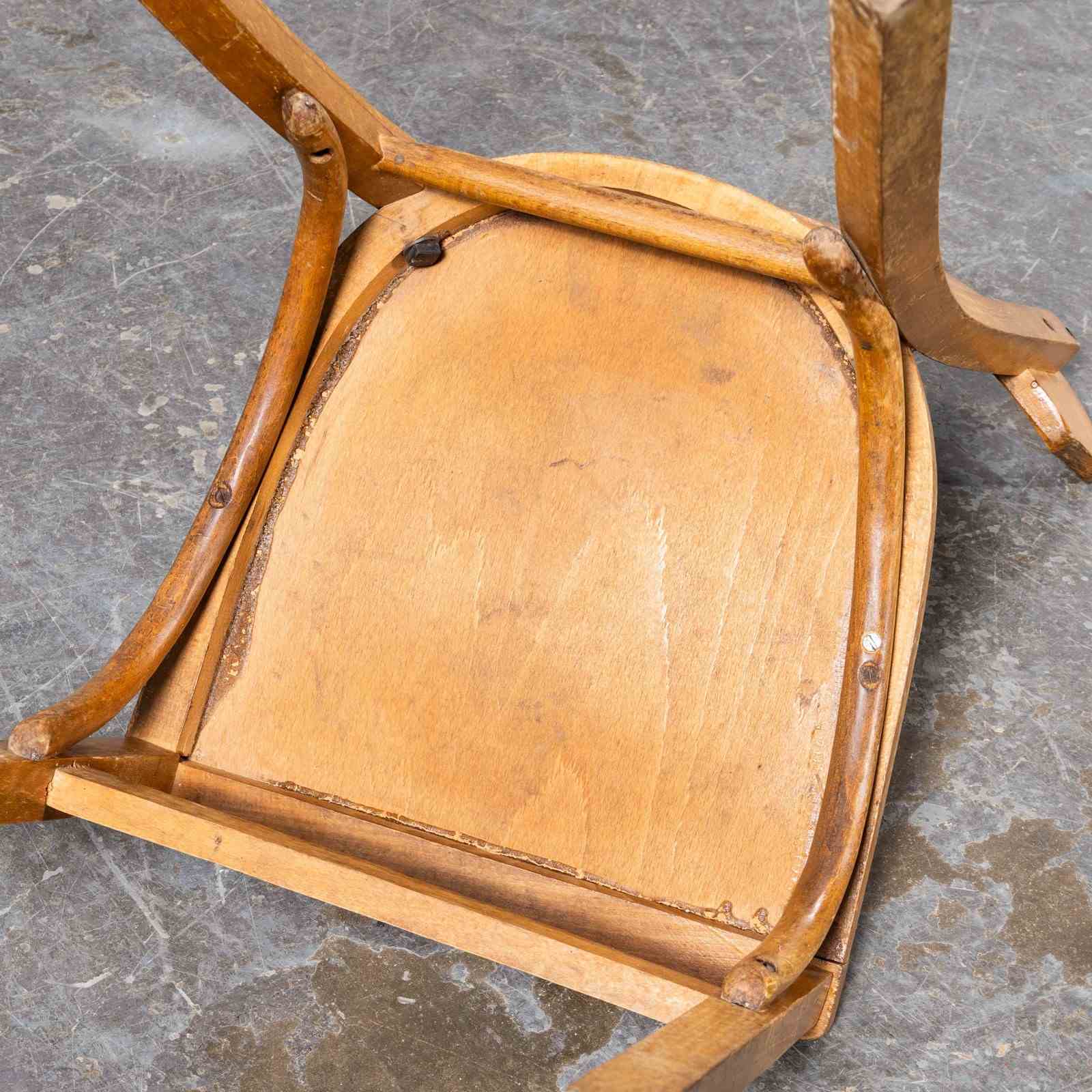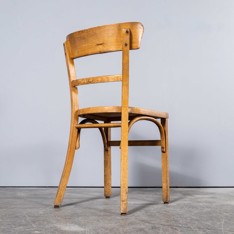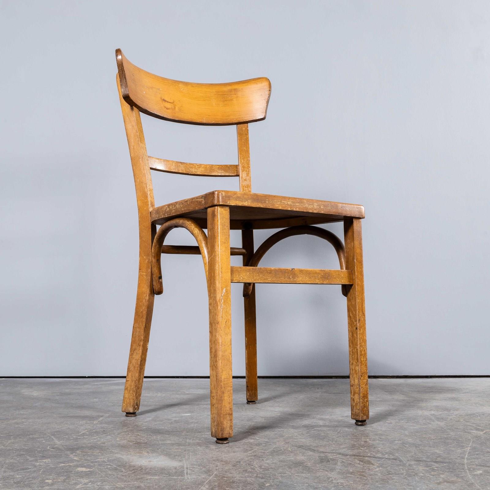 1950’s Standard Single Bar Back Farmhouse French Mixed Dining Chairs – Good Quantities Available. This listing is for what we call a ‘standard shape’ of single bar farmhouse dining chairs. Good quantities available, the chairs will always have a simple single bar back, a warm blonde colour and farmhouse in shape but there will be minor design differences in chair detail. The variation could be on leg shape, seat construction or another minor design difference. For all orders we will select a random mix of this farmhouse model. All chairs are original French bentwood chairs from the 1950’s and every chair has been serviced and rejuvenated in our own workshops. Perfect for the hospitality industry. Adult seat height minimum 45cm.